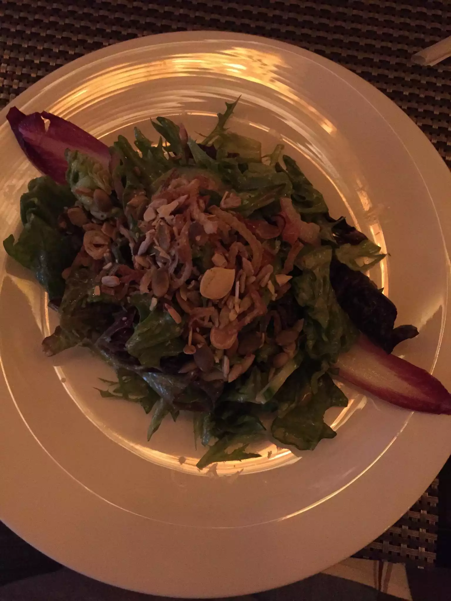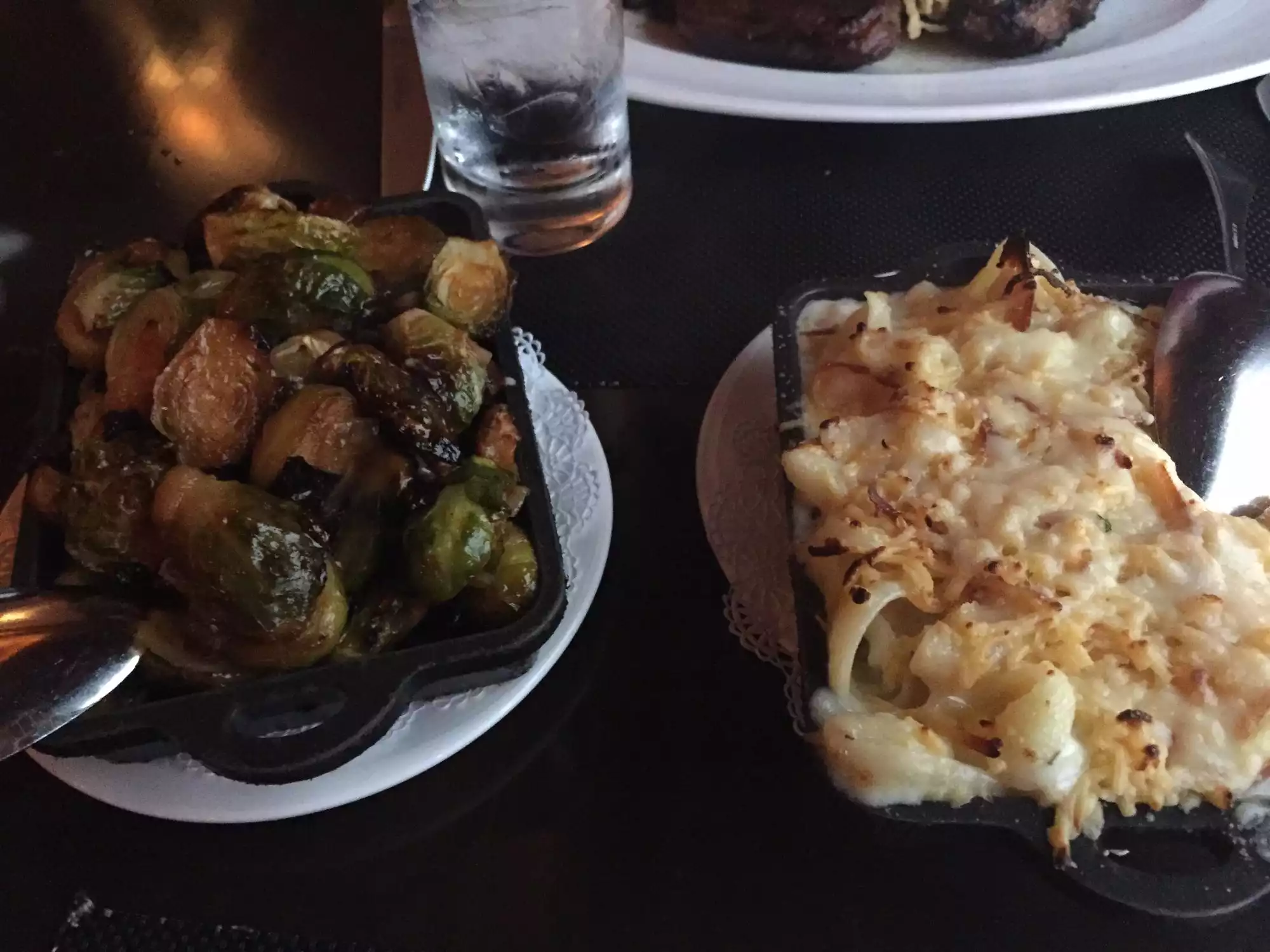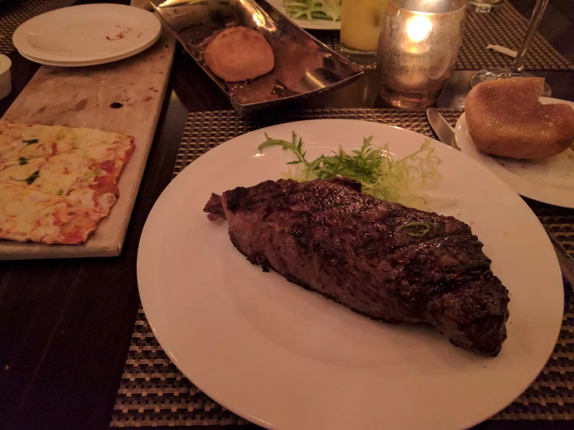 We had a very nice dinner with lots and lots of food. The only thing that I wouldn't order again was the roasted cauliflower. We both had beet salads and a 20 ounce delmonico steak (which was very tasty) and the cold seafood platter which was also very tasty. The waiter forgot to bring us bread but in retrospect thank goodness for that