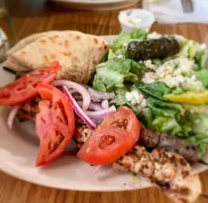My friend and I had the souvlaki plate, one beef and one chicken, and both were delicious, well seasoned and tender and you get two skewers. It comes with a Greek salad and pita and don't miss the taziki. At about $15 I think this is a reasonable price for skewers of all meat with no filler vegetables. They have wine and beer as well. The place is decorated nicely with flowering vines painted around the large windows and blue checked table cloths make it welcoming and cozy, plus there are black wrought iron table and chairs outside under blue umbrellas. A nice place for a casual meal.