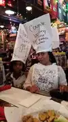 Don't come here if you are a stick in the mud! Lots of joking and interacting with the patrons goes on with the staff, yet they are very professional and efficient. We had the ribs and wings - both excellent. Great place to sit back and blow off steam! Good luck with your hat! (Go ahead and wear it and have fun!)