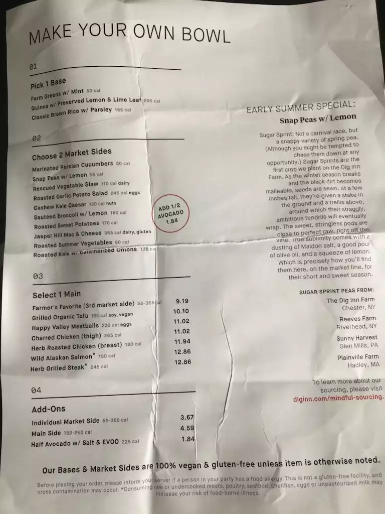 Walking around 8th and 51st I kept on seeing people walking around with a to-go bowl, so many that I finally asked someone where they got the bowl, and Dig Inn was the answer. So off I went about one block to find the location on 8th ave. No knowing what to expect I was surprise to see the long line of people waiting to get their order, maybe I should not have been after seeing all the to-go orders walking around the area. I think Dig Inn is best explained as a Chipotle type place for organic farm to table food. Pick a base, protein and sides and have an amazing delicious bowl make for you as quick as can be, yes the long line moved very fast. I ordered a bowl with brown rice as the base, snap peas and roasted veggies as the sides and roasted chicken breast as the main, no add-ons. It tasted as was as good as it looked!! Fresh, flavorful, well constructed. After eating this bowl I understood all the people I saw walking with the bowls back to work. Staff was very nice and explained to the newbie(me) about ordering and answered questions I had about my selections. I was happy to see that Dig Inn is opening a new locations in the upper west side, close to where I stay while visiting NYC so the next time I am in town for sure that is where I will be going to a great lunch.