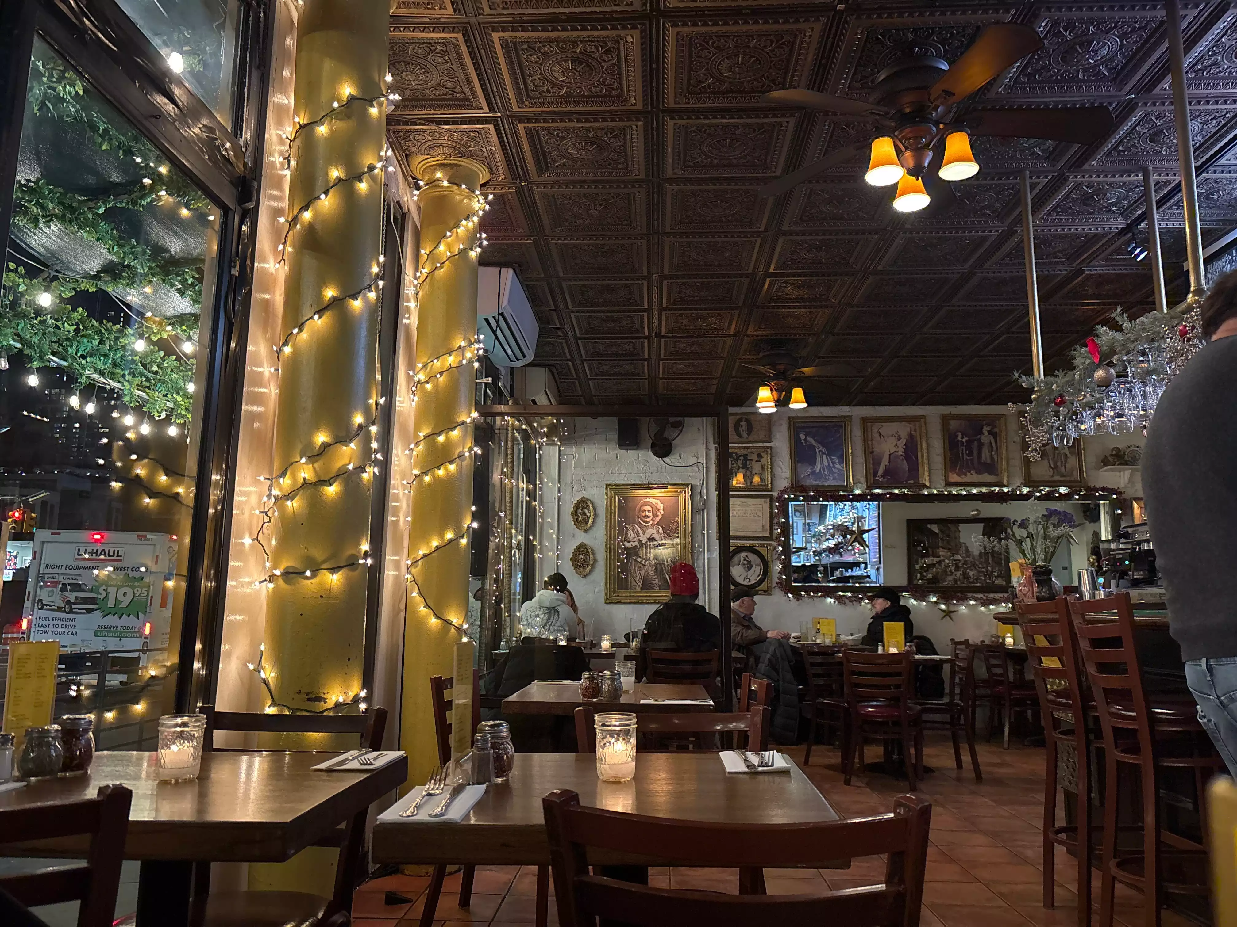 We found this restaurant in Chelsea walking around, the atmosphere is beautiful, with italian traditional (awful) music that at the end i must admit is relaxing... Prices are high, but we ate only a large pizza margherita (19 $) so we are in 2 adults and 1 child. Pizza was of medium quality but alright. Service was very kind. In.general a good evening.