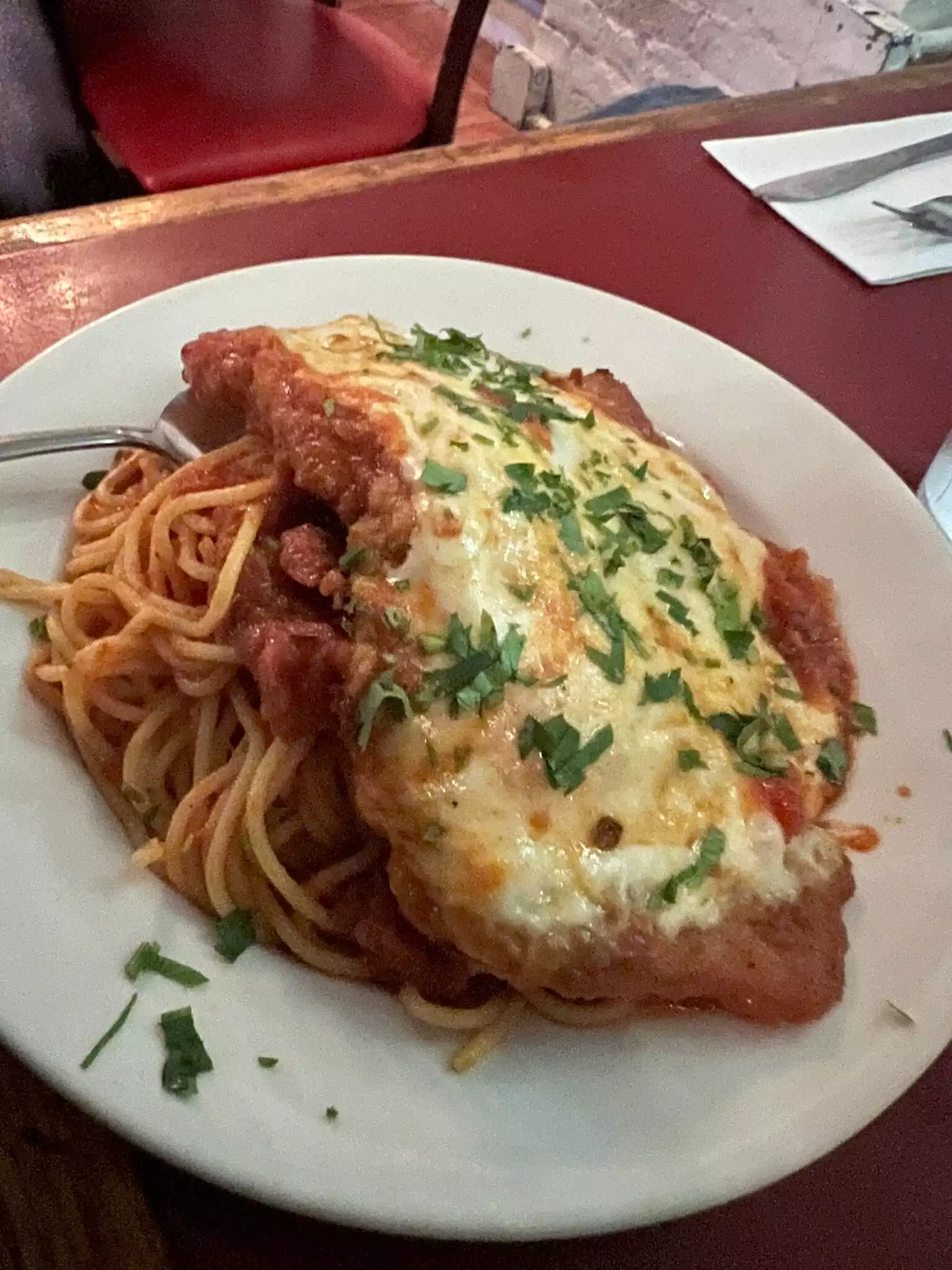I would really recommend coming here!! The service was fantastic, our lovely waitress, Pooja, was very insightful and helpful when it came to us asking specific questions about some dishes on the menu. We ended up trying the Spaghetti with meat sauce which was very seasoned and I ended up having the chicken parm sandwich which was truly delicious. I enjoyed the cheese and the texture from the meal. Overall, the food was reasonability priced and we felt very welcomed here. If you’re ever in the area, I would recommend coming down!
