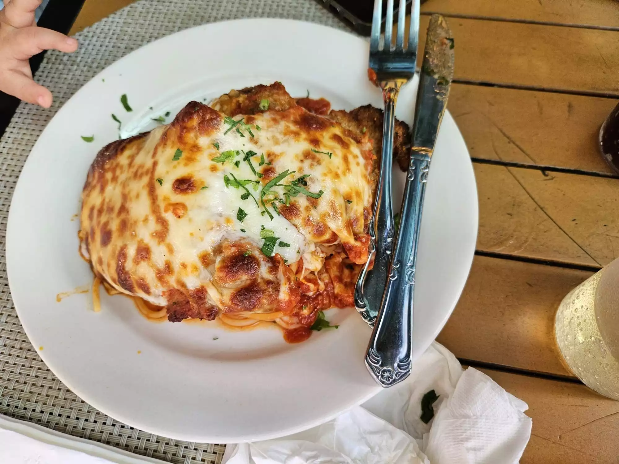 I had the chicken parm w penne, large serving, I couldnt finish it all but it as very good, smothered in melty mozzerella.