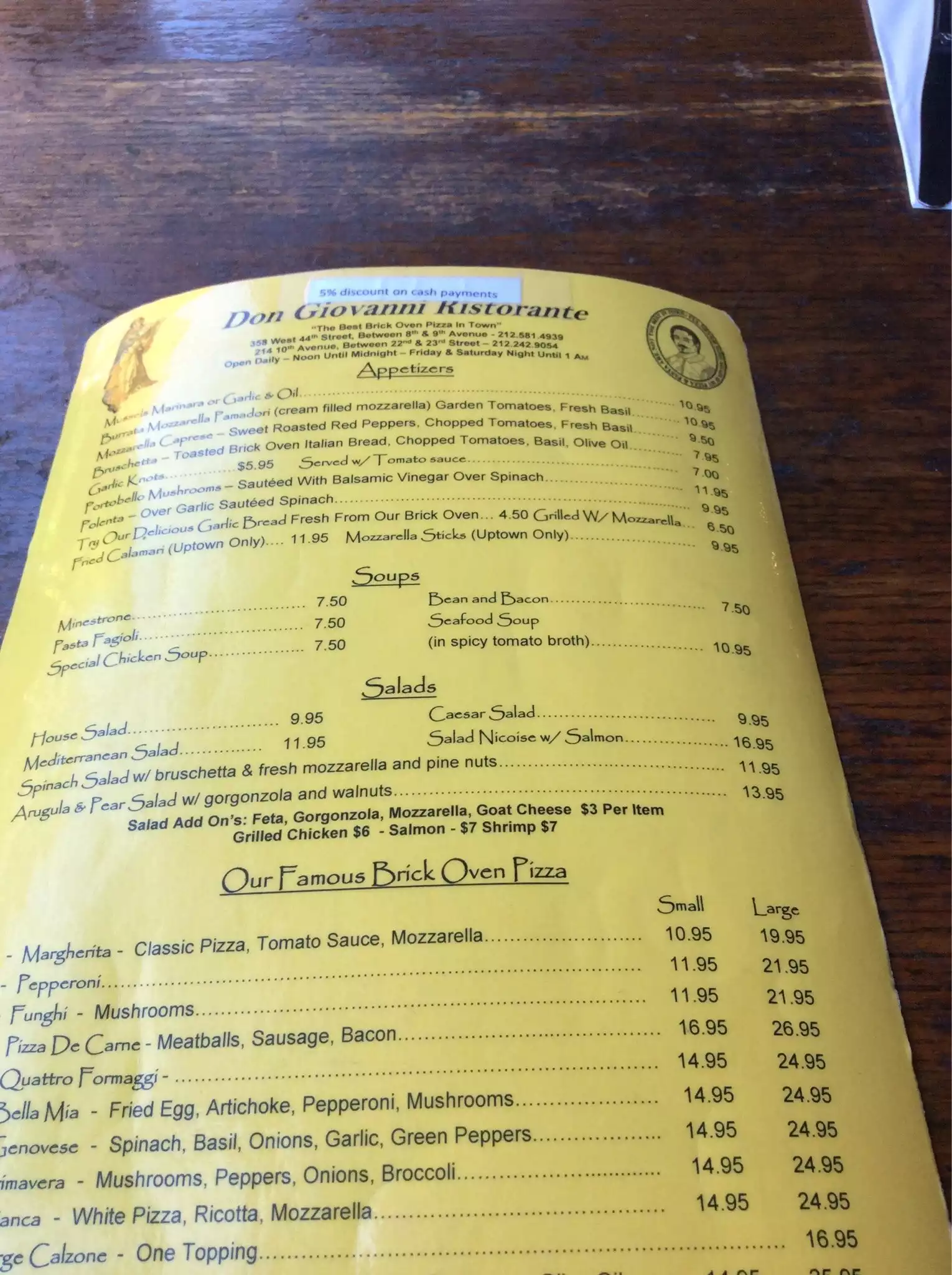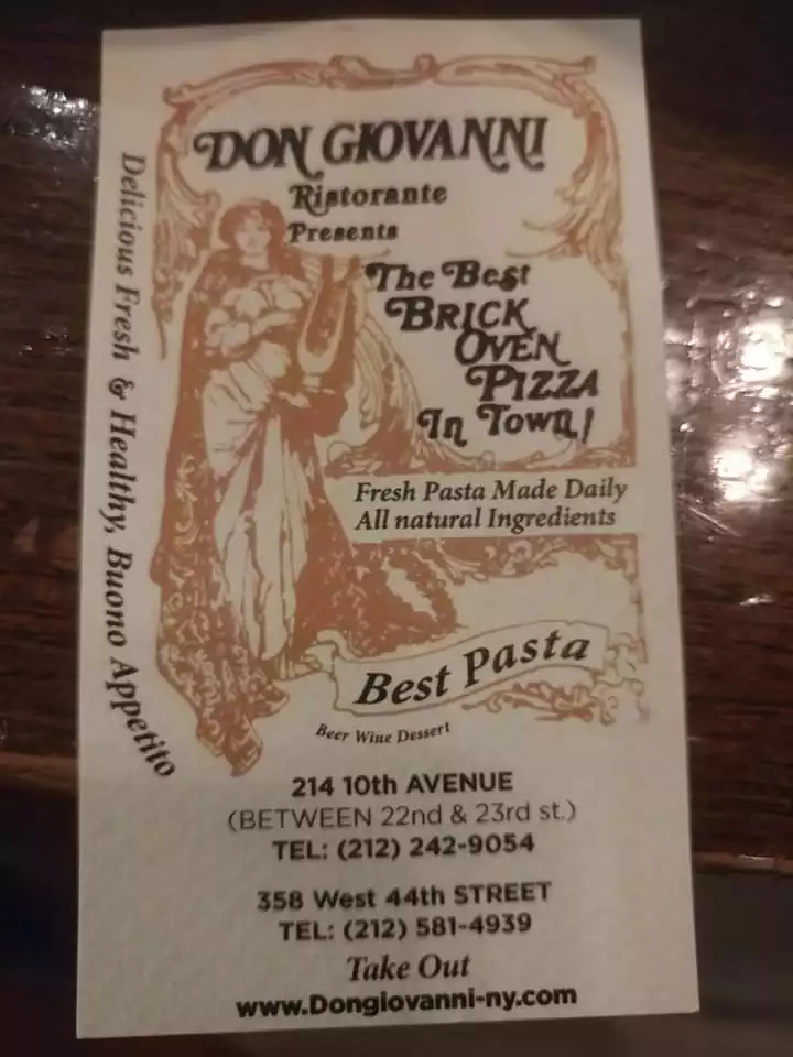 We were looking for a nice place for Saturday night dinner and found Don Giovanni's...outdoor tables full so we sat inside...service was excellent and four or us shared a Caesar salad, baked ziti and their meat special pizza...plenty of food and everything was delicious!! Prices were very reasonable and we really enjoyed our experience here!! So if you are looking for a bite and you don't want a fancy, overpriced restaurant- this is a great option! On 10th Avenue right near the corner of 23rd street!