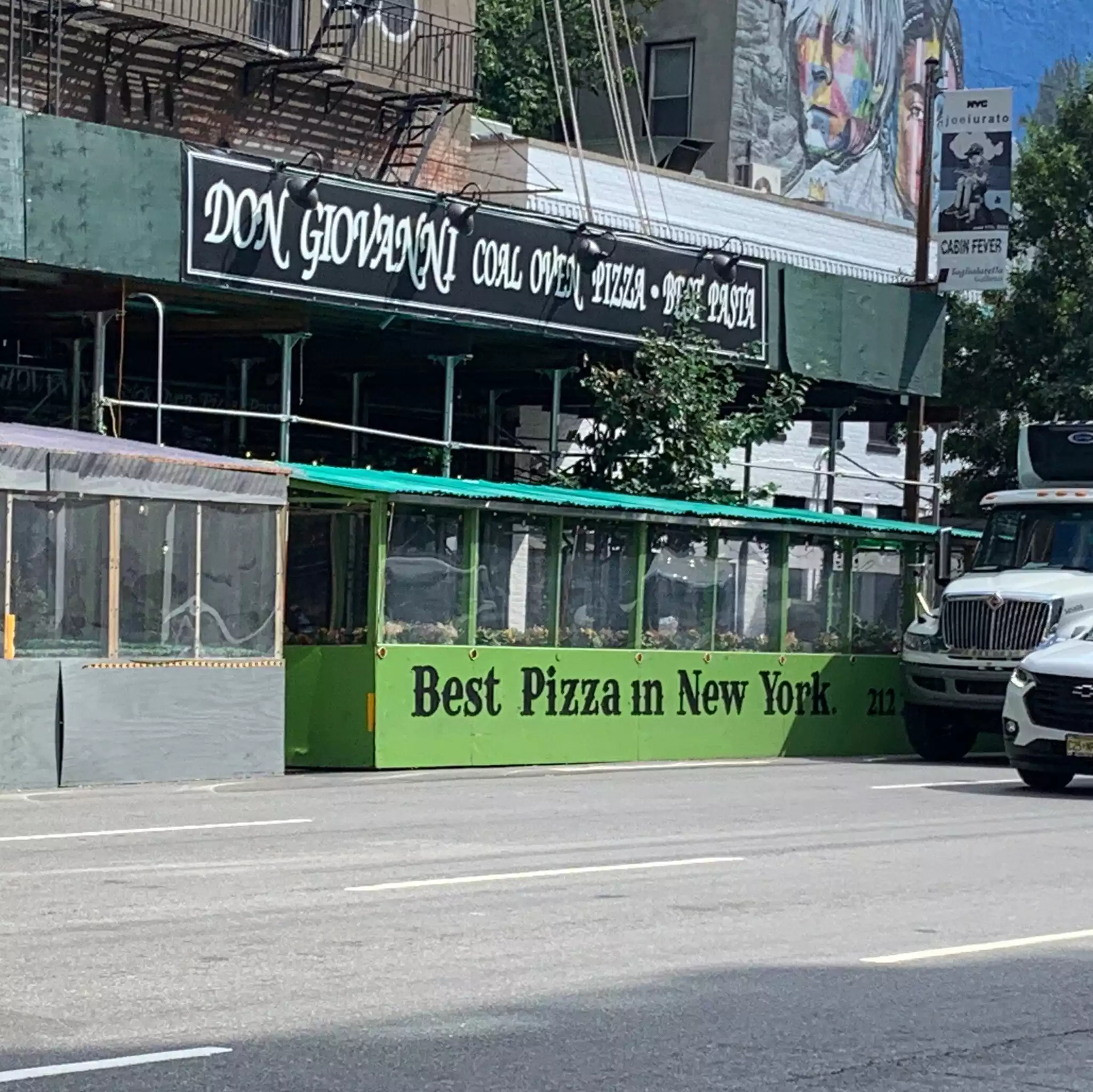 After a day enjoying some of the Chelsea art galleries, Don Giovanni looked like a good place to relax and refuel. We were seated inside near the kitchen, where we could see that the place is bustling, between onsite diners and delivery orders. Our beer and sangria and a basket of bread and butter arrived promptly, and we chatted with a nice couple at the next table while our food was prepared. Traditional pizza was thin crusted with a good tomato sauce, and al dente fettuccine primavera with cream sauce was delicious. Side salads were not included. The sangria was good, served in a small wineglass. Prices were very reasonable, and I would recommend Don Giovanni.