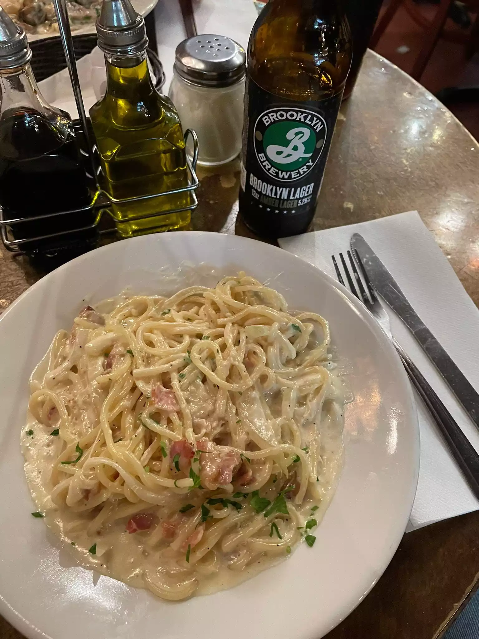 The pesto linguine was great, recommended by our server Janine. Great for dinner before a show at the McKittrick Hotel