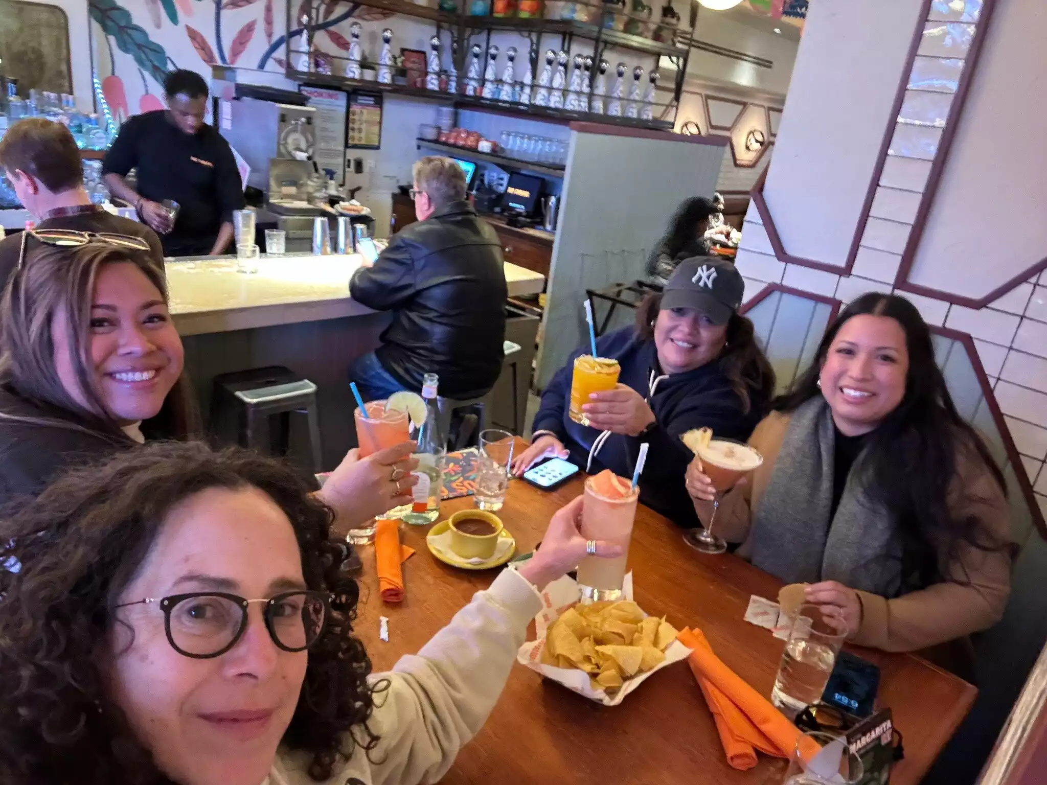 Everyone enjoyed their food! We started with chips, guacamole, and salsa. Guacamole was fresh and tasty. I got the taco salad (pretty big just FYI) others got tacos and enchiladas. Our waitress, Sabil, was so friendly and attentive. As a group of friends who live/lived/or visit NYC often, we were skeptical about eating somewhere in Time Square, but we were happy with our choice. We went at 7pm on a Friday night and were seated right away. I also loved my spicy cucumber margarita!