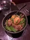 We visited on a small family trip to Chicago, the atmosphere is fun and cool and dark. The neighborhood is super busy so you mostly have to either walk in or get dropped off nearby. I was visiting with some family and friends and I'll be honest and say I'm not the most adventurous eater. I had looked at the menu before, and I didn't want to eat hearts or livers. I had resigned myself to eating GOAT since that's one of the main things on their menu. SIGH. I decided I could do that. So anyway I told my dining companions... maybe no hearts or livers? and we still found SO MUCH GOOD FOOD. Every single dish they brought to us was brilliant and delicous, even the goat. But the very very best thing, was the duck egg fried rice. You don't even know fried rice until you've had this. It's spoiled every single ever fried rice for me.