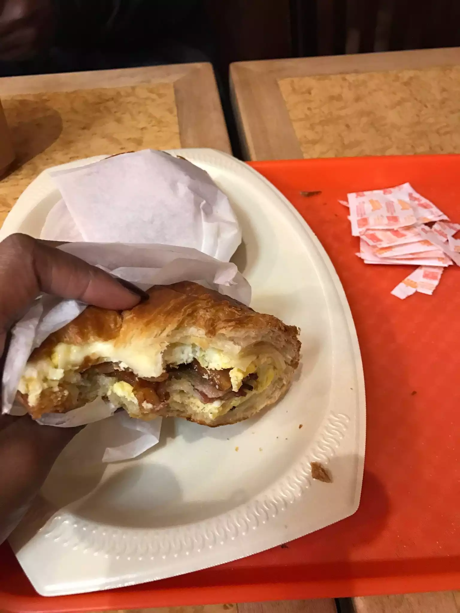 There is a line to order and you get to watch the employees cook your order while you watch and then move down the line to get coffee etc. What a great team they made, working together in very quick succession to prepare many, many orders. My husband had a breakfast sandwich while I had eggs (perfectly cooked over easy). The portions were huge. Seating is communal with plastic silverware.