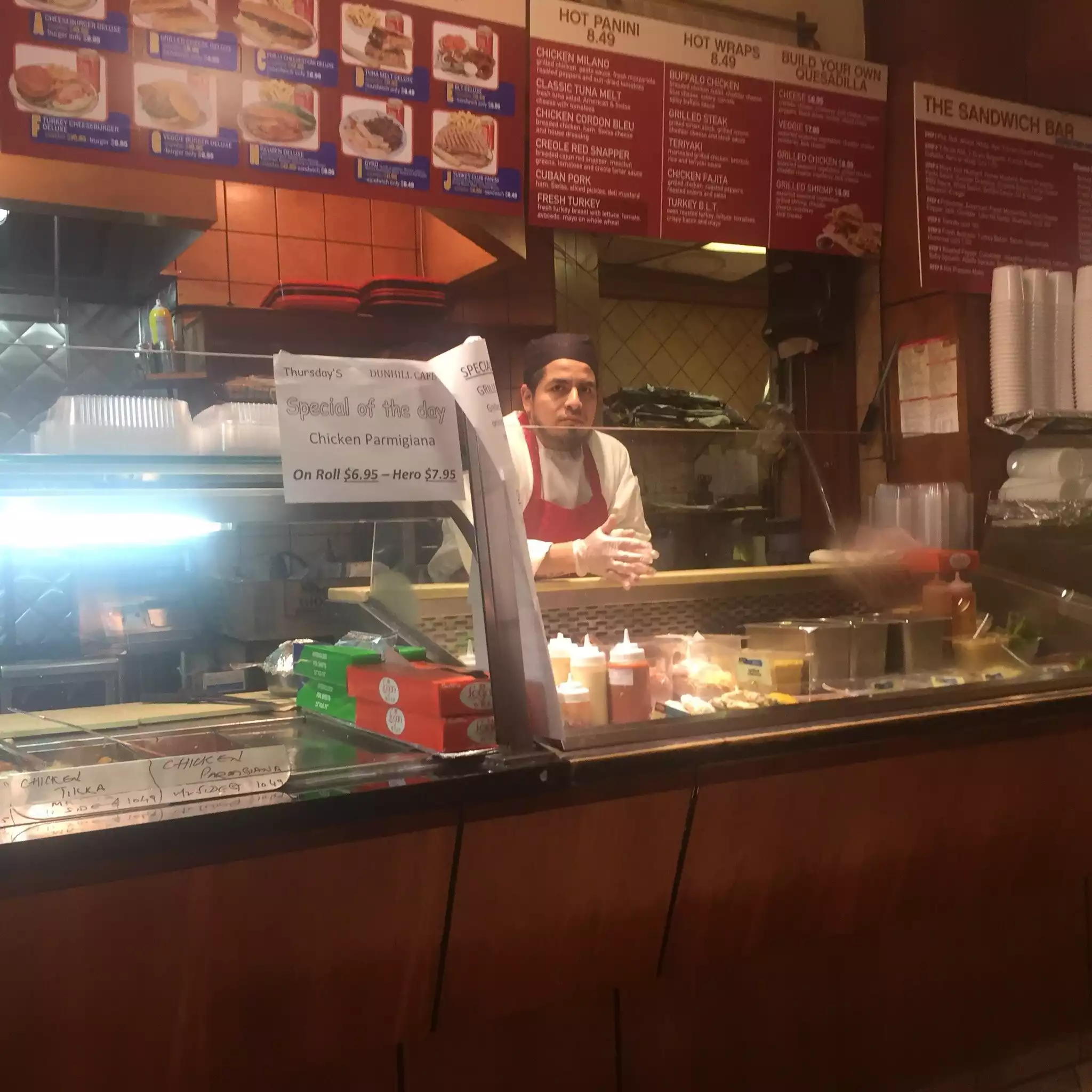 I've been working in midtown on and off for over 20 years. Dunhill Cafe is a consistent place that is basically a stop-and-go deli for business people working in the neighborhood. During the week you will see people in suites ordering everything from tasty sandwiches, soups, salads and desserts to take back to their offices. They also have a hot buffet which is a great bargain. For about $10 to $12 dollars you can get an entree such as chicken, beef stew and broiled salmon plus two choice of side dishes: rice, mashed potatoes, roasted or steamed vegetables, etc. This is what tend to choose as the portions are enough for two meals. There is seating available which leads to my statement of it being quirky. While most of the patrons are there for take-out, you will often find the characters who work the streets of Times Square for pictures with tourists: The Incredible Hulk, Mikey and Minnie Mouse, Batman, Spiderman, etc. They are usually having a lunch break in the dining area and often only in partial costume. The food is very good, service is quick and character patrons are amusing.