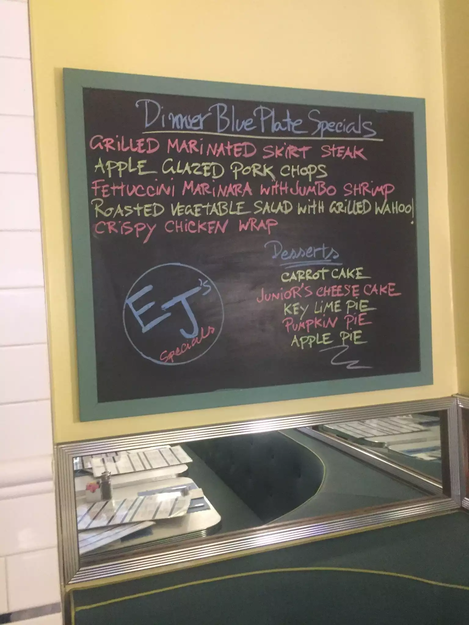 EJ's is a good basic diner. The air is slightly greasy depending on what they are cooking up, The decor is good diner feeling decor, and the food is diner food. Great milkshakes served in tall glass plus they bring you the metal tumbler as well. If you are looking for gourmet food, this is not it. It is a DINER. Staff is very friendly and accommodating. You just have to tell them things like if you want your apple pie not stone cold from the fridge, you just have to tell them to please take it back and warm it up. Quite a few locals eating at EJ's. Always comfortable, and welcoming, servers don't rush you. Not terribly cheap, but a good all around diner. Warning: The bathroom is in the basement down a steep flight of stairs. If you have trouble with stairs, go before you eat here!