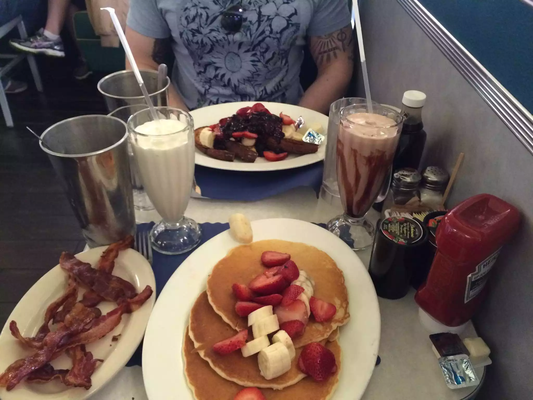With 2 growing sons we needed an excellent breakfast to kick start the day. And we weren't disappointed. Excellent huge pancakes, waffles, sides of bacon, fruit on top. Or if eggs is your thing all options are available and the breakfast sampler was a great US equivalent of the Full English... Add to that free coffee refills and what's not to like. The diner was clean and staff friendly, service was prompt. All good.
