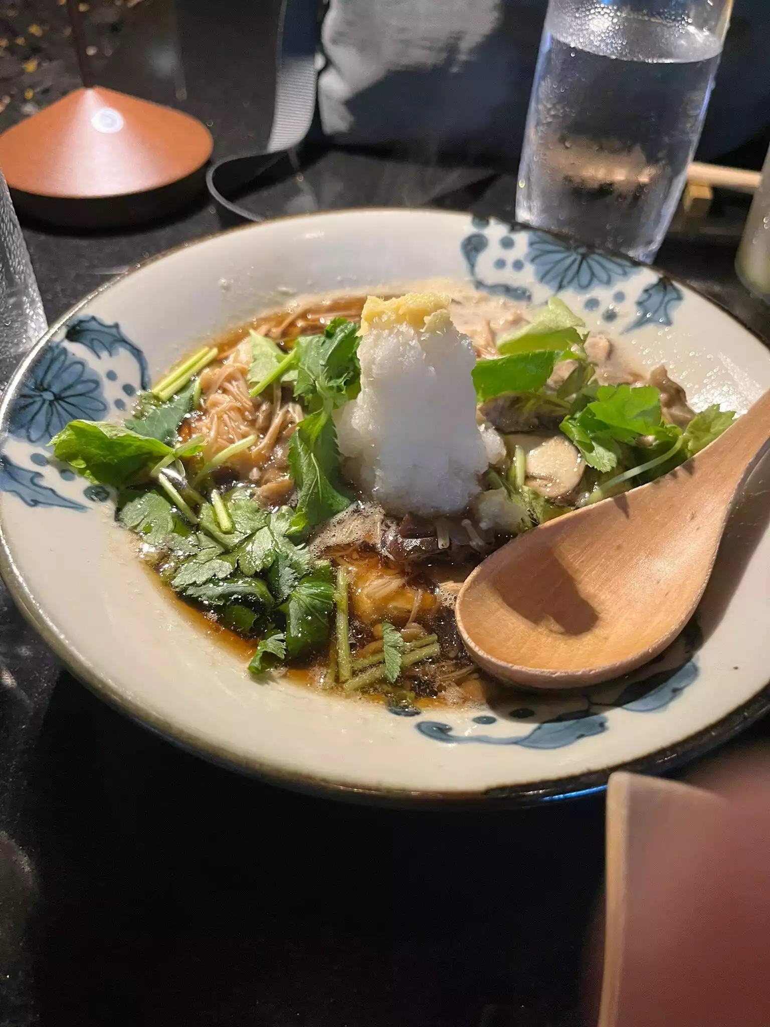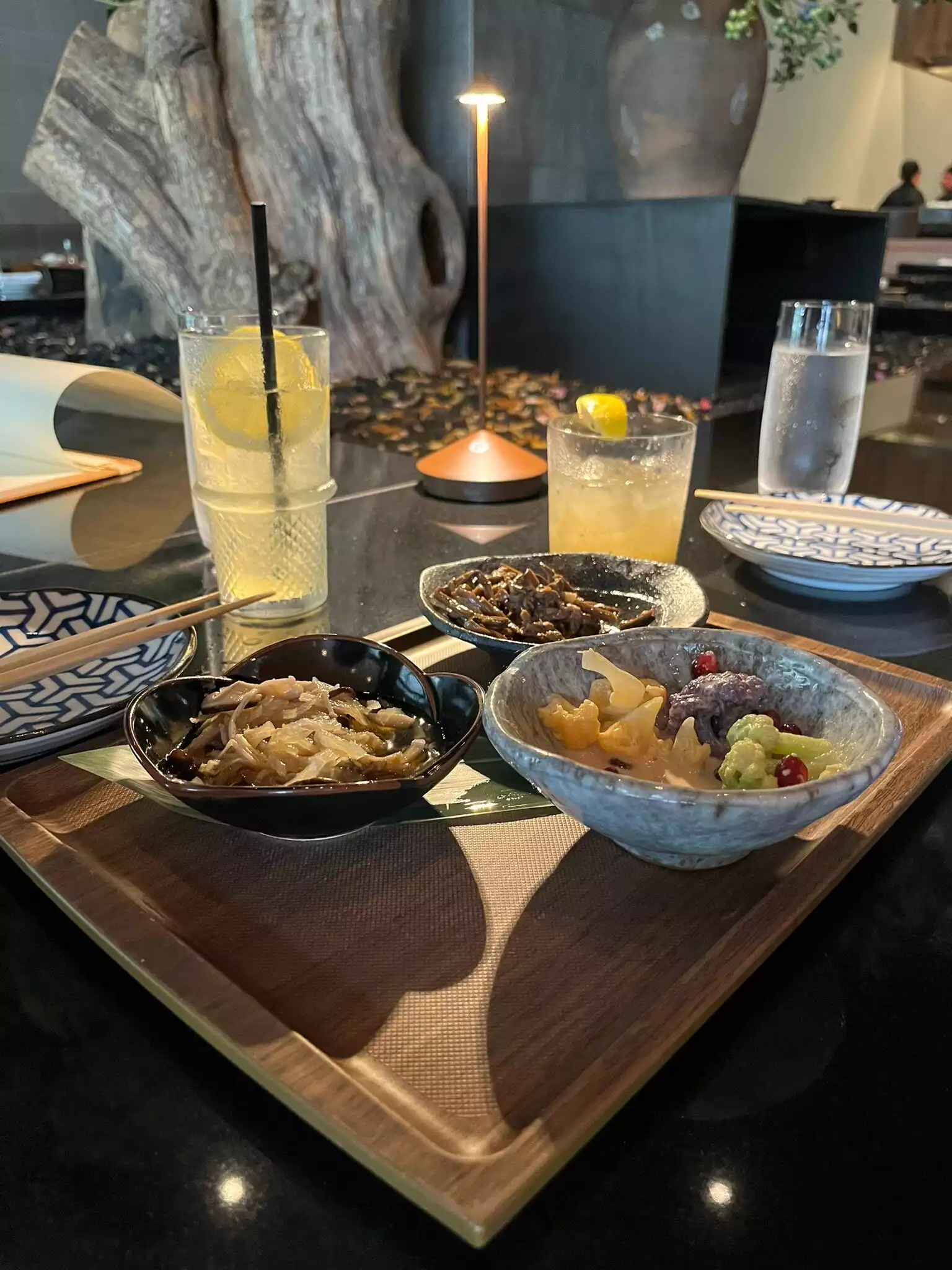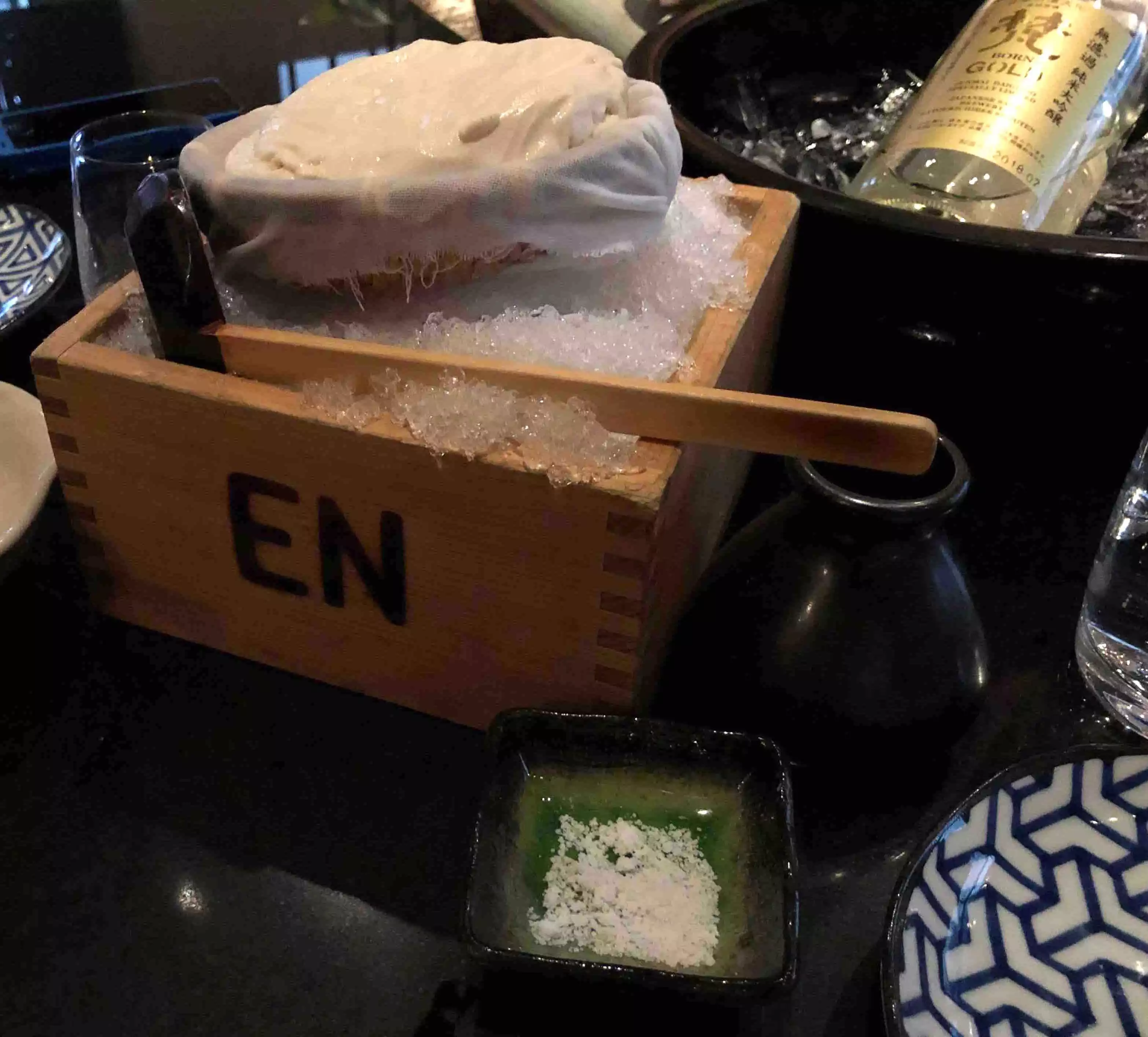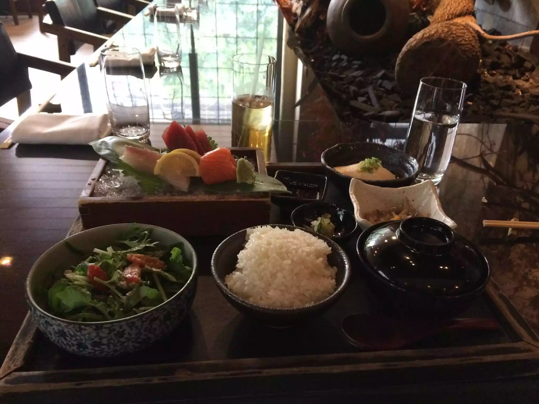 I wish I had taken more pictures as I was impressed with the layout of this sophisticated sexy restaurant housed in a previous furniture store. There were private rooms upstairs where one could be seated on a tatami mat. Downstairs was a bar area and 2 largish separate dining areas with a water feature. High ceilings, interesting woodwork and smart lighting added to the intrigue. There was, of course, an obligatory sushi bar. The presentation of the food was priceless down to the pottery, lacquerware, glass and wood. Many trips to Kappabashi in Tokyo must have been made for all the tableware used. The homemade tofu was unusually silky and the garlic fried rice was an unexpectedly tasty. The place works!
