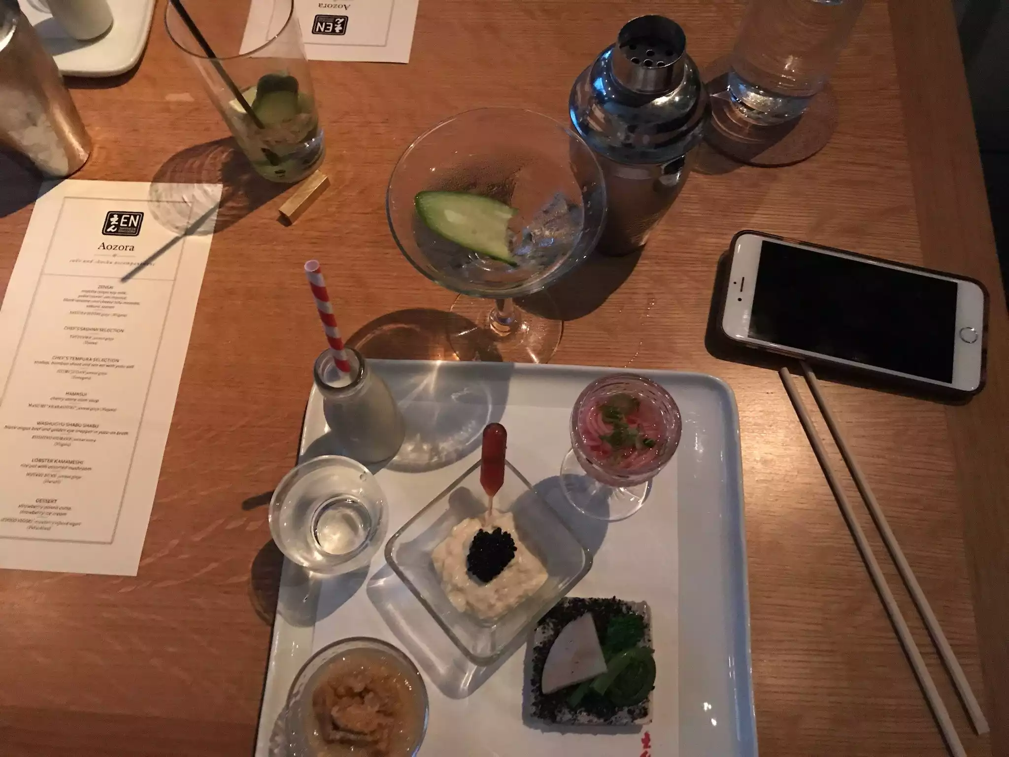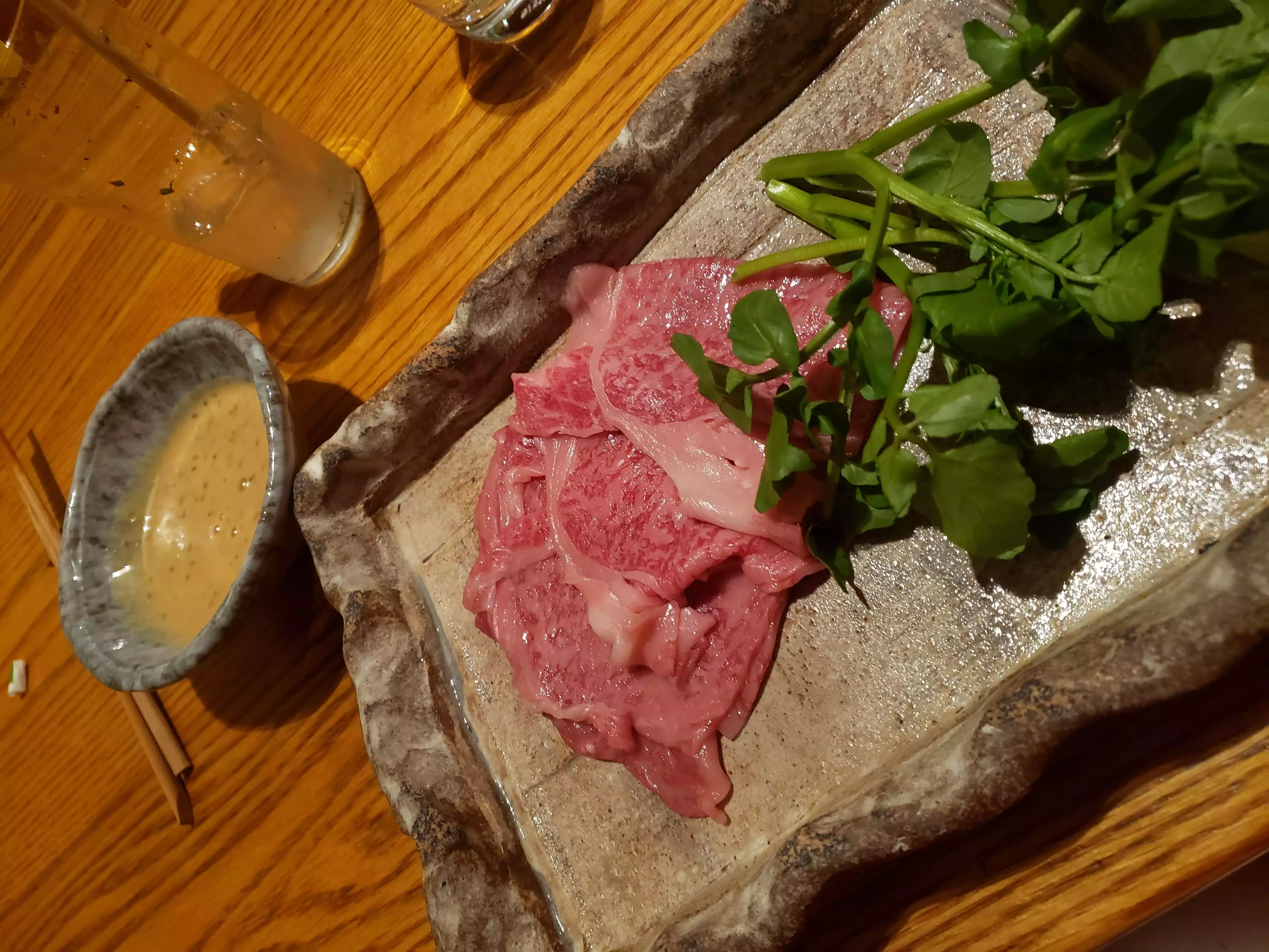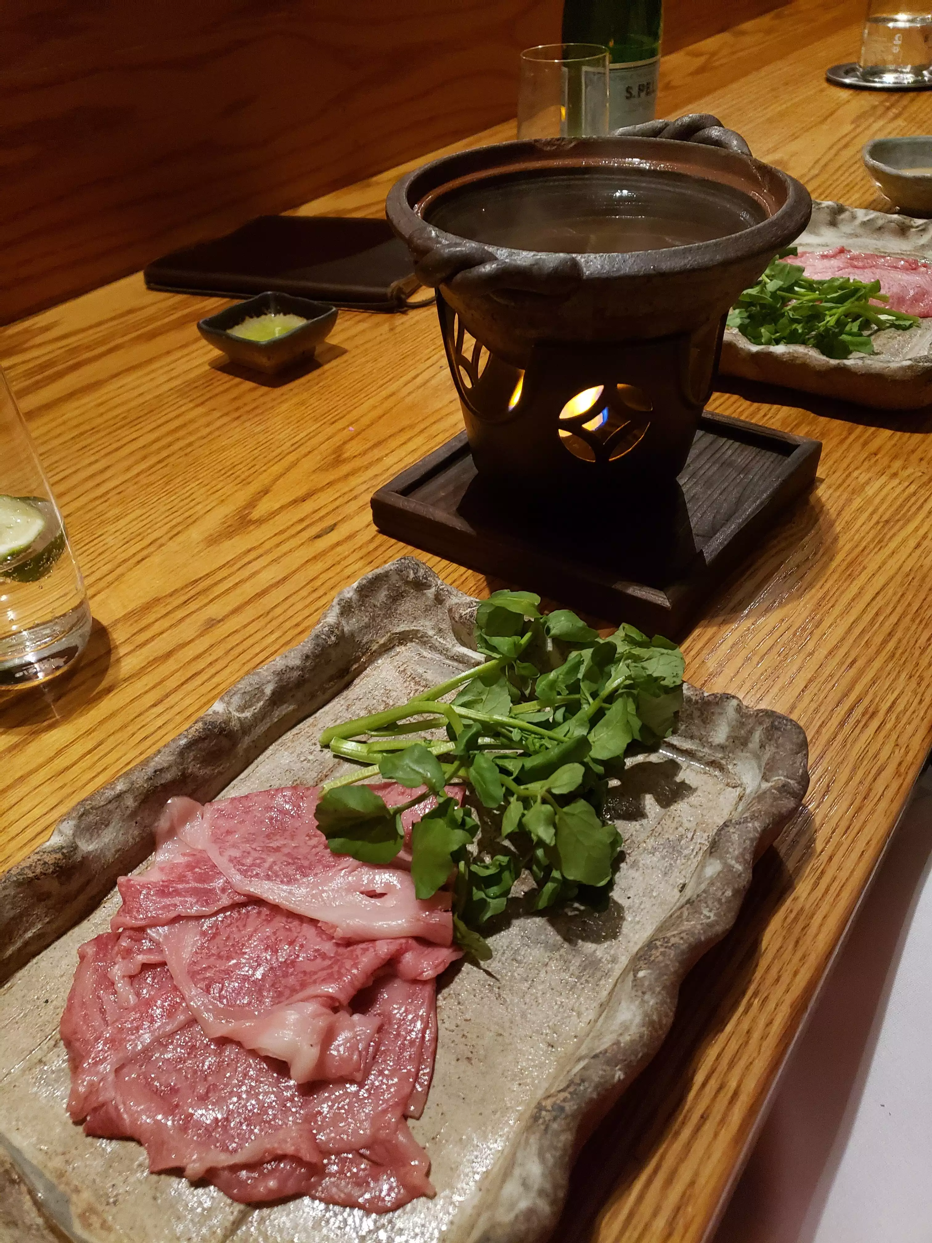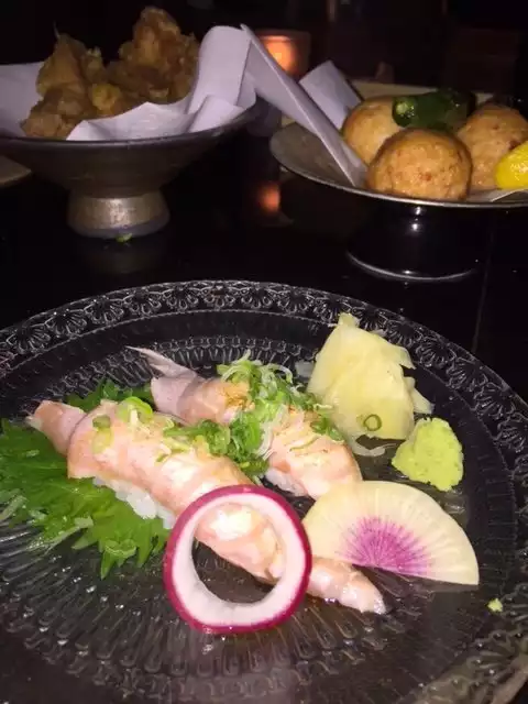 I went with two other friends. First of all, the restaurant is stunning, with the Japanese wood paneling, nice trendy bar and the food divine. I had the appetizer pork with veggies in a shabu dashi broth which is just divine. It was so large and enough as an entree. Friends had the sashimi which was the freshest. Dry sake to wash it all down. Dessert, the matcha tiramisu was the best.
