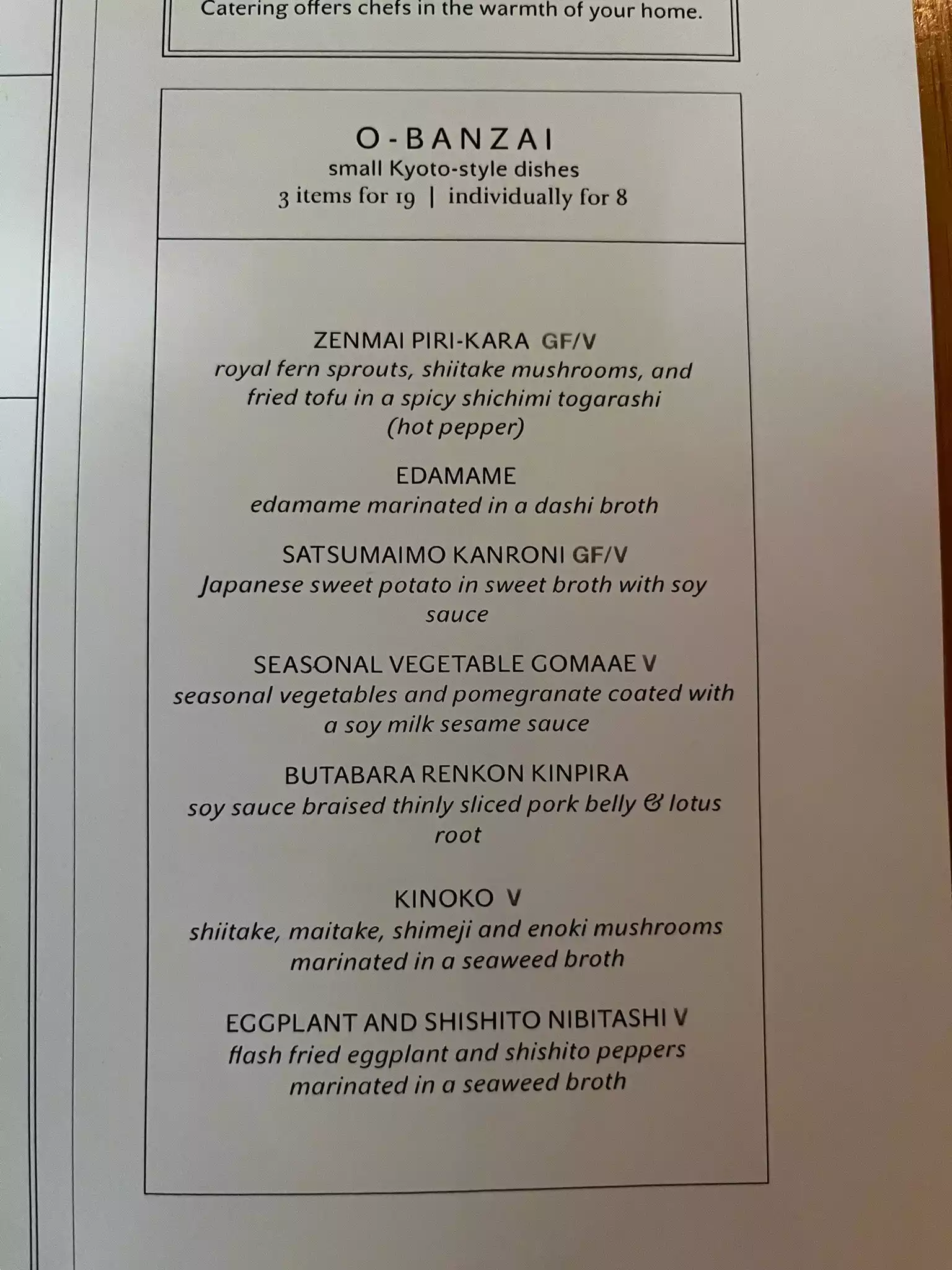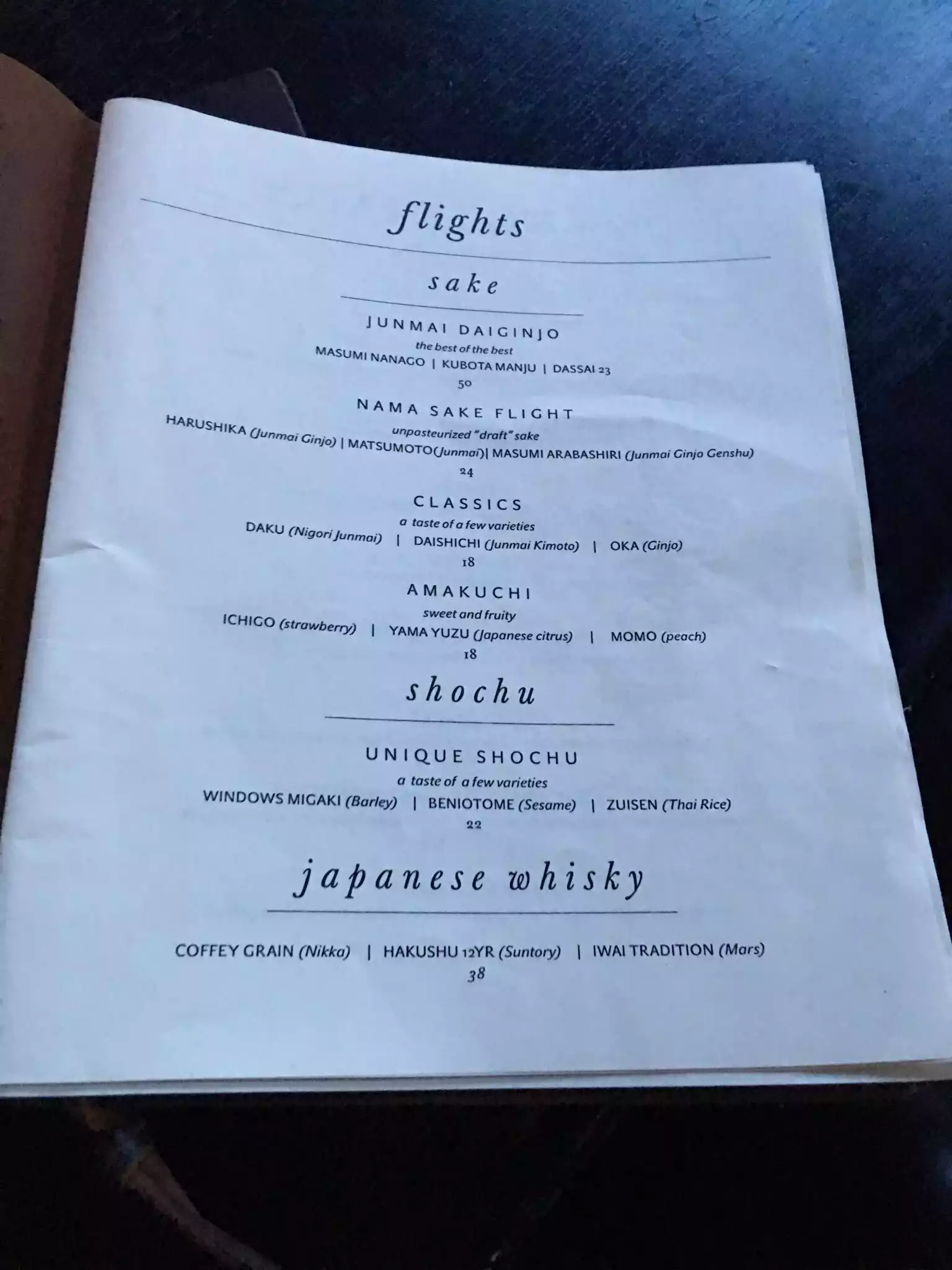 We enjoyed every single dish last night, the fresh tofu made hourly, the asari clams, the O-Banzai kyoto style appetizers, the Karei Age fried flounder with ponzu sauce. The desserts, too. Our very un usual shochu (a 25 percent alcohol spirit served on the rocks) was tasty but I would not especially recommend it. (Gyokuro) There are many many sakés to choose from. Service very professional and kind. We came at 630 thus we the first clients and everything was served very very fast, not necessary, but we understand. Very attractive decor. A few private rooms available. 500 for 6 people witgh the expensive bottle of shochu (74) tax and tip
