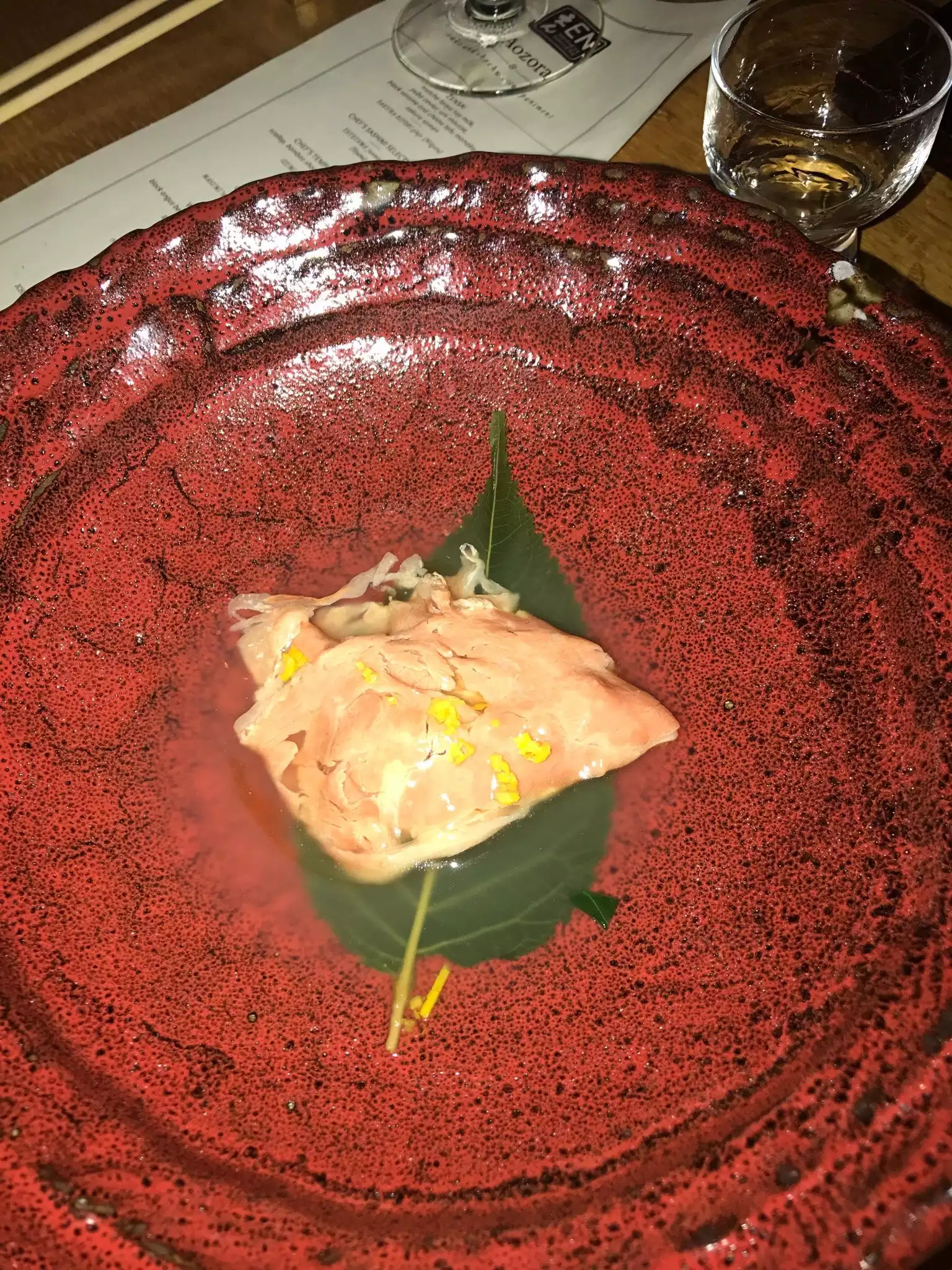 While it's not true of every restaurant in New York City, the Big Apple has more than its fair share of places that turn out superlative food as a matter of course. EN Japanese Bistro is one of those places. I was lucky enough to join two good friends at EN on a Saturday evening in August. The space is magnificent, very high ceilings and wonderful carvings in wood and the hospitality was generous and patient. While the restaurant offers dishes a la carte, but we went with the six course prix fixe menu and found it fantastic. First, it took a lot indecision and stress out of the meal to let the restaurant decide which dishes to showcase and in what order. Second, being on the prix fixe gave the meal a very relaxed and easy pace and, third, the prix fixe menu let us get up from the meal feeling satisfied but not stuffed. Now, the prix fixe is not inexpensive. Without alcohol it's $65 per person. And it takes time. We sat down at 8:45 and got up to leave at 11:30. But it was a memorable tour de force of delicious Japanese cuisine that we all felt glad we had the chance to have the experience.