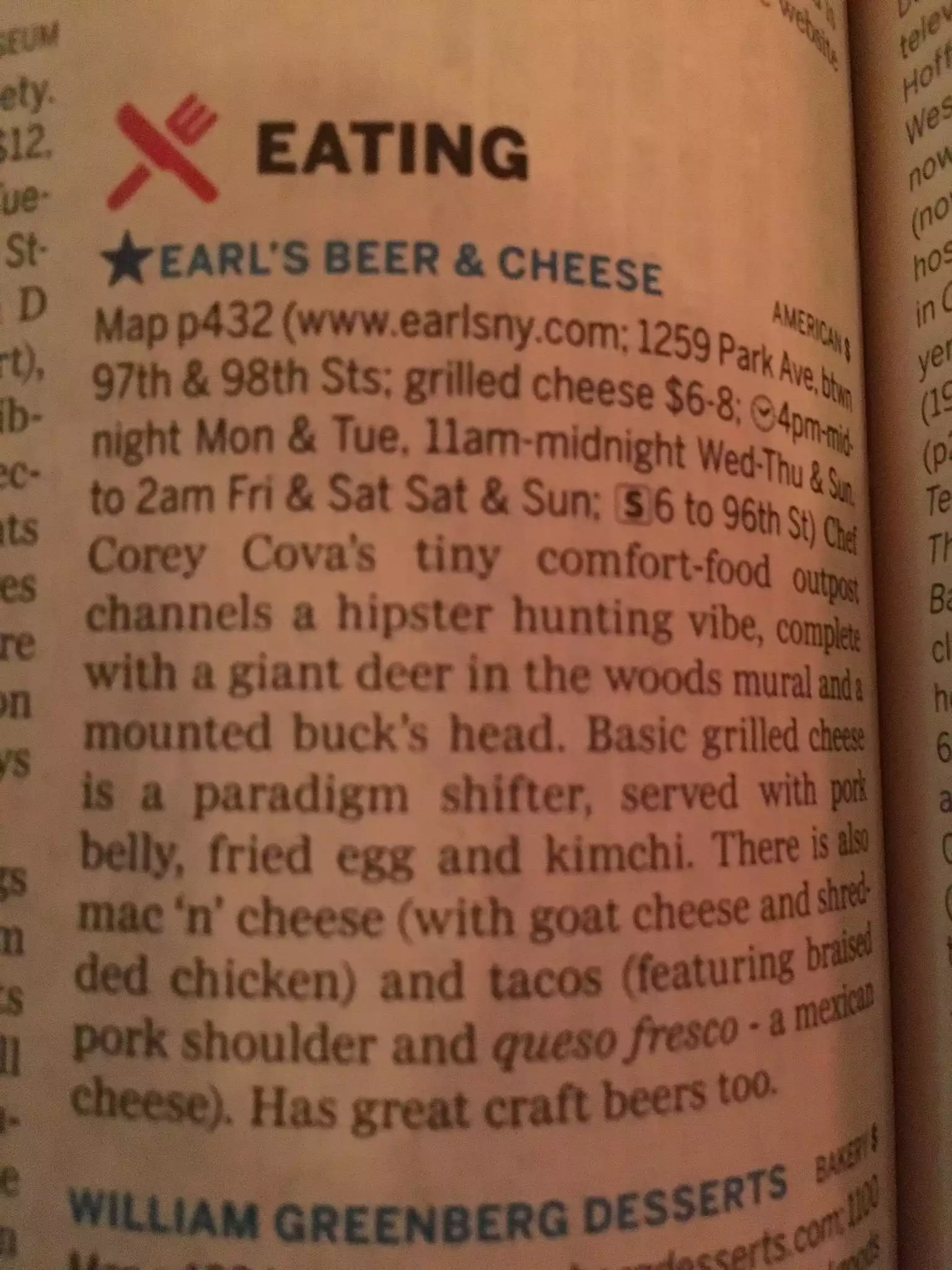 While touring around New York we stumbling upon Earl's Beer and Cheese. I will admit I was a little hesitant based on judging a book by the cover. I asked a patron coming out if their meal was good and she absolutely raved about it! The menu is small but the food was absolutely fantastic! You must try to the Beer and Cheese spread, it is to die for! It turned out that our server had an extra beer and cheese spread that he offered us at no charge! One taste and we ordered another because it is that good! Would highly recommend and will definitely be a repeat customer!