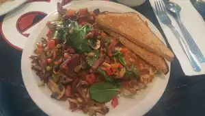 Love the vibe & food here. Yes, the waits are long on weekends but worth it. No wait today as mid-week. My extra-hot latte was just as ordered; black coffee later to top it off was tasty. First time trying the James Browns--a plate full of goodness! Hash browns covered with grilled onions, mushrooms, and other veggies plus choice of one meat or protein substitute. Plenty of my choice (bacon) mixed in with veggies. Toast accompanies the JBs but who has room for it? My friend's French toast was given a thumbs-up. Try seats at the counter or at a couple tables on the sidewalk.