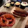 We ordered duck sausage on a pretzel bun and it was so unique and yummy. They did not have the signature big pretzel when we were there around 8 pm on Thursday night as it was sold out. The to go order area is on the street level and the dining area is downstairs and has a quaint river and bridge view. It's a charming casual beer garden. They also have all kinds of delicious pastries and iced coffee, and hot espresso drinks. Highly recommended. Craving for more !