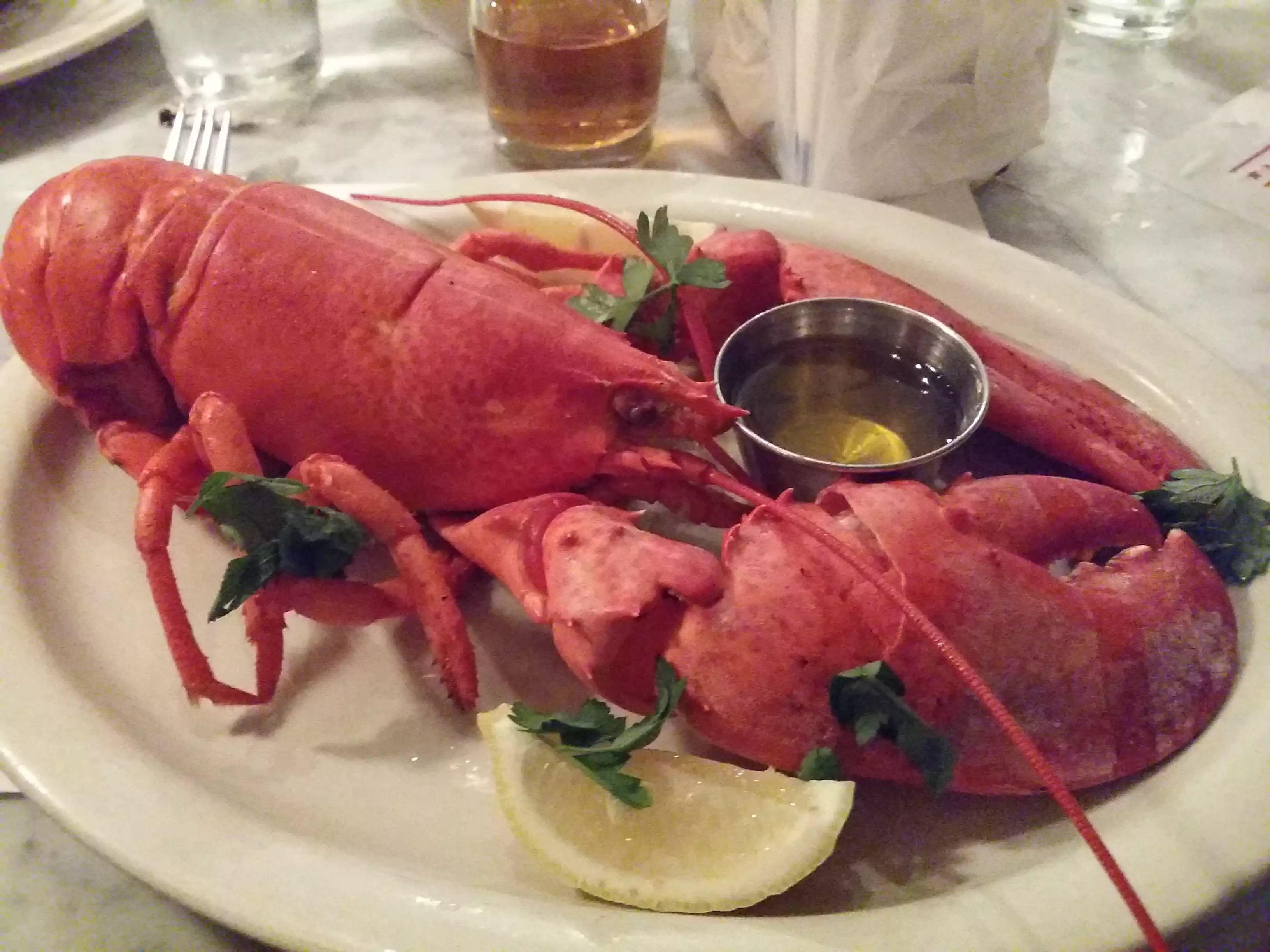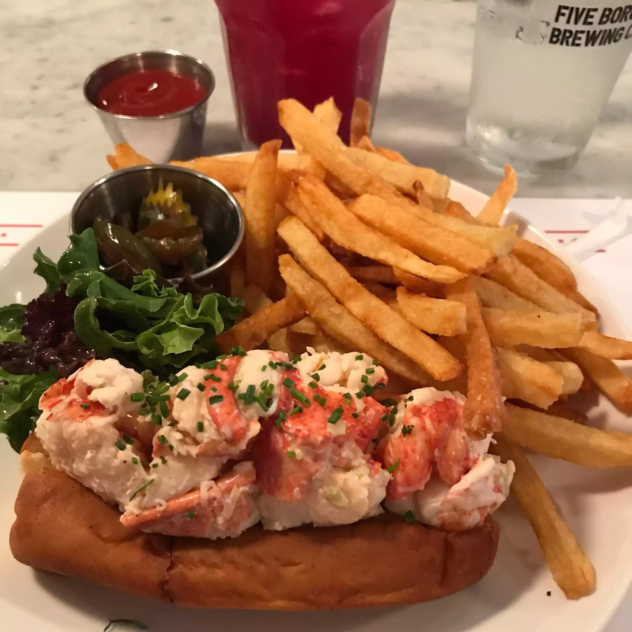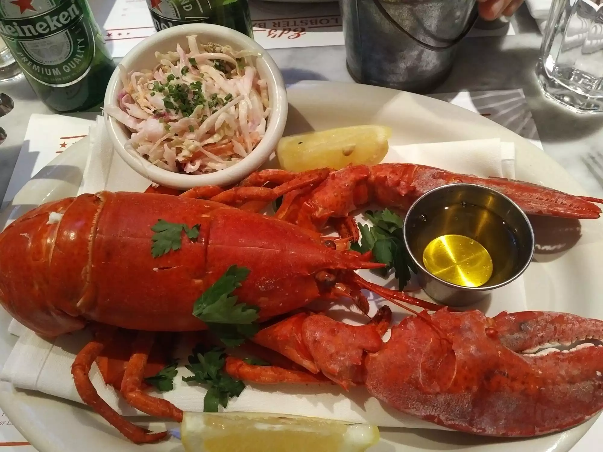 The steamed lobster was enormous and tasty. The iconic lobster roll was good but overpriced and really nothing special. Just a roll, a few pieces of lobster and fries for 34 usd. The chili marguerita was the winner of the evening.