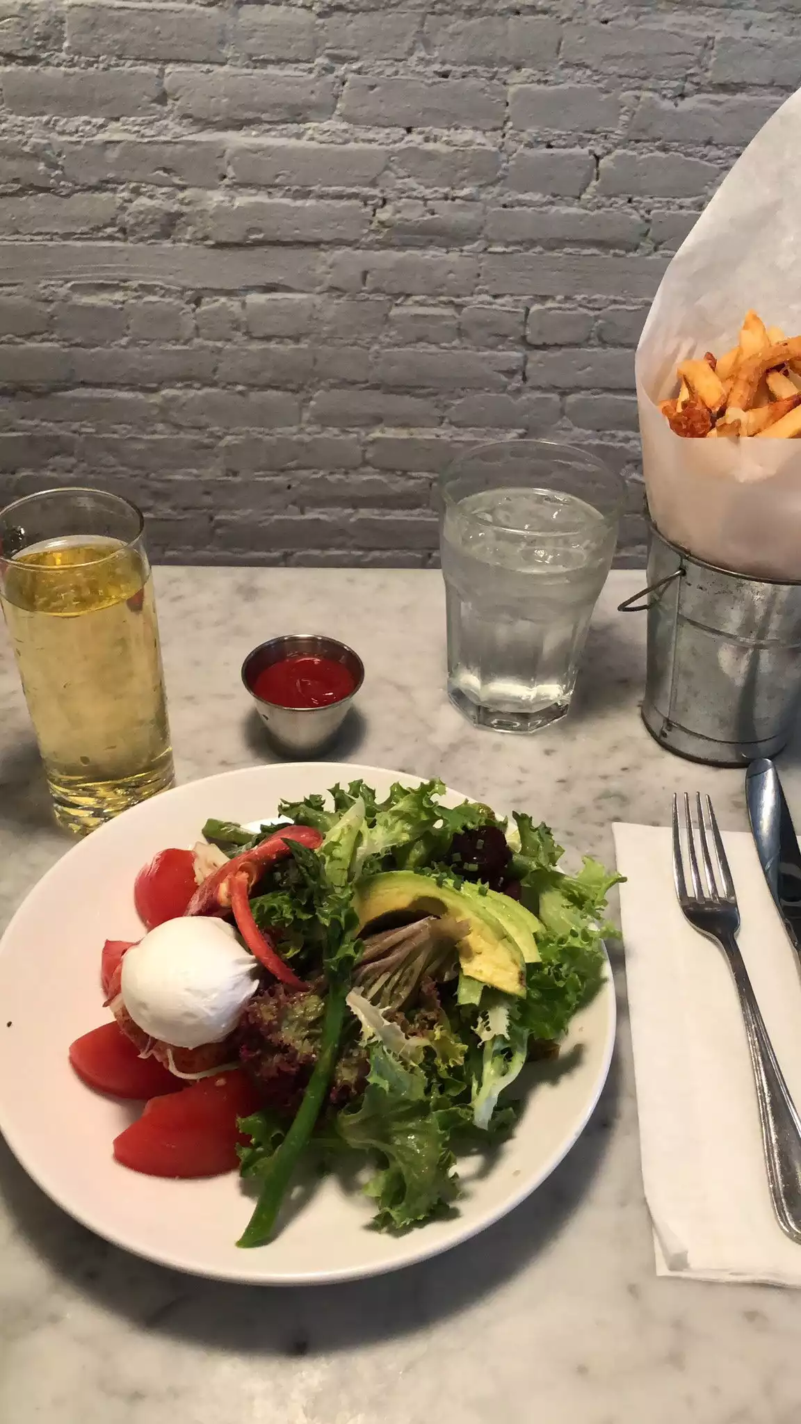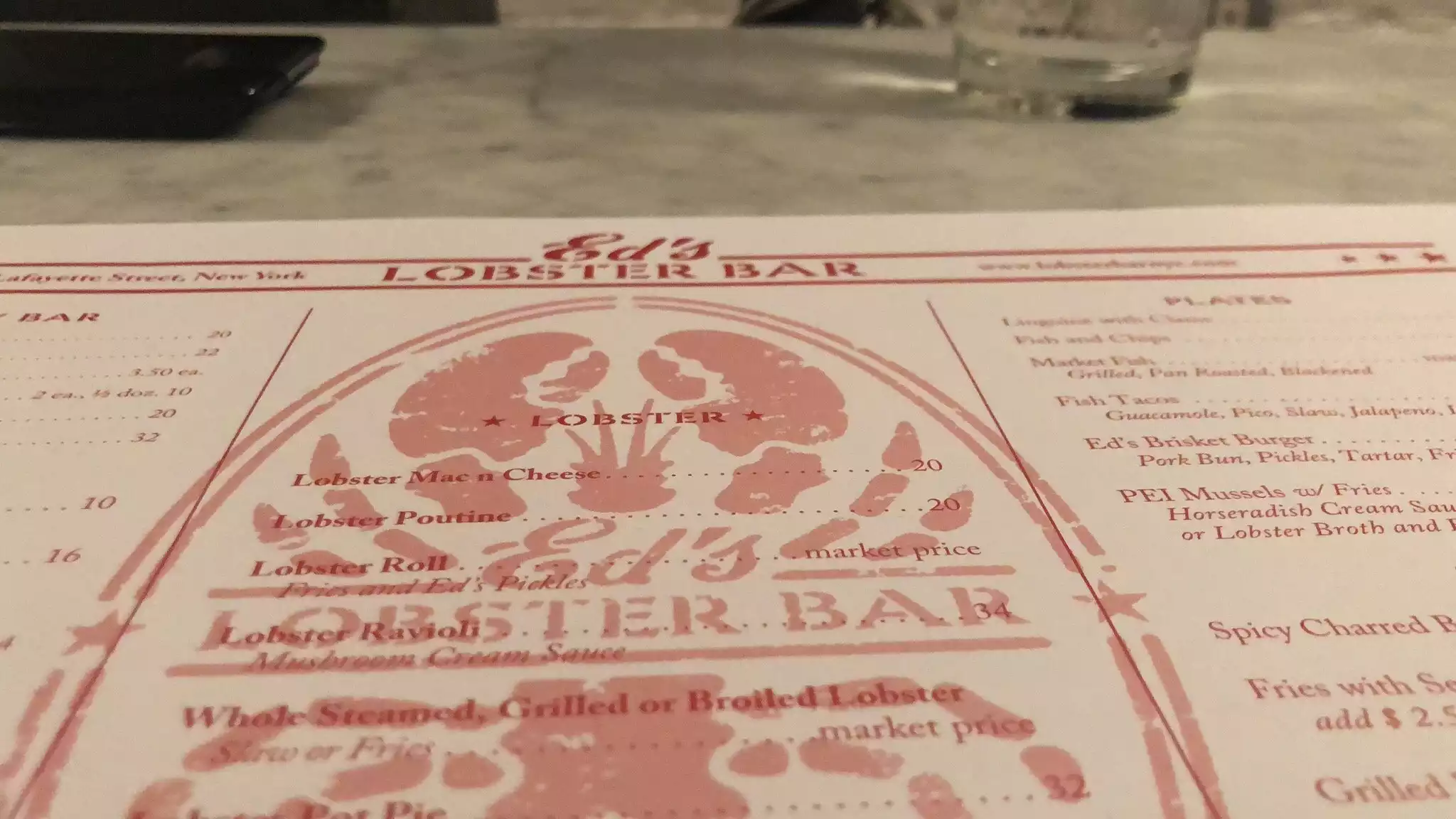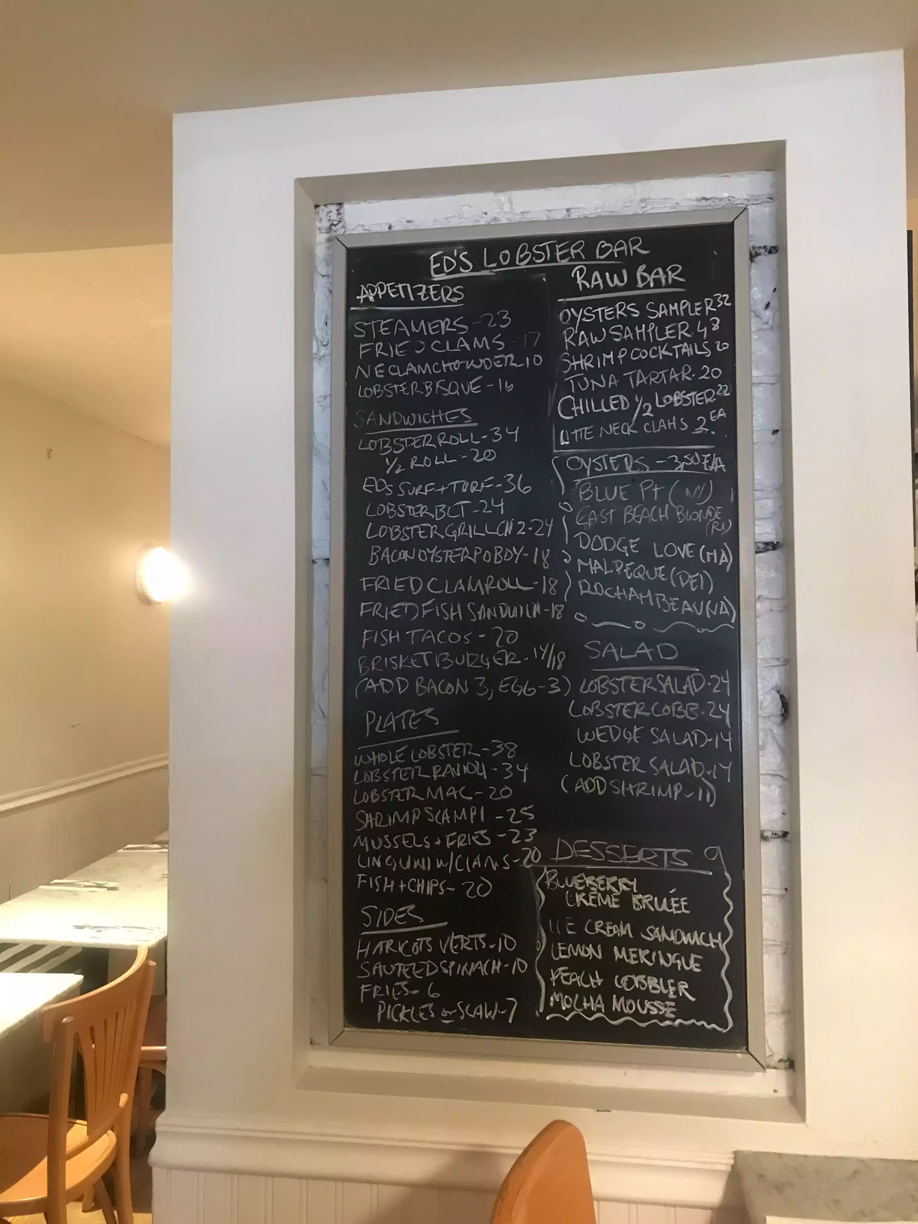 Ed's Lobster Bar is a long, narrow space with white brick walls and a huge chalkboard with specials behind the bar. It feels a bit cramped but is comfortable enough. Our high top table was in an area near the bar and our server was less than attentive, possibly because most of her tables were in another area. We got two glasses of water for three people and when we finished our cocktails she did not offer us more drinks, nor check on us after our meals were served. The lobster-centric menu is printed on the placemats and offers enough variety to please even non-lobster-lovers. The lobster roll was very good, served with fries and pickles. The lobster burger, also served with fries and pickles, was ok. I ordered skate because it is difficult to find. It was good, if somewhat dry, served with a melange of corn and cherry tomatoes. Grilled asparagus was perfectly cooked. If you are craving lobster in NY, Ed's Lobster Bar is not a bad choice.