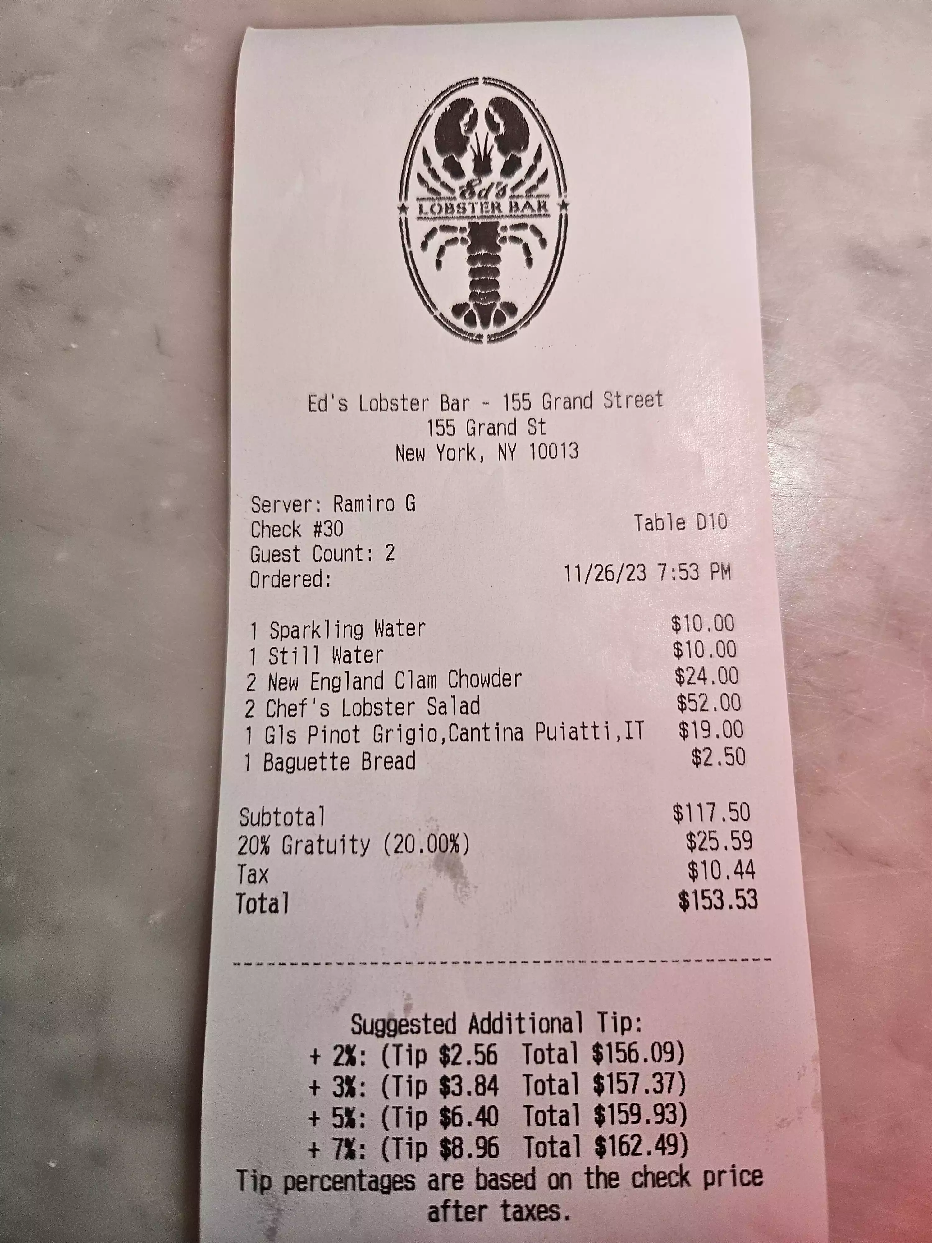 Once again this cracking little restaurant served a great meal with excellent service. We have been here before and are still not disappointed with the whole deal. A great atmosphere and food at reasonable prices for New York. Well worth a visit for something a little different, try the Lobster Roll it is a wonderful meal. Thank you, a great team.