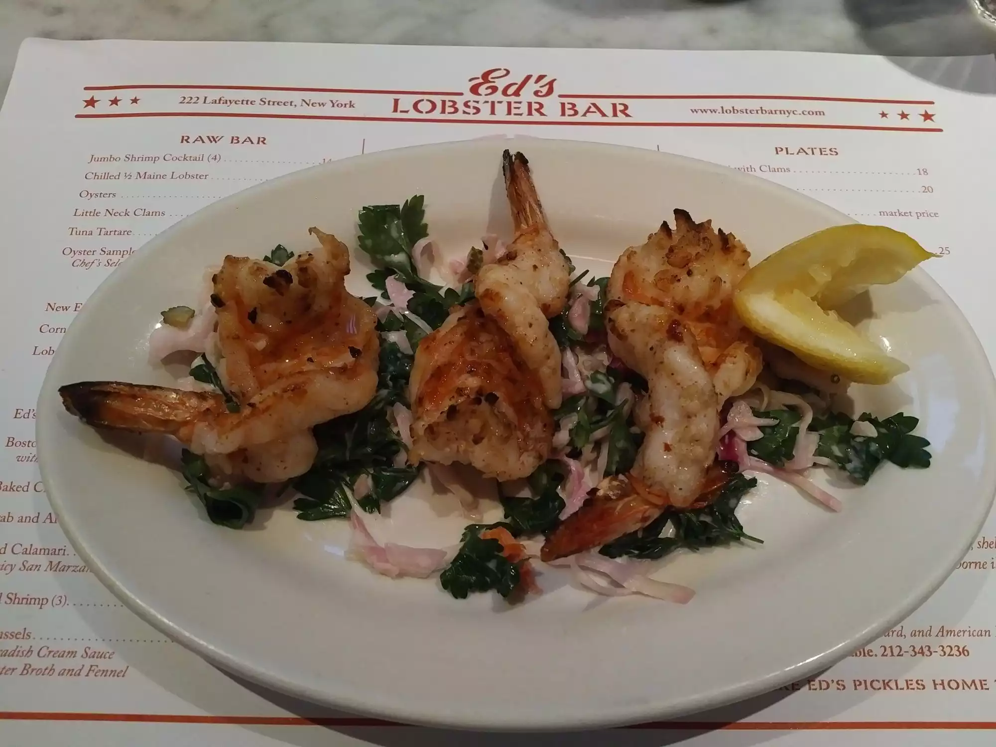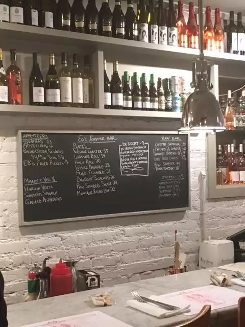 My gf and had been furniture shopping hard in SoHo and visited Mitchell and Gold ( as an aside great pieces) after a decent sum of funds were transferred, we began looking for some lunch. Completely by accident we viewed Ed’s. Went in at noon on a Sunday. It was quiet to start but rapidly filled up. Lots of young people taking pictures of themselves with the menu? Anyway we met a great guy behind the bar who totally engaged us. The oysters carried a brisk briny taste, the condiments as well did not disappoint. Next, a sweet lobster roll with a small amount of mayonnaise and fat pieces of lobster. Ed’s homemade pickles came fried with a nice tartar sauce ( ranch would be good too). Made us feel like we were old regulars. I’ll come back soon!