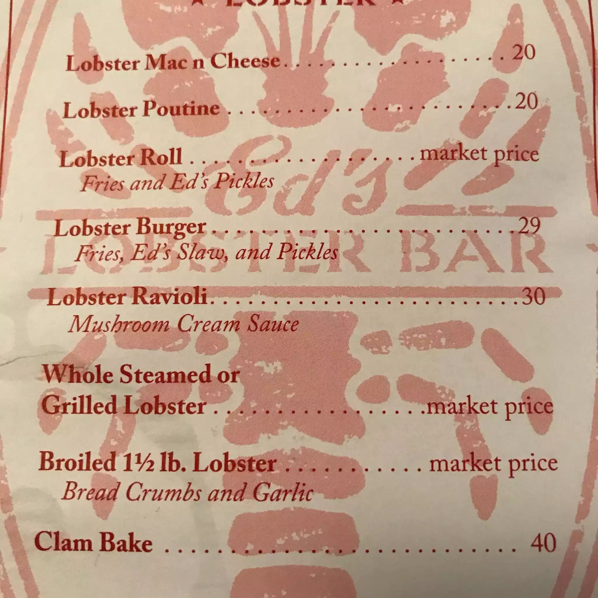 I've been coming to Ed's since they opened and it's with a heavy heart that I can no longer recommend it. Between covid and inflation, I expect a drop in quality but Ed's has become much much worse. The Lobster is tasteless and the Mac and cheese is Kraft's supermarket quality. The portions too small but the price is gone up far too much. AVOID.