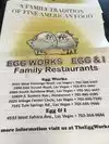 This establishment was recommended by our car dealership, so since we had plenty of time to spare we thought...why not?!? We are very happy we decided to try Egg Works and plan to go again. First our wait was about 30-45 mins long, but was worth every minute. The inside is a good size, however, when it’s packed you can feel it since everyone is taking in air. Ordering was easy, and the egg stand to let the waiters know when you need help is a great idea. You simply flip the egg to a sad face when help is needed and they come right away. Saves them time from having to ask if anything is needed, and allows the customers to enjoy and not be disturbed. While flipping through the menu we quickly saw they serve more than eggs. Even offer meals without eggs. We were in the mood for breakfast and it was more than a serving of breakfast. You get what you pay for and they do not skimp on the servings.