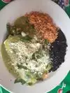 The atmosphere here is very welcoming. We sat near the open window next to the street and enjoyed the street views and cool breeze. I had the veggie enchiladas with the green tomatillo sauce. It was delicious! Filled with sweet potatoes and asparagus, with a side of beans and rice. The rice was also super delicious! Very filling, and worth the price. 😋