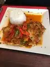 It was good. We were hungry and proud to find a sit down place. The food was not spicy. It was mild. We had pork and shrimp. Service was good.