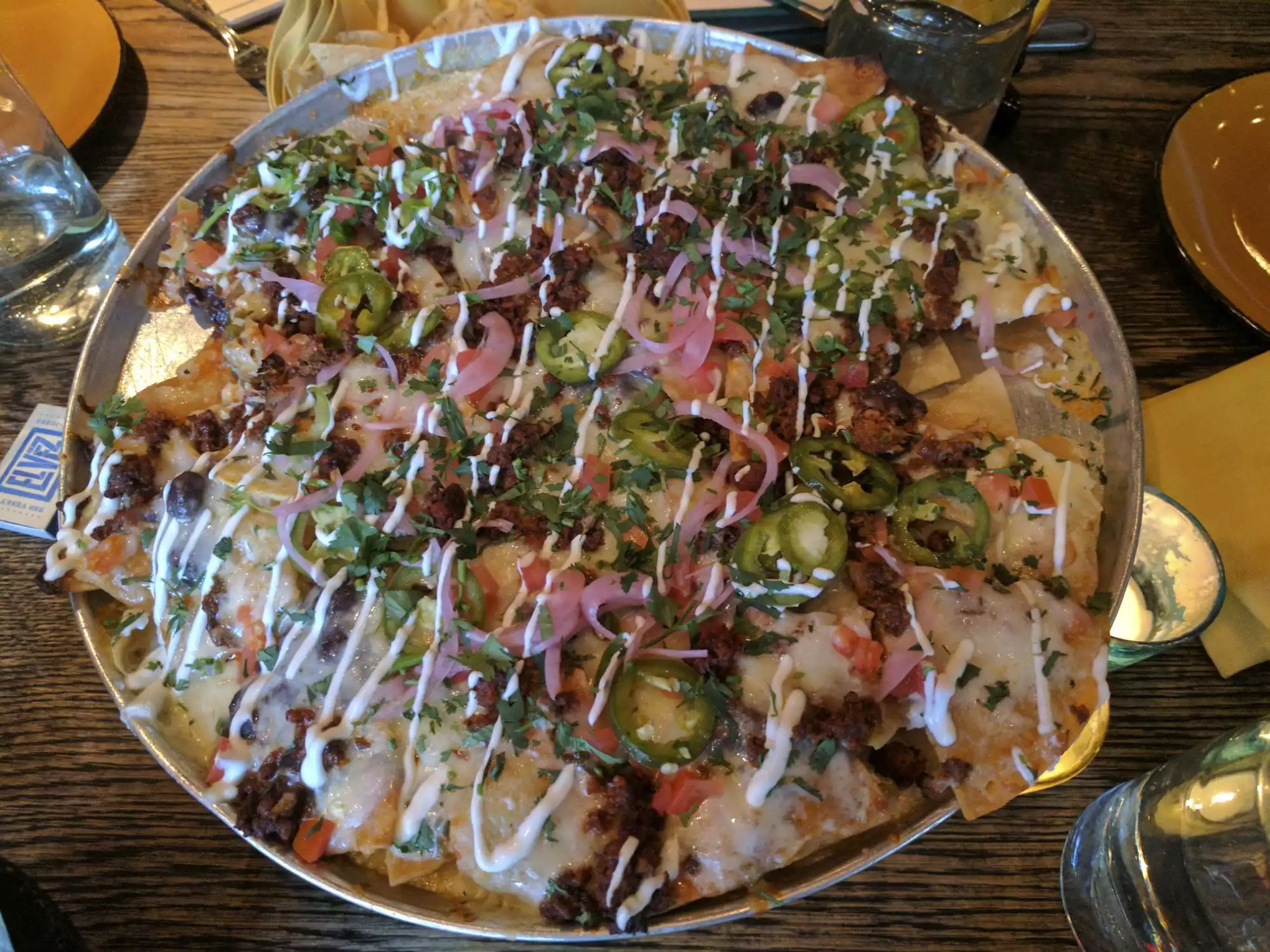 Don't be put off by the front bar scene & noise. Make your way to the rear areas where it's quieter. The Mexican food was actually special and far above average taste quality. Tried the nachos and they are both unique and large, if you get them with just two diners, be sure to maybe split one entree afterward! Atmosphere has energy and a various crowd of mostly after-work locals and some tourists. Not really any complaints. I'd definitely visit again. I'd order the nachos again!