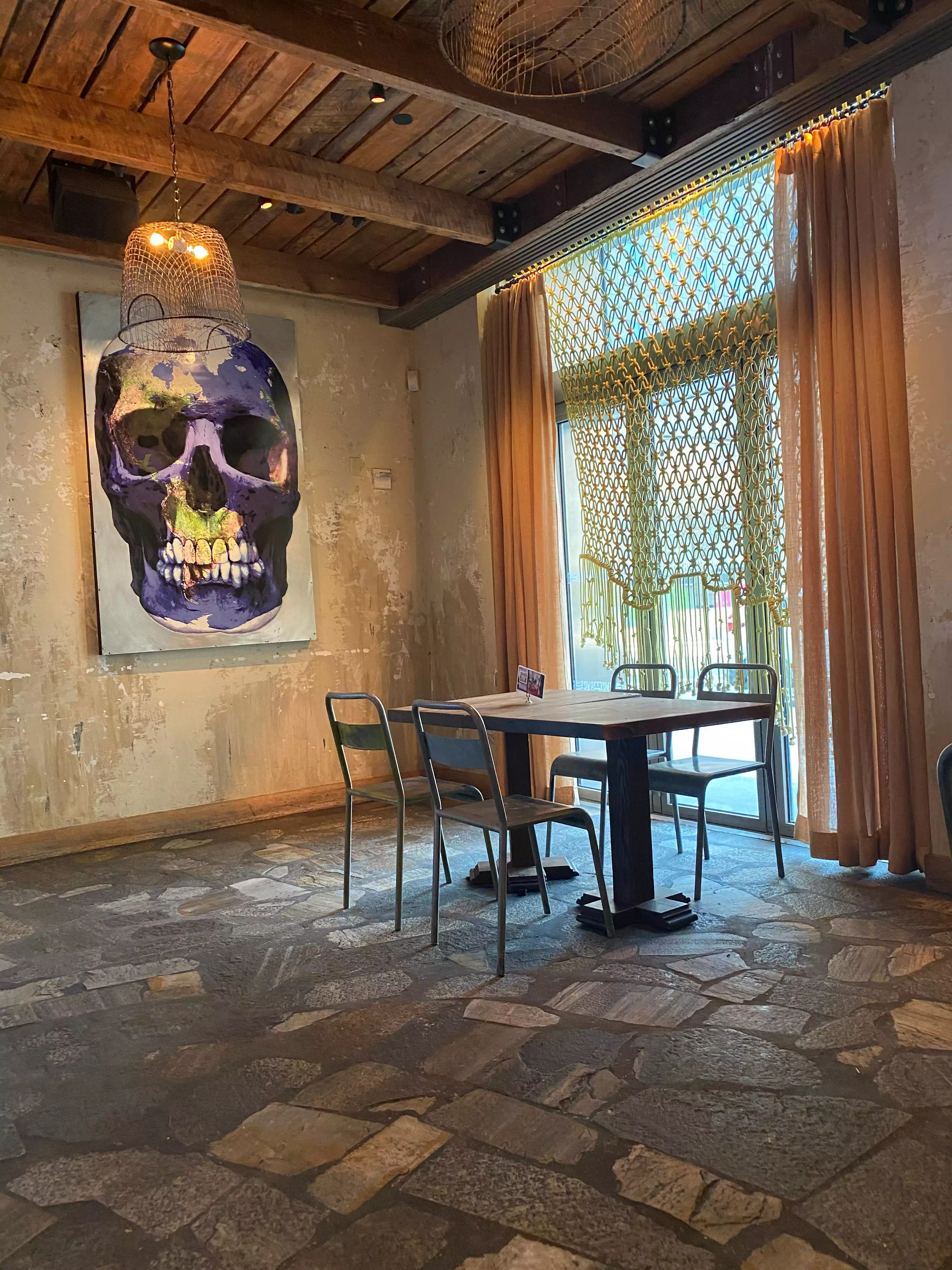 Arrived a little after 2pm and shocked at how empty this place was. We were welcomed right away and seated promptly. Everyone was so friendly. I absolutely loved the decor and ambiance. The dramatic skull artwork would be something I would put in my own home. Husband had beef enchiladas and I had the chicken. The food was good, I recommend the chicken over the beef enchiladas since we took a bite of each other's. The portions are on the smaller side compared to many Mexican restaurants I have been to but that is fine since we had no ability to take left overs with us. The food was good but nothing to go out of your way for. The service was top notch!