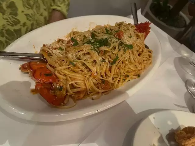 My wife and I and a friend went to celebrate our Anniversary. I know that my wife loves their Lobster with pasta so that's where we ended up. We were seated and eventually served their pita with humus. My wife wanted a glass i=of Reisling which unfortunately they did not have, We decided to order. WE ordered their calamari with a marinara sauce. Then the main dishes. My wife naturally had the lobster with the pasta our guest had the mussels and I had the chicken souvlaki. I was eating the pita with the humus awhile waiting and asked for some extra hummus( they brought a small dish and ended up charging us for it!). The calamari arrived and it was good but not enough marinara sauce, The main dishes arrived and my wife liked her lobster and our guest liked his musssels. I on the other hand did not like the chicken souvlaki, I had our guest try it and he agreed that it was dry and not very tasty. When I told the waiter he was incredulous that it was not good. My wife being the diplomat that she is humored the waiter not wanting to hurt his feelings and said that I was probably not hungry and would take it home. When it came to dessert my wife asked if they had tiramisu and the waiter replied this is not an Italian restaurant. When we asked about cheese CAKE HE REPLIED MAYBE I'LL GO ACCROSS THE STREET and see if they have some! We ended up with their baklava which was dry and not very tasty.