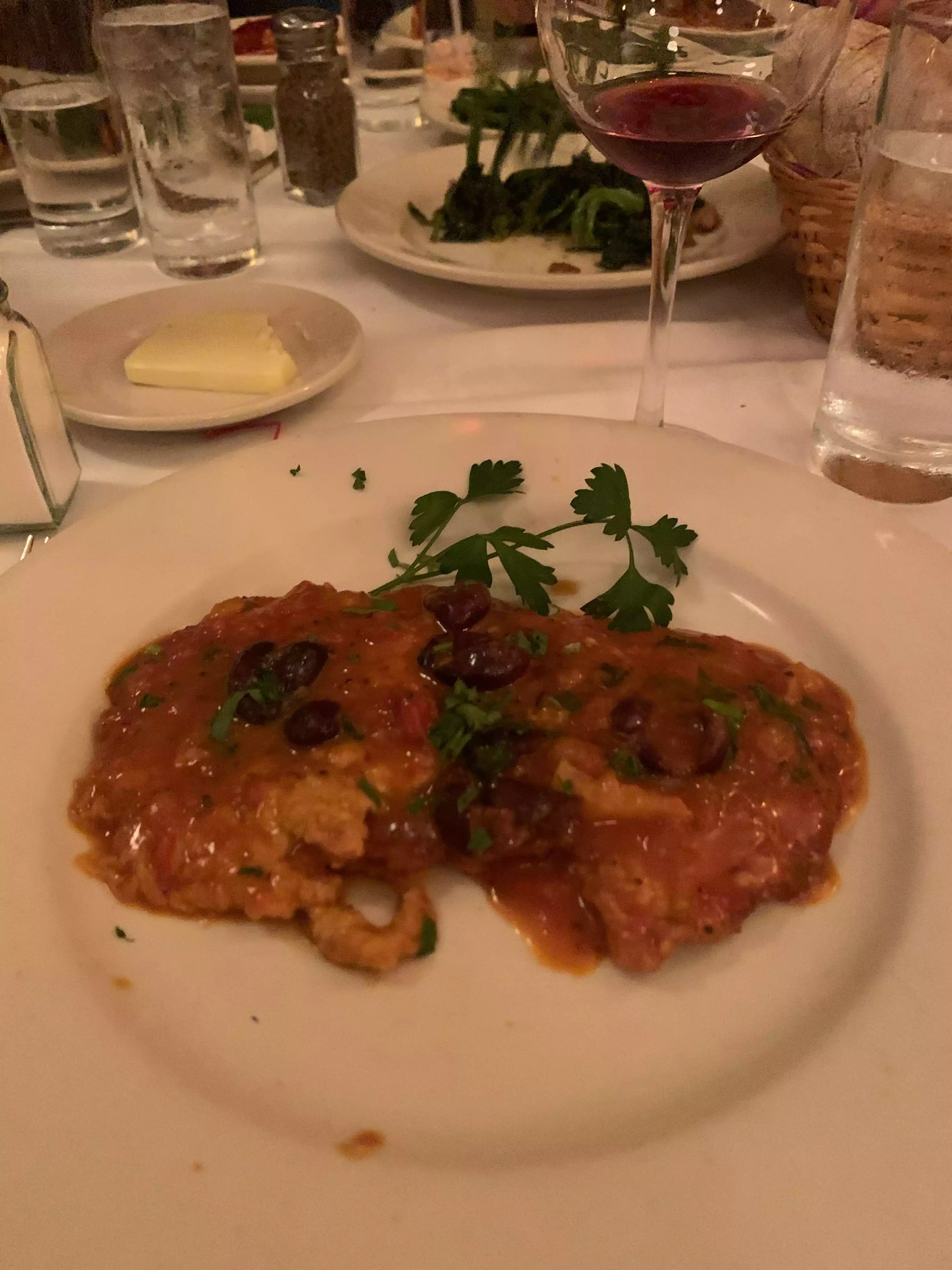 We were in NYC and meeting our kids for dinner. They picked Elio's, an upper East side institution. It was a Sunday night and the place was packed with mainly regulars who obviously have been coming here for years. Put they squeeze people in, no room between the tables. I was disappointed in the food. Started with mussels in a white wine, just ok. Also fried calamari, also fair. My wife loves chicken parm. She thought it was nothing special. I ordered a nightly special, veal scallopini with mushrooms.Just ok Everything is a la carte. They are just lucky they have a loyal following.