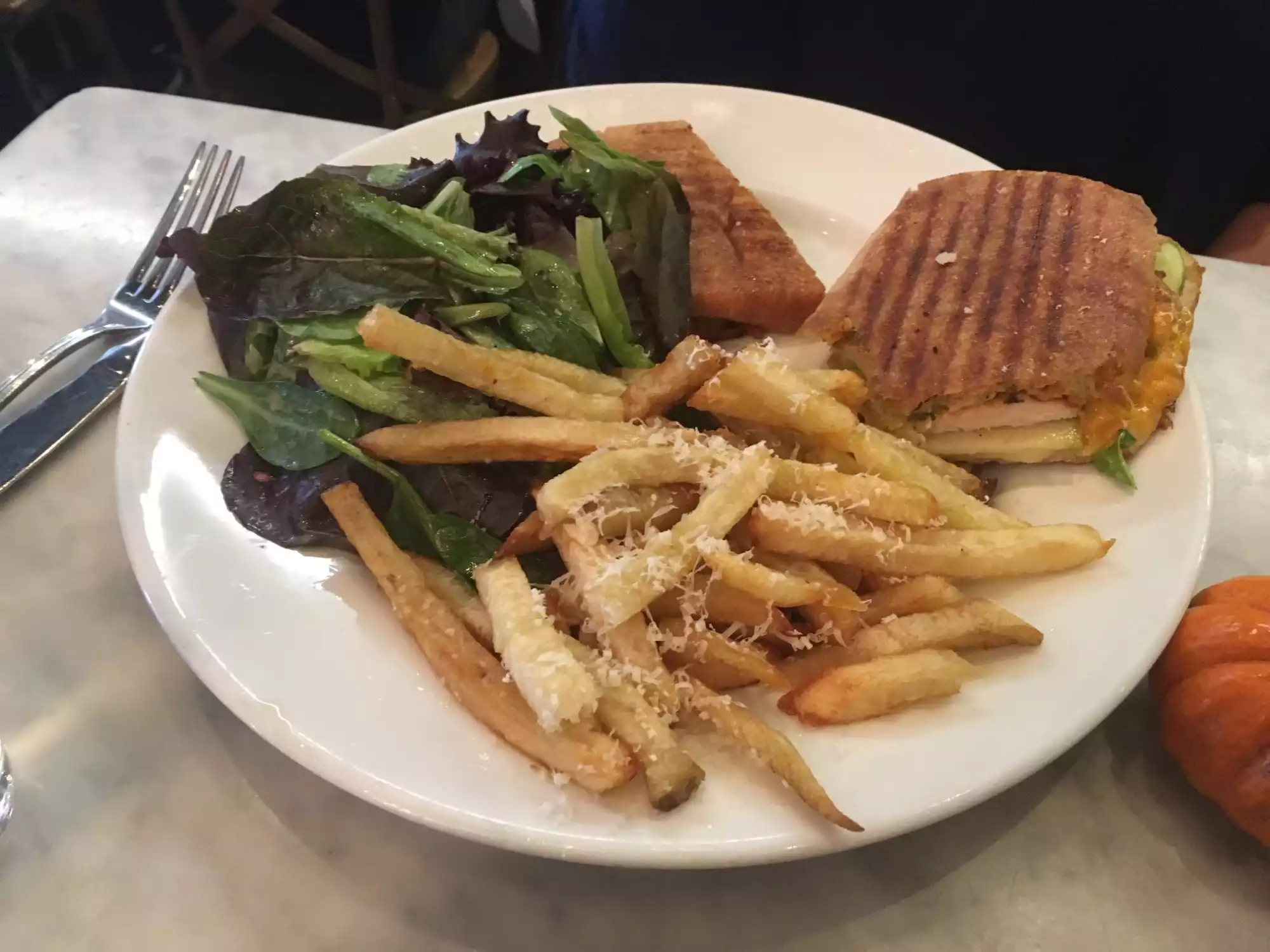 I went at noon on Monday, so it wasn't too crowded. There is outdoor seating in addition to the normal indoor seating. I don't always like to sit outside with all of the traffic in NYC, but my friend wanted to, so it wasn't as enjoyable for me. The gazpacho soup was puréed and very good. The egg and cheese on a croissant was okay. Not great by any means. Fries were good and so was the salad. Very average.