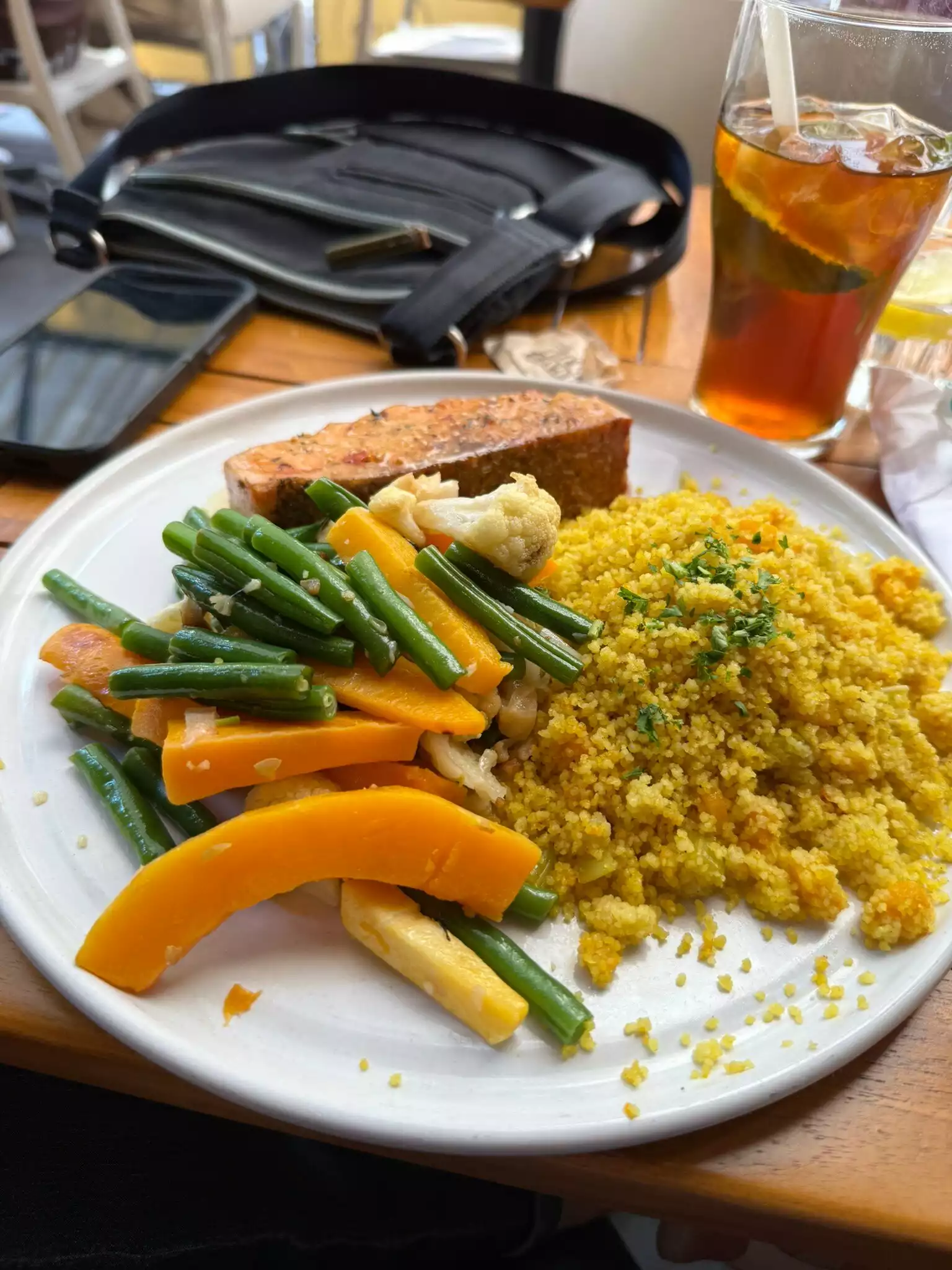 Food is delicious, lunch special is the best deal in the city. Salmon, lovely veggie side or couscous with chicken soup ( better than mom ‘s ) all for $21. The staff is efficient but not terribly chatty, I see people complain about their attitude but it is what it is. Frankly, I dont need my waitress to be my pal. When weather is nice, the outside covered sidewalk space is a real pleasure.