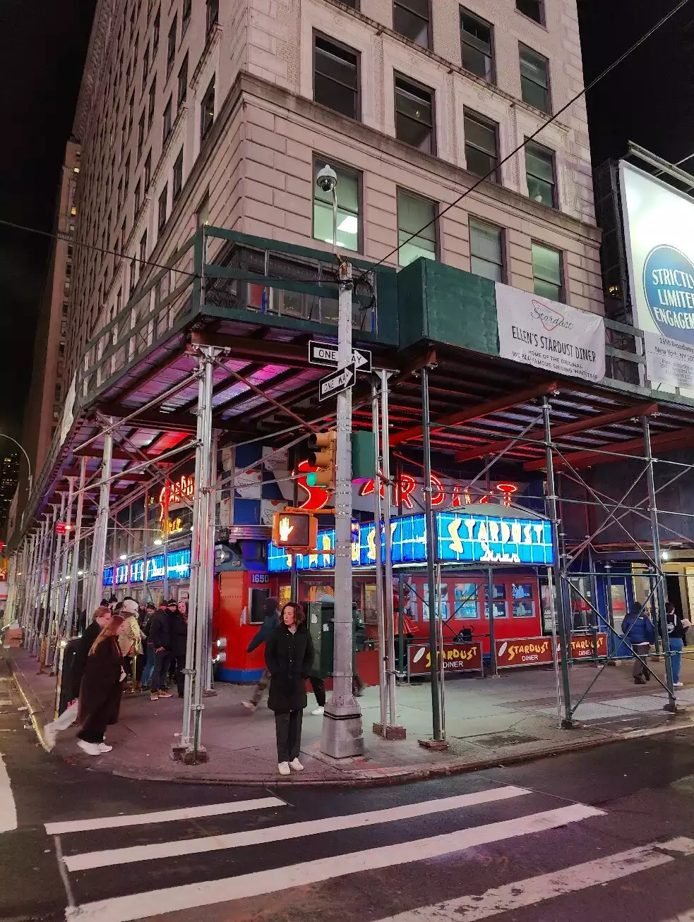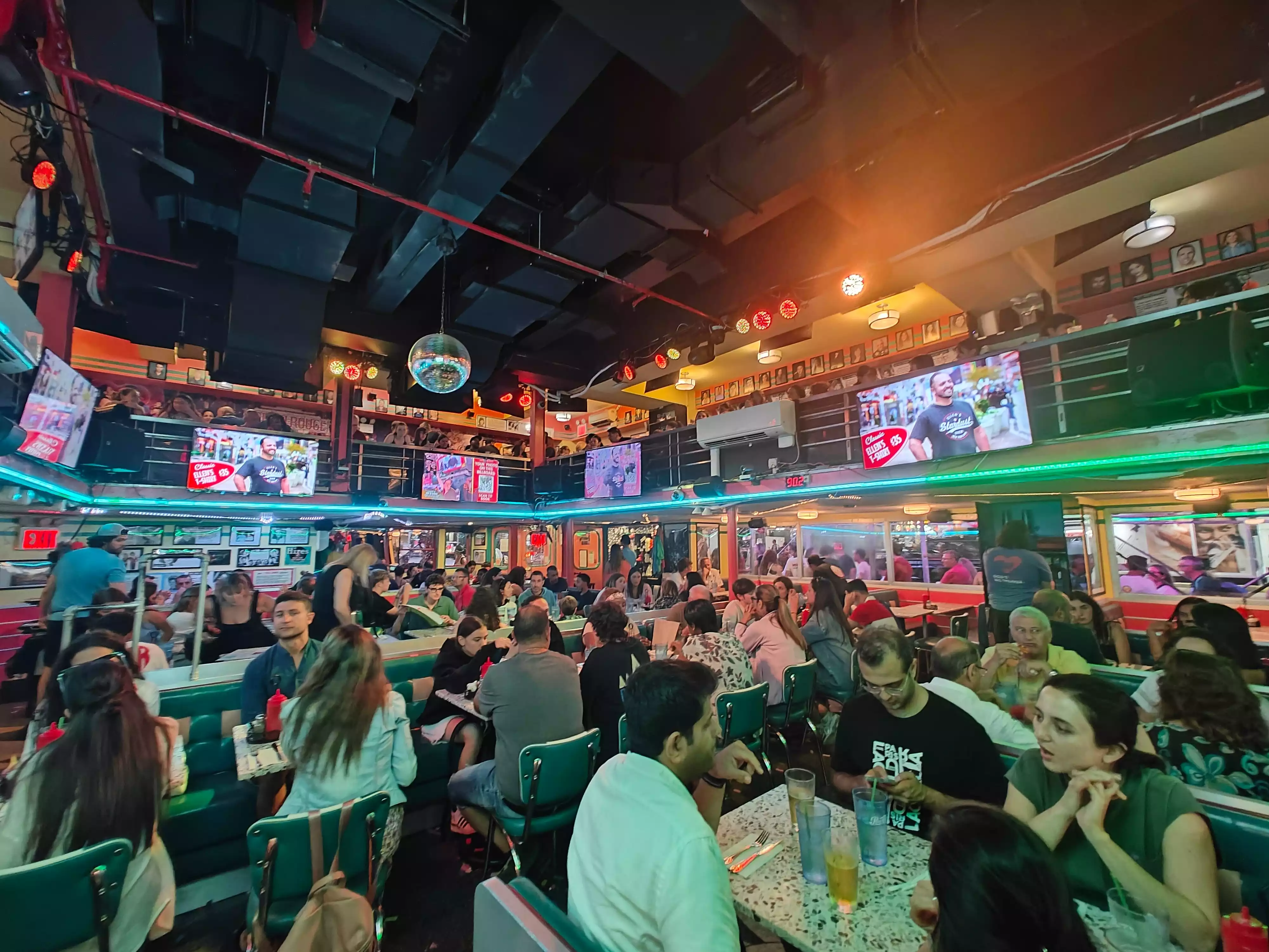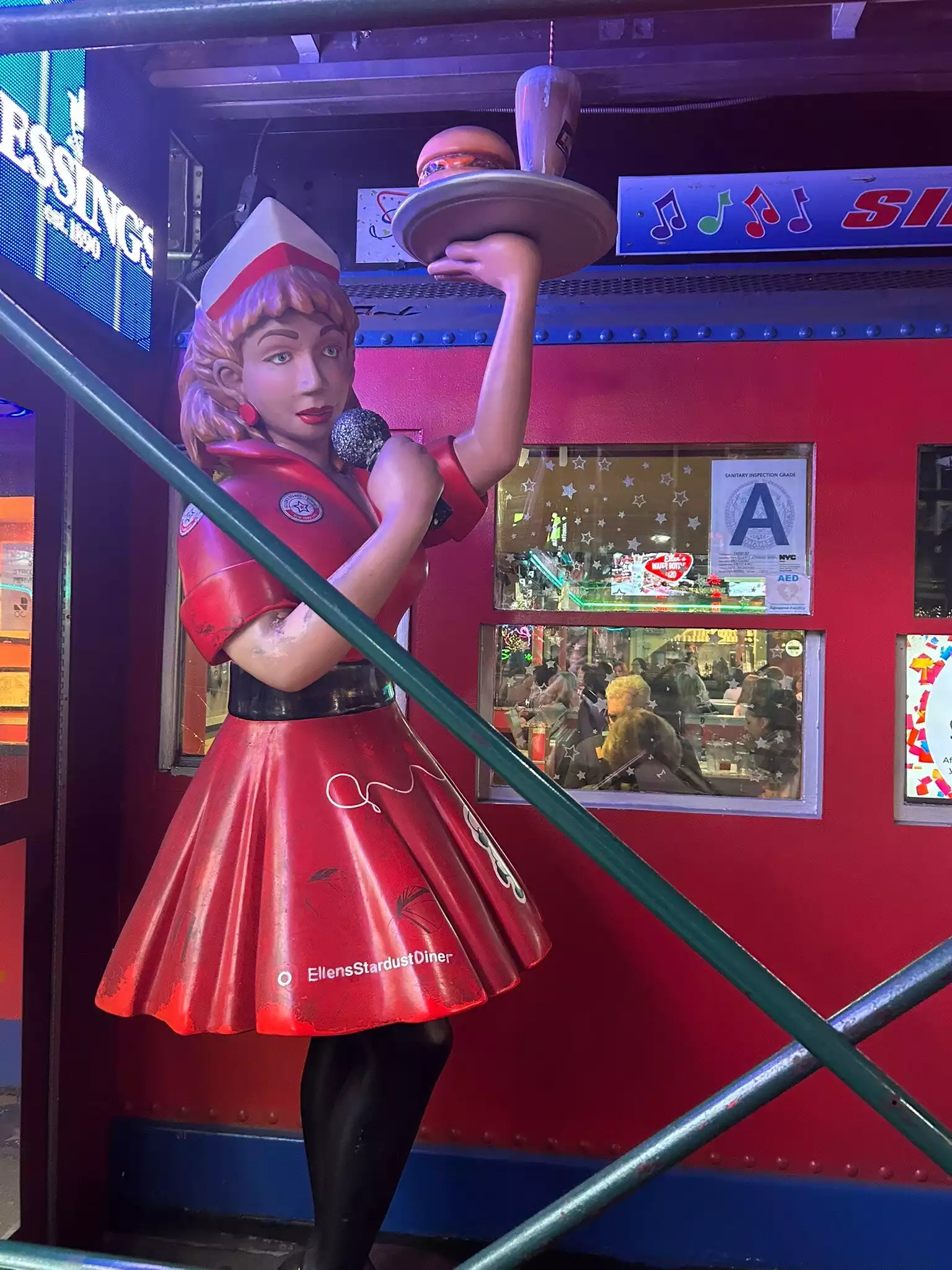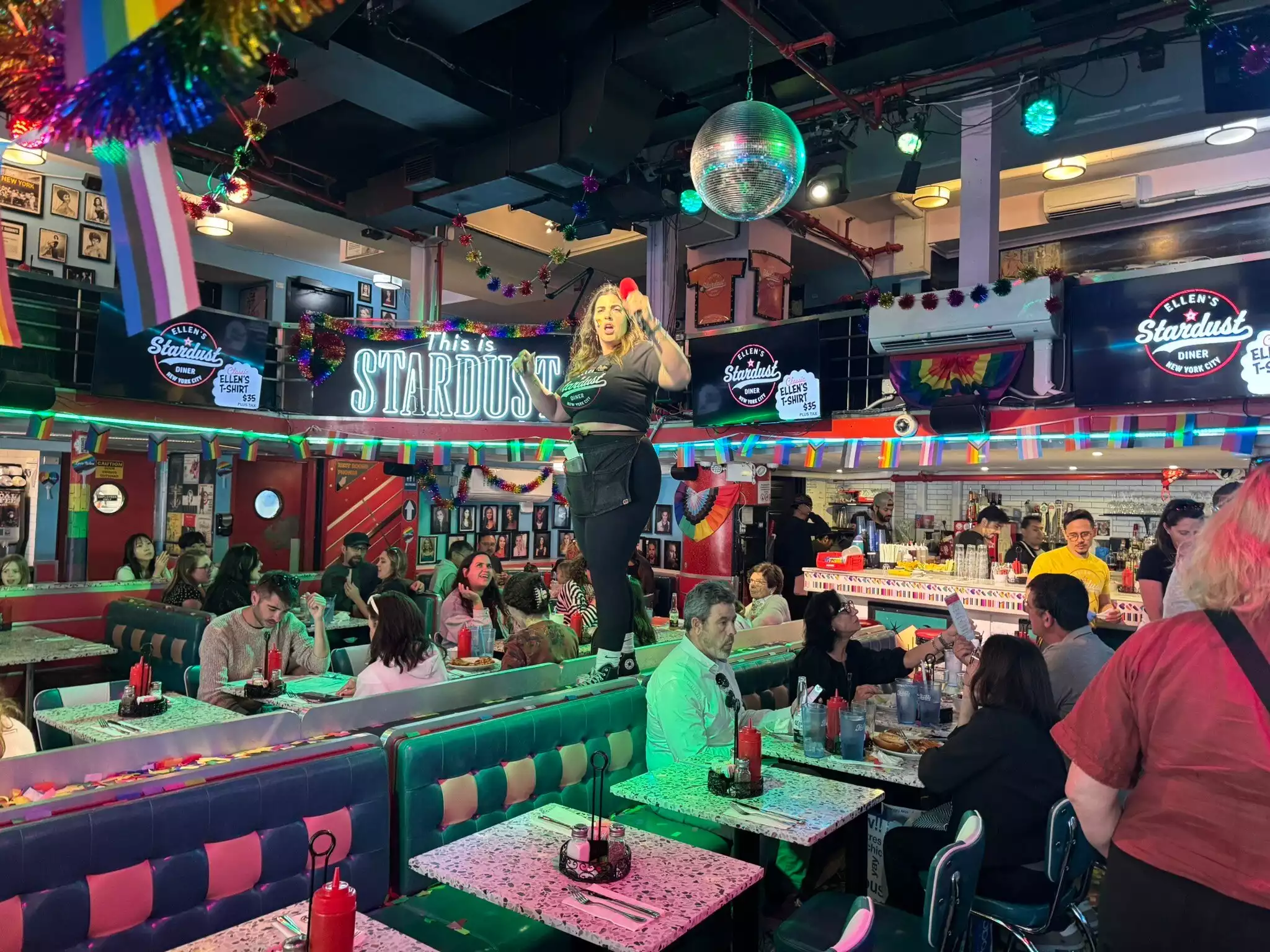 Ellen's Stardust Diner is a must-see experience on a trip to New York! We stayed here in May with the family and were amazed. It's a place out of the ordinary compared to the places that are around us. The food is classic American style, but the real magic is the Service with "show": the waiters sing live with incredible professionalism and skill. It feels like Broadway, but while you're eating dinner! The atmosphere is vibrant, fun and exciting. It is absolutely worth it to queue up and wait your turn to enjoy such a unique evening. If you're in New York, a visit here is a must. Go there and have fun!