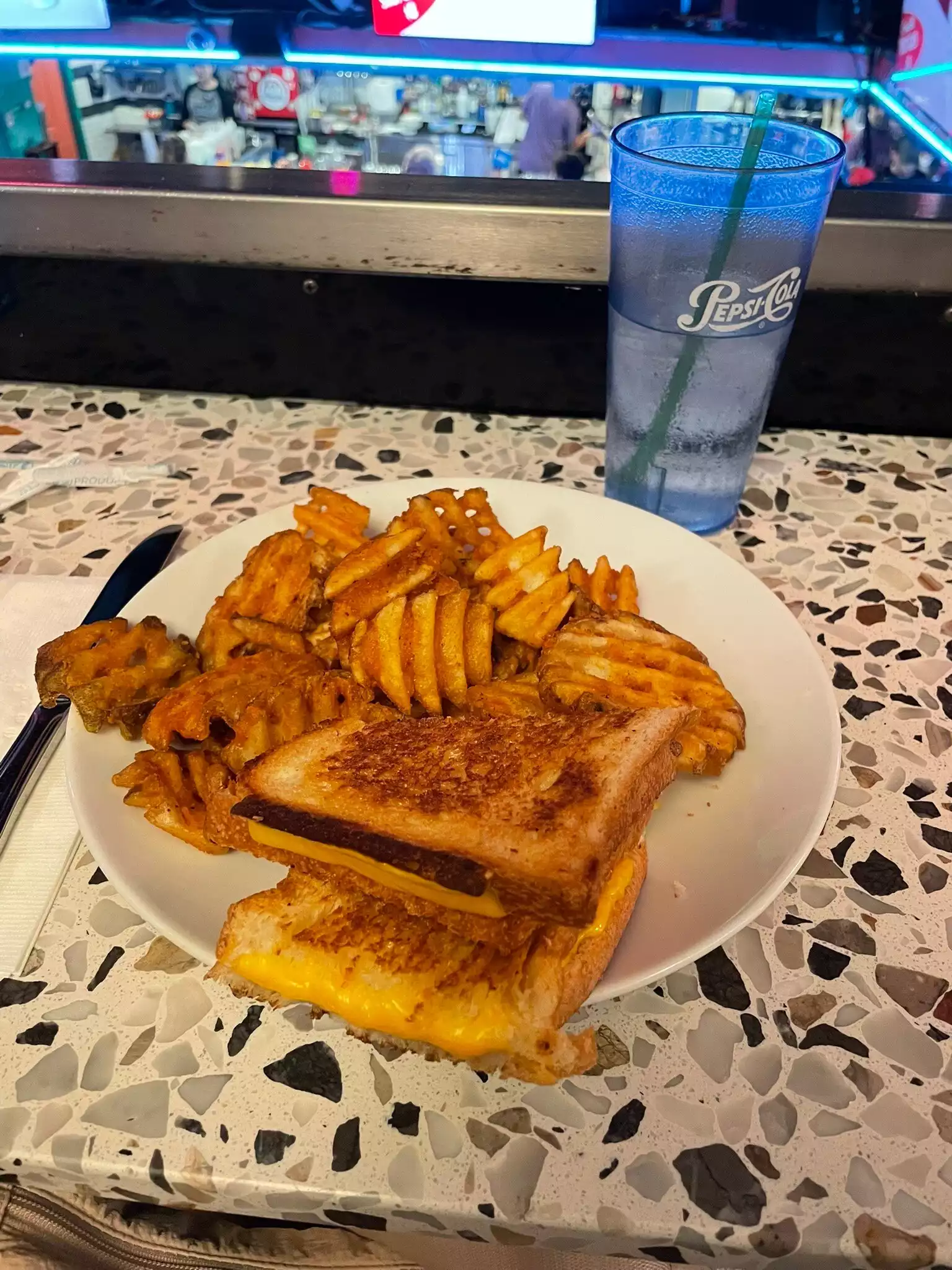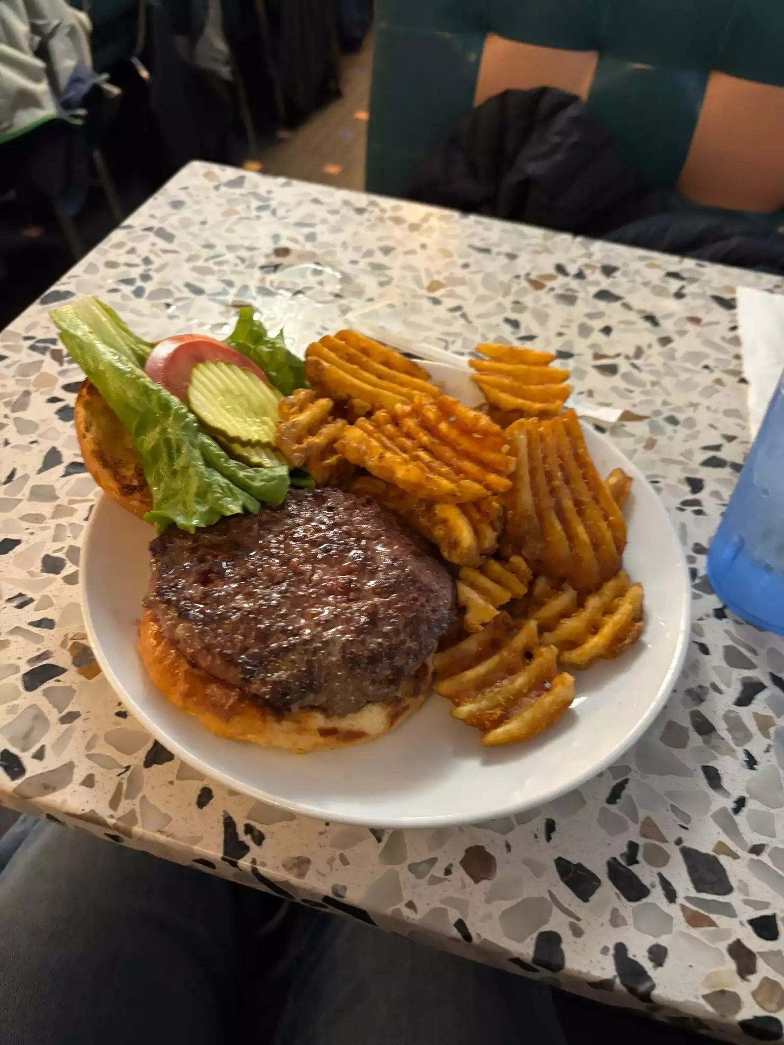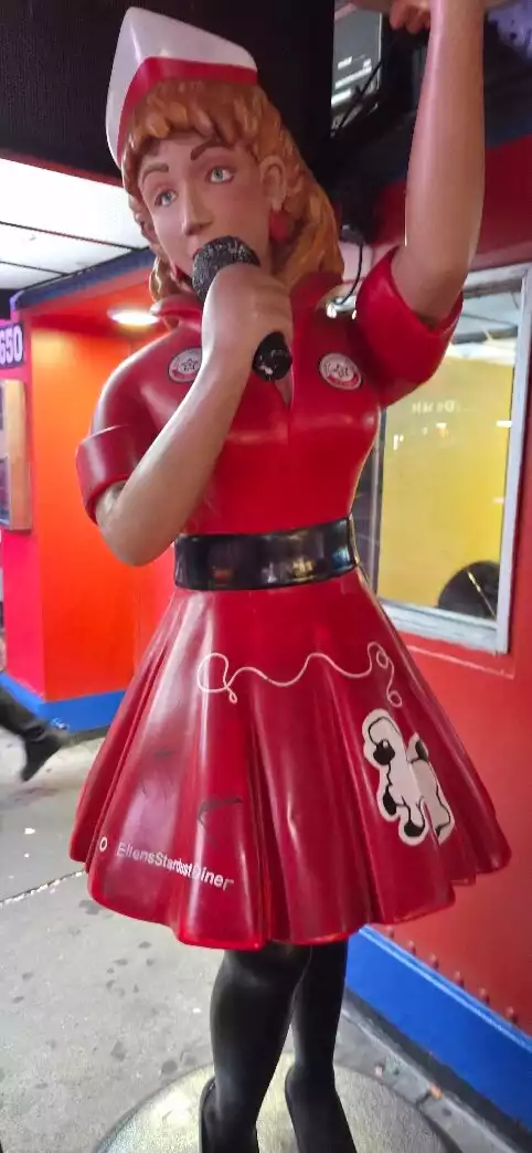If you only had one day to do lunch in the city and wanted to also have a little bit of a Broadway experience and just a good time with great food, this place is it❣️ The entire wait staff can belt out a tune and it is worth the wait if there is a line. They sang songs from Broadway shows and popular genres of music. Thanks to my cousin we had a seat right along the little runway that is in the middle of the restaurant. There is memorabilia from eras gone by of various celebrities hanging on the walls. The meal we had was great as well. They serve generous portions and we did not leave still hungry. I had the cheesesteak sandwich which was served with waffle fries and my cousin had a burger and waffle fries. Both of us were satisfied with our choices. My only disappointment was, I wanted to try one of their signature milkshakes however they don’t do plant based milks and so I wasn’t able to try one. 😕 Overall, I HIGHLY RECOMMEND Ellen’s Stardust❣️🥰