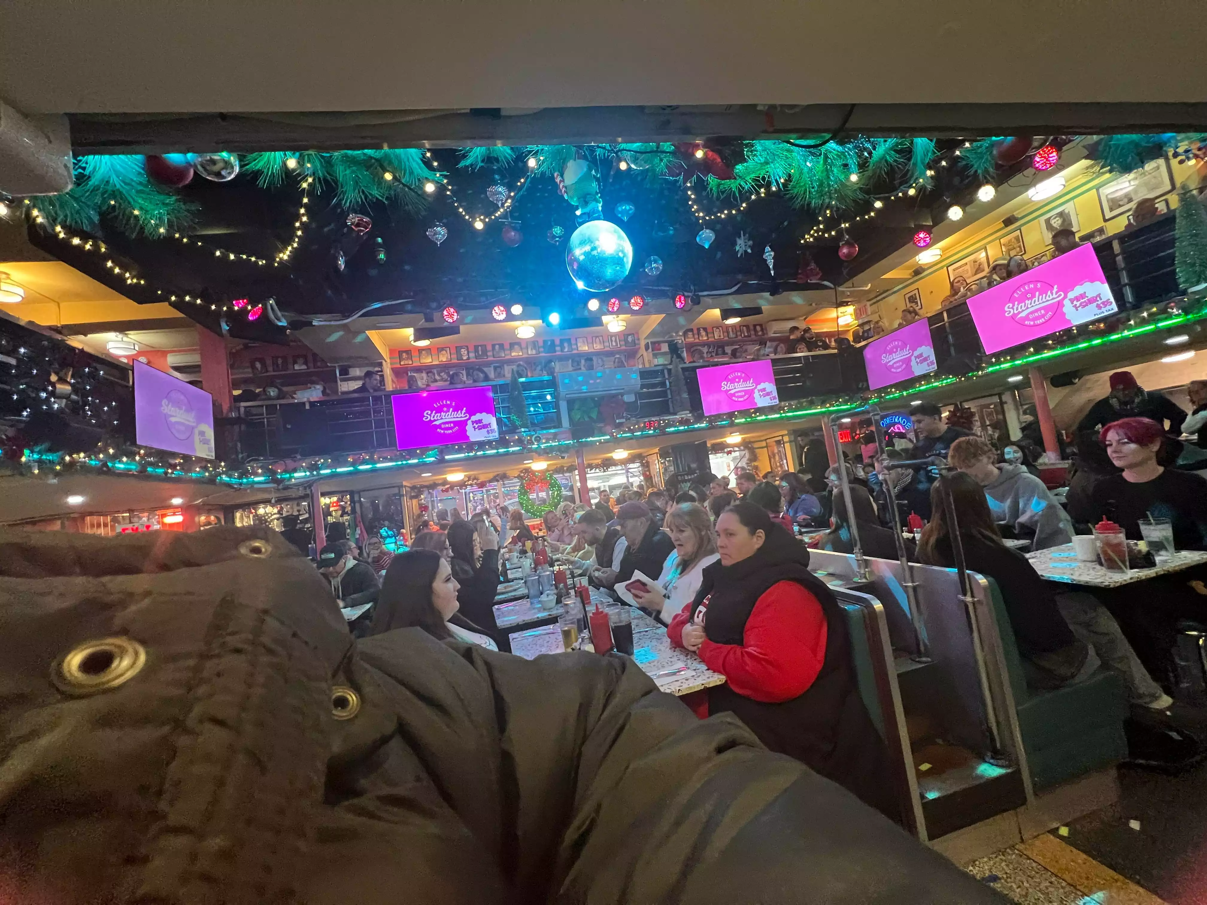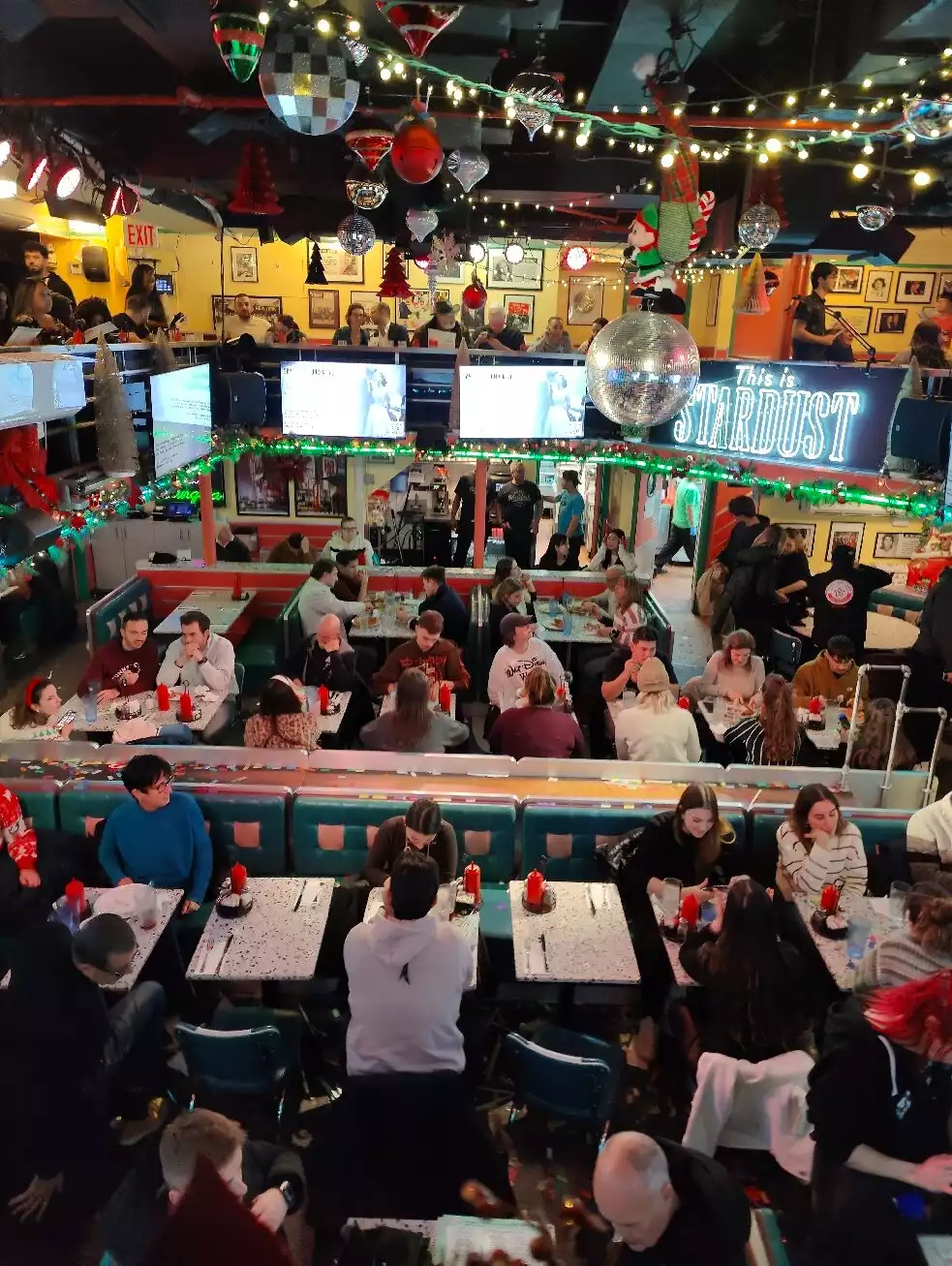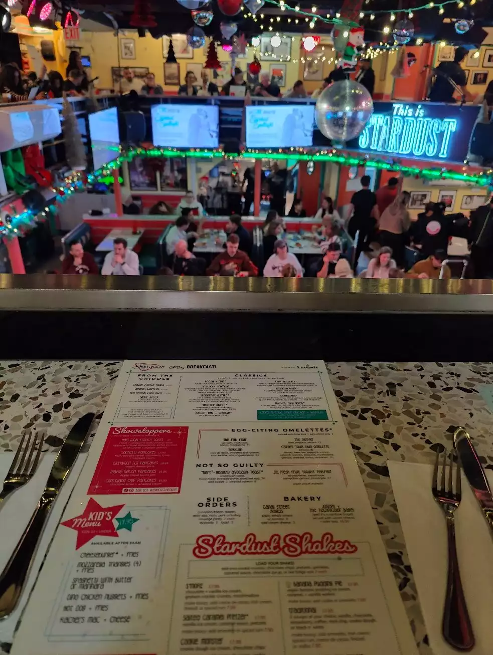 Stayed overnight in the city to watch the Christmas Spectacular at Radio City Music Hall. Our hotel was about a 6 minute walk, so perfect location for us. Went for late lunch (2) to the Stardust. We waited for about 45 minutes outside but thankfully you are covered and blocked from the winter elements. Got a great booth upstairs, had a tentative waitress, and the food was "ok" for the price (the kids loved it so I guess chicken tenders and pancakes were great lol). We didn't want to leave as we enjoyed the singing and entertainment very much. Will definitely go again when we return to the city.