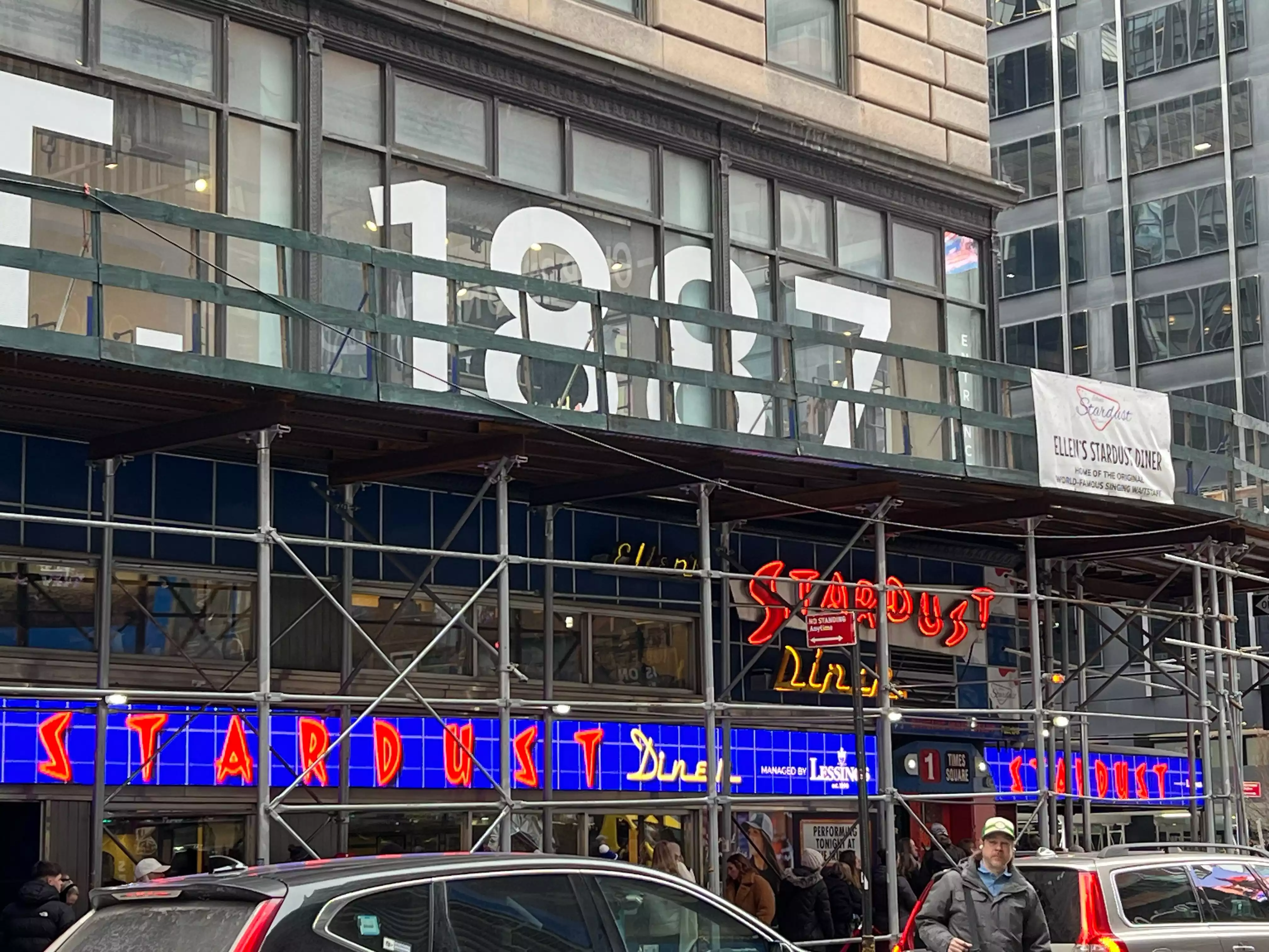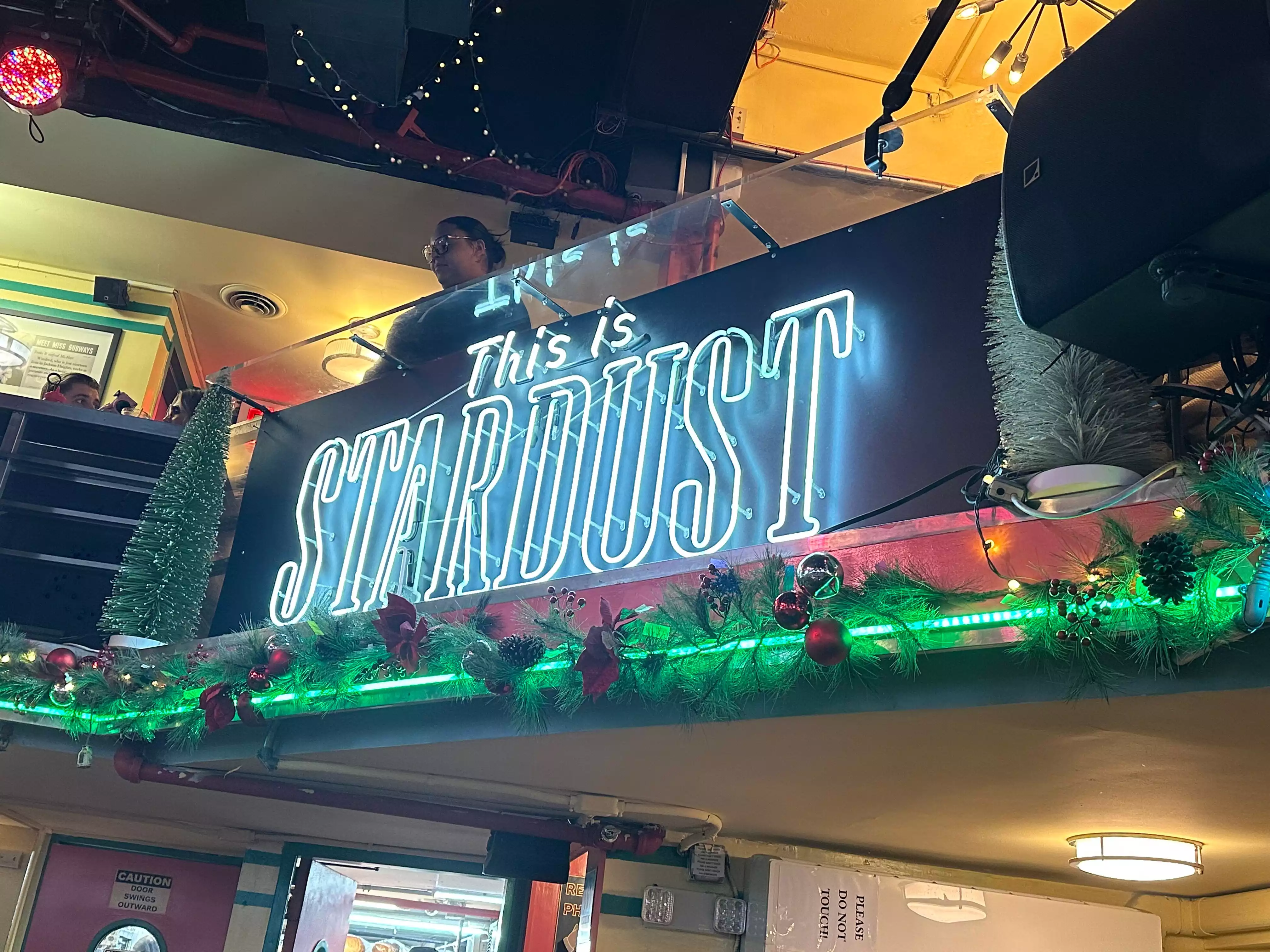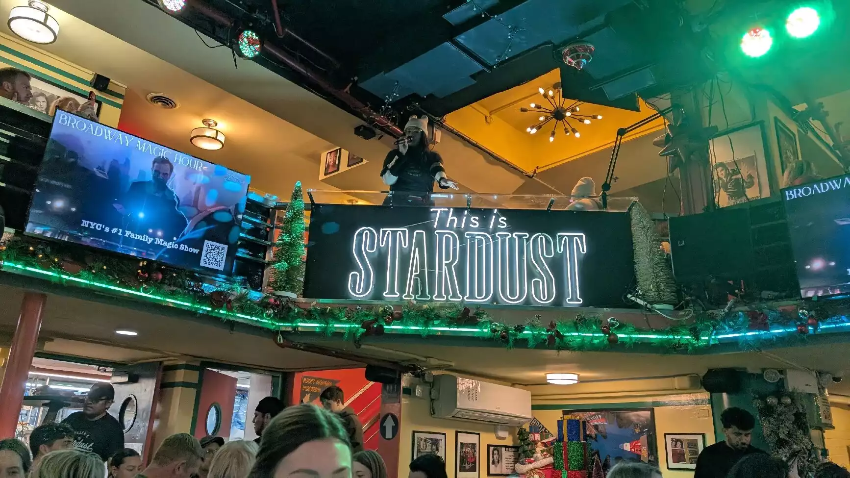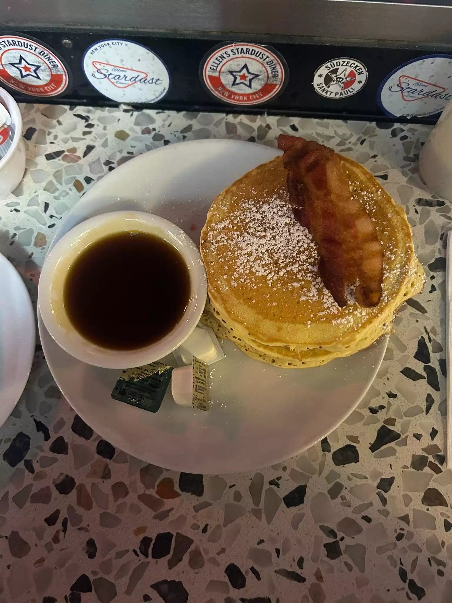 Stayed overnight in the city to watch the Christmas Spectacular at Radio City Music Hall. Our hotel was about a 6 minute walk, so perfect location for us. Went for late lunch (2) to the Stardust. We waited for about 45 minutes outside but thankfully you are covered and blocked from the winter elements. Got a great booth upstairs, had a tentative waitress, and the food was "ok" for the price (the kids loved it so I guess chicken tenders and pancakes were great lol). We didn't want to leave as we enjoyed the singing and entertainment very much. Will definitely go again when we return to the city.