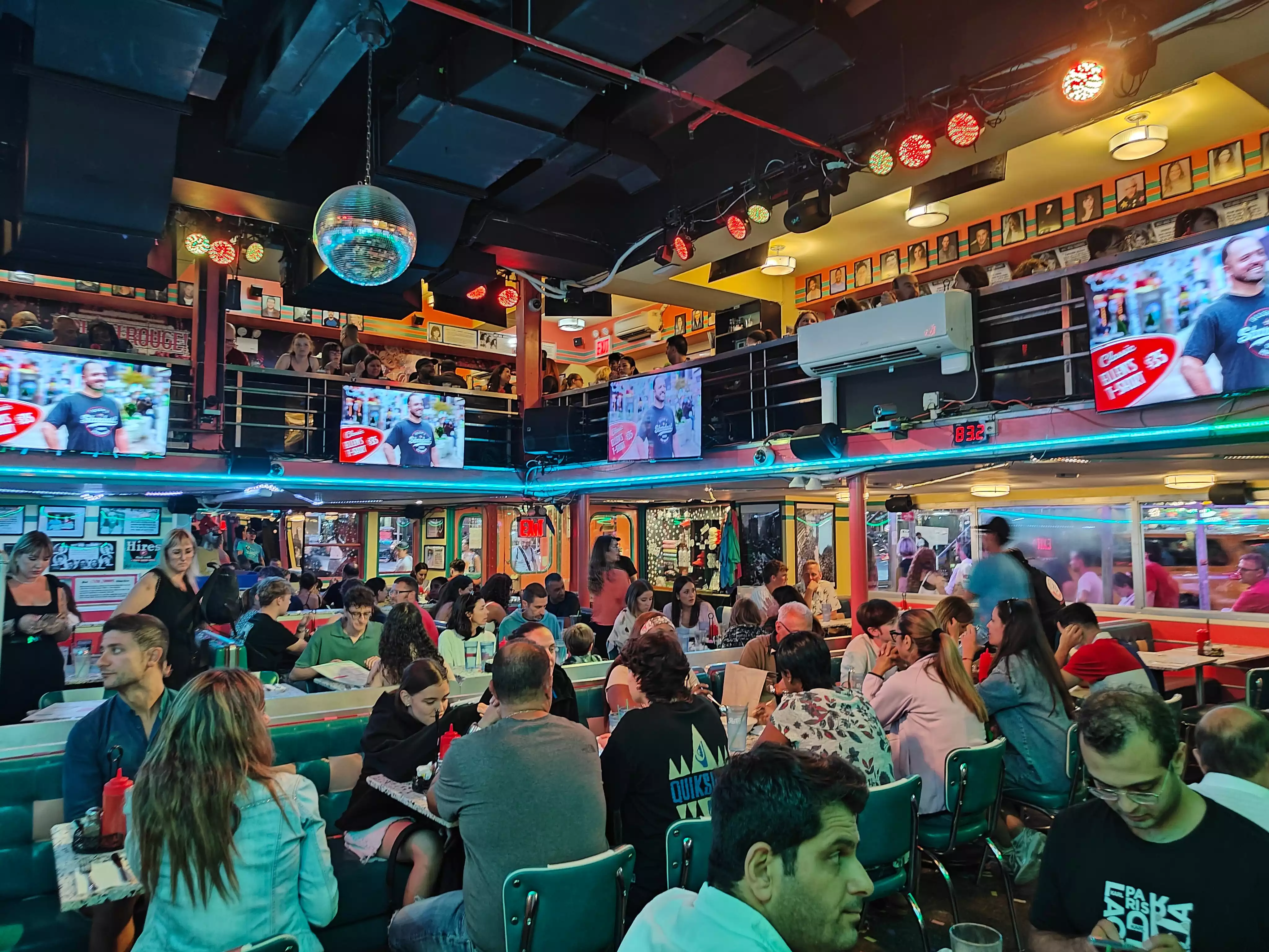 The place is exactly what you think, an American diner (with classic American dishes, nothing exceptional) where every waiter intersperses himself singing. The format is very funny and the singers are very good, you will get excited. Beware that as soon as you finish eating you will have the bill and you will have to leave, as it works in all US restaurants. Average prices. I queued about an hour to get in for dinner and they told me that at every hour of the day and night it is like this.
