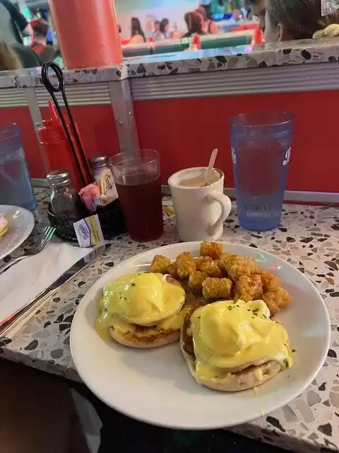 Ellen's Stardust Diner had been recommended to us and as it was a short walk from.our hotel, we decided to give it a go! Jet lagged after flying in from the UK, we were up with the lark and got to the diner at 7.30am. The ground floor was pretty much full so we were seated upstairs. We had a great view of everything going on both upstairs and downstairs. The singing waiters and waitresses were brilliant, especially the guys whose voices were really strong. The MC was a bit pushy for donations from customers for the waiting on staff to attend performing arts classes. Nonetheless, he was very funny and added to the welcoming atmosphere. We had an omelette and poached eggs on toast. The waitress was friendly and helpful with the menu. She saved me about 10 dollars which wlshe didn't have to do. Great decor and it really did feel like an American diner! We may well be back!