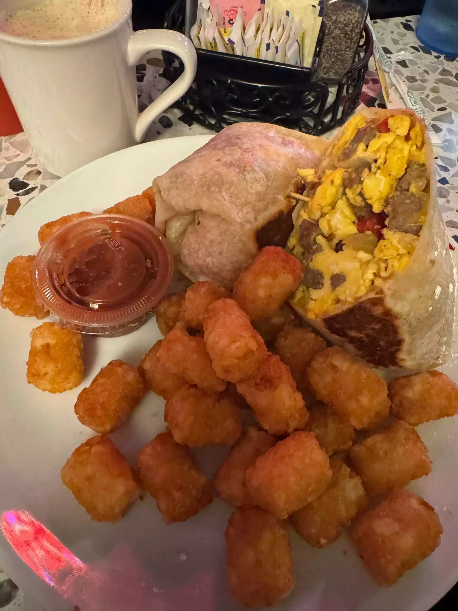 Was a very unique place to eat given the terrific performances by its staff. They were very enthusiastic, though some tables did seem to lag behind due to the nature of the diner. Staff all friendly and certainly could sing a hell of a lot better than I ever could. Ordered the breakfast burrito and the taste for what the price was, was below average. Was quite bland though good in terms of how filling it was. Prices were understandably high given the proximity to Times Square, but failed to deliver on the quality of food alone. Would recommend you come here once to see the novelty of the diner, but not again due to the quality and price of the options.