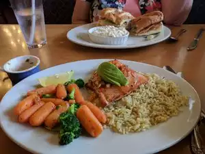 We went to two different Elmer's restaurants while in Portland. One day we had breakfast, which was very good. The crab omelet was excellent. I had the seafood feast twice; my husband got it once. My husband also had the reuben, which he liked. Their fried salmon and halibut are great. This was our easy go to place.