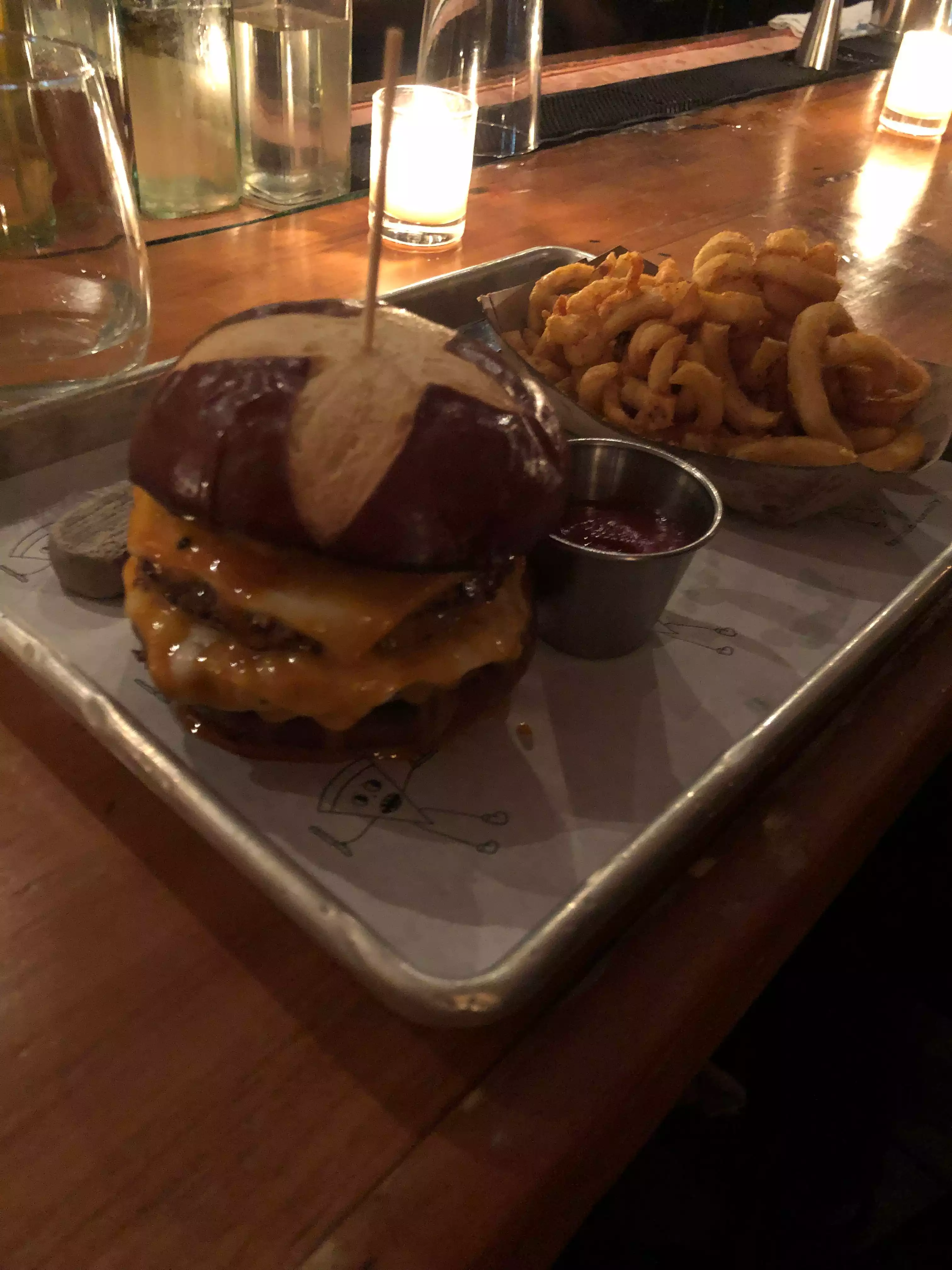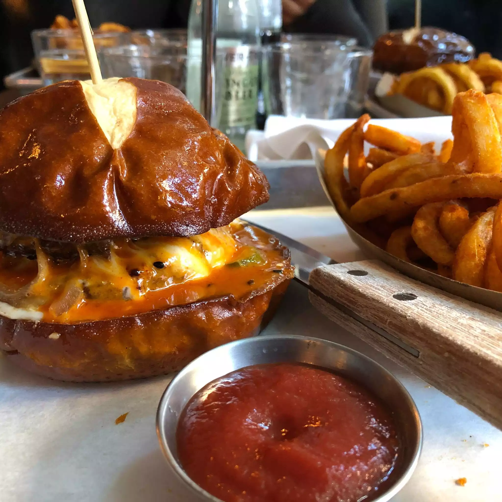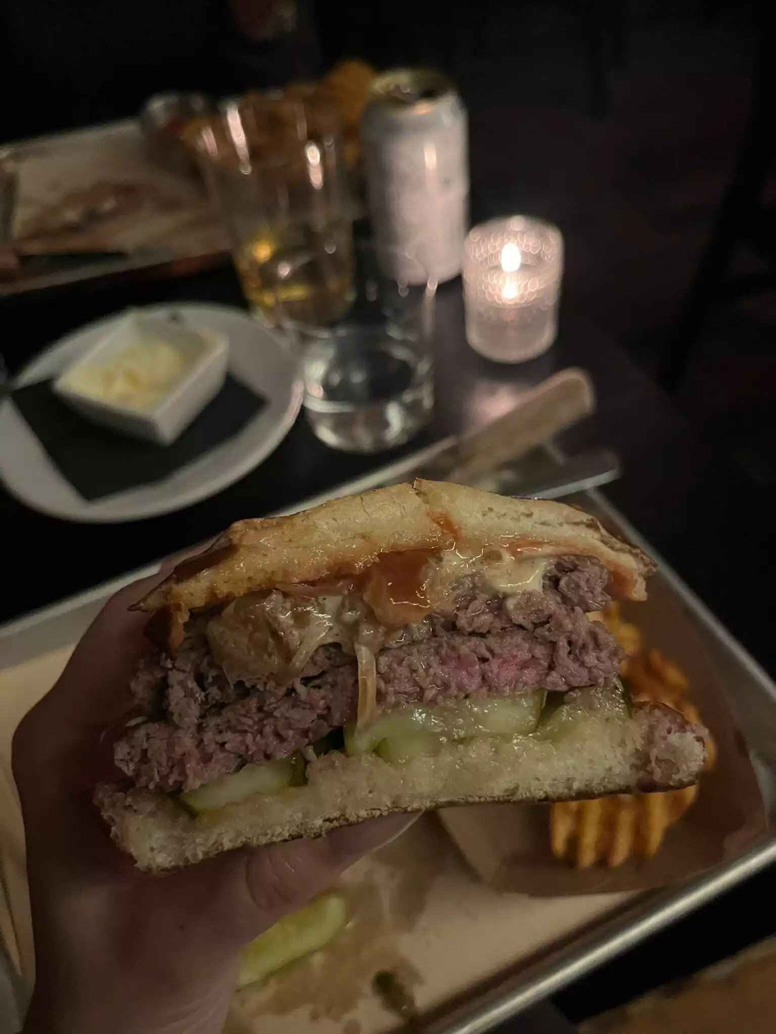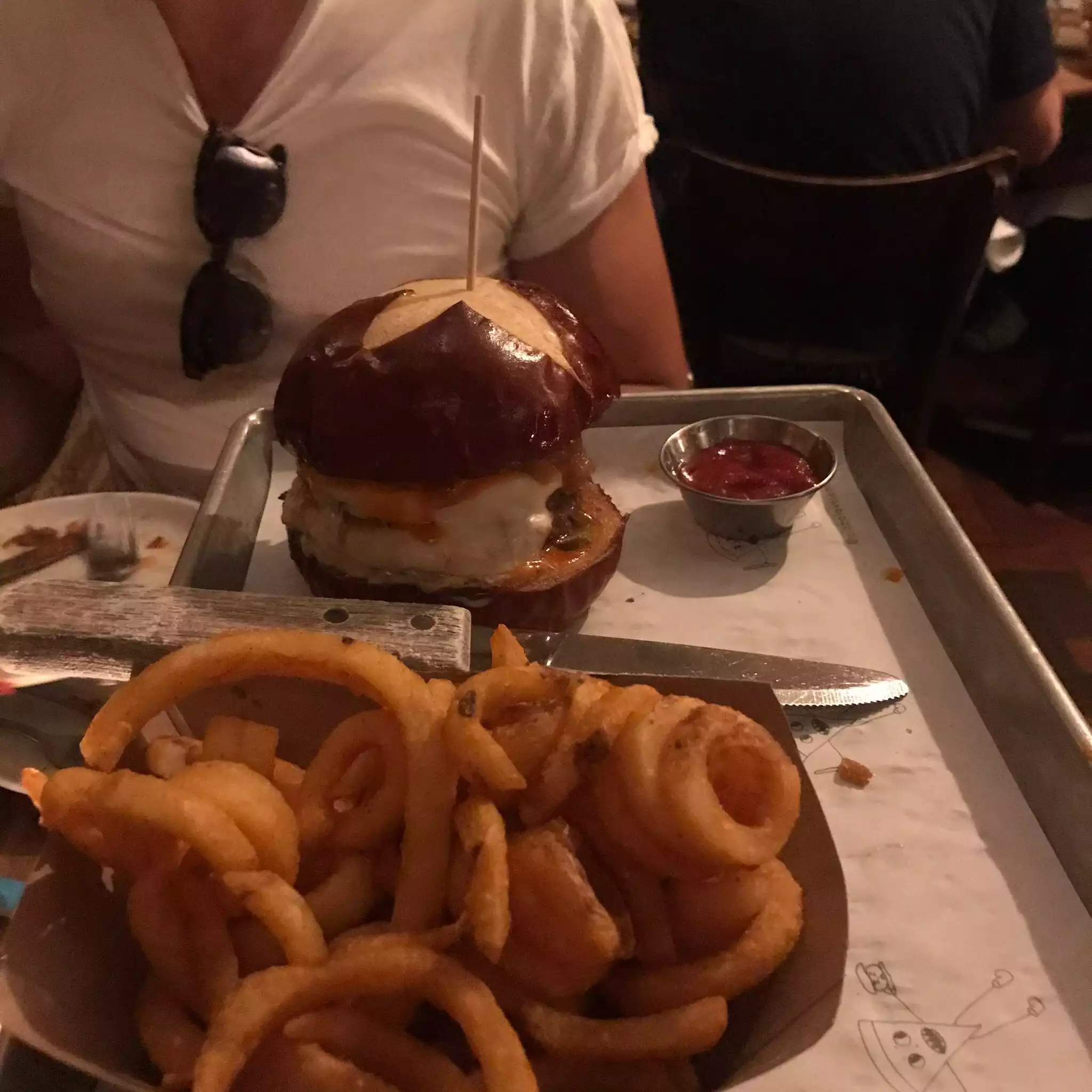 Had a family dinner here in January. We made a reservation, showed up a little early and the host was kind enough to seat us. The restaurant has two levels - both small. The main level is windowed with a small bar that gives the vibe its for eating not for drinking, the lower level - a little dungeon like but cool looking - dark and bricked with a small room for private parties. It’s worth noting there was no cell or wifi svc down stairs which is an issue if need connectivity. The waitress declined to share the wifi password. We didn’t press. The place is known for their hamburger - a double patty with cheese and onions and their sauce on a pretzel bun served with waffle fries. Burger was very filling. Taste was good - not the best I’ve had. I felt it was over- oniony, over cooked (they didn’t ask about temp preference) and under-salted but overall was a good burger. Fries were very good. We shared some apps - cauliflower in chili sauce was meh. My dinner companions shared a couple of pizzas - both gluten free. Was a relatively thick crust square pizza (Detroit style? Sicilian?) . Reviews were good and for me, a gluten eater I felt was a pretty good pizza. Drinks were good. I was a little ticked they up charged me for an old fashioned. The one on the cocktail special menu was $15 they charged be $17. They were out of the bourbon they use on the cocktail menu. I subbed makers. Clearly not top shelf and the substitution wasn’t my fault. I feel a $2 money grab just brings down the experience. Worthwhile place to go though. Young crowd and with good energy. Would recommend.