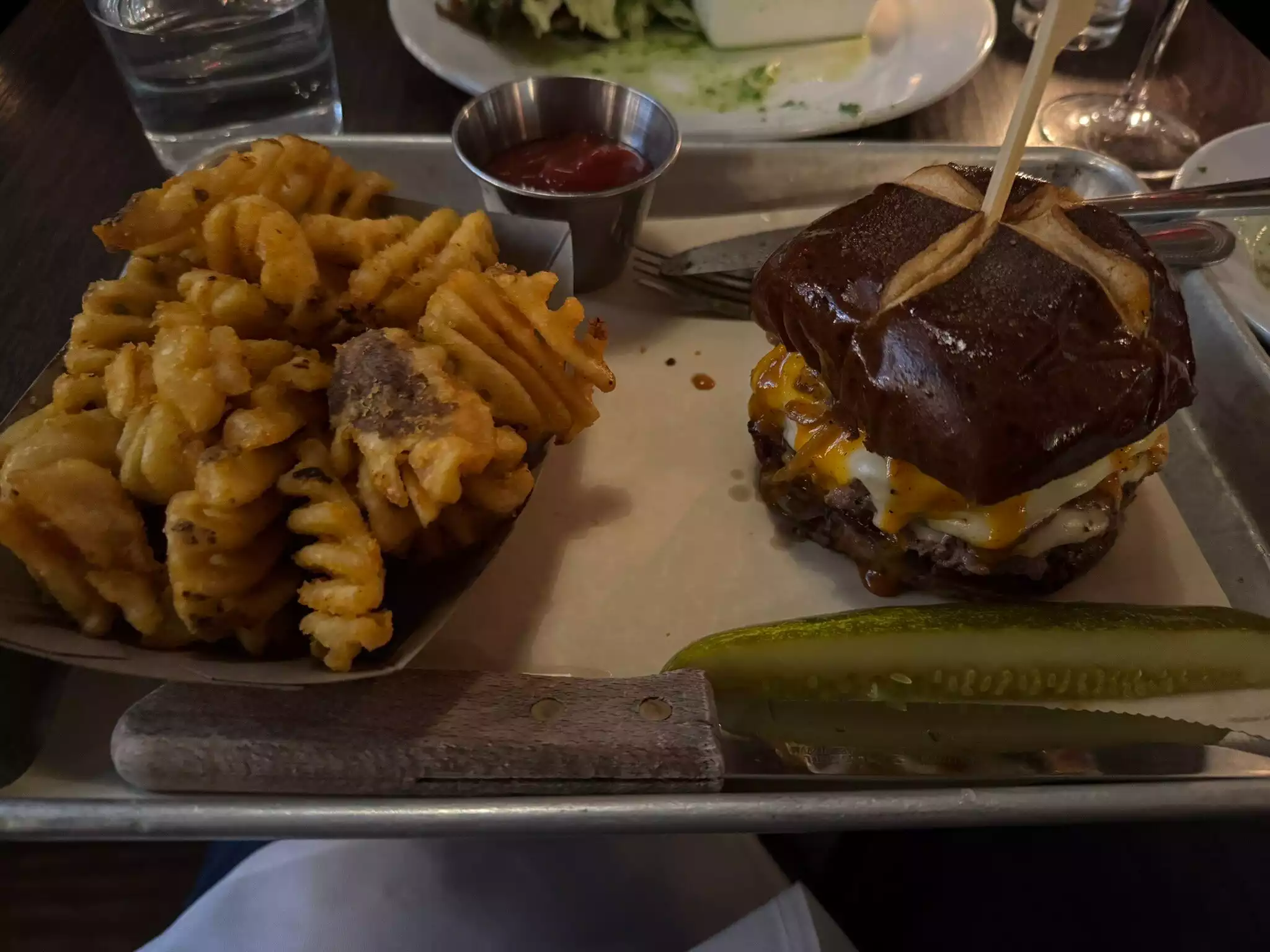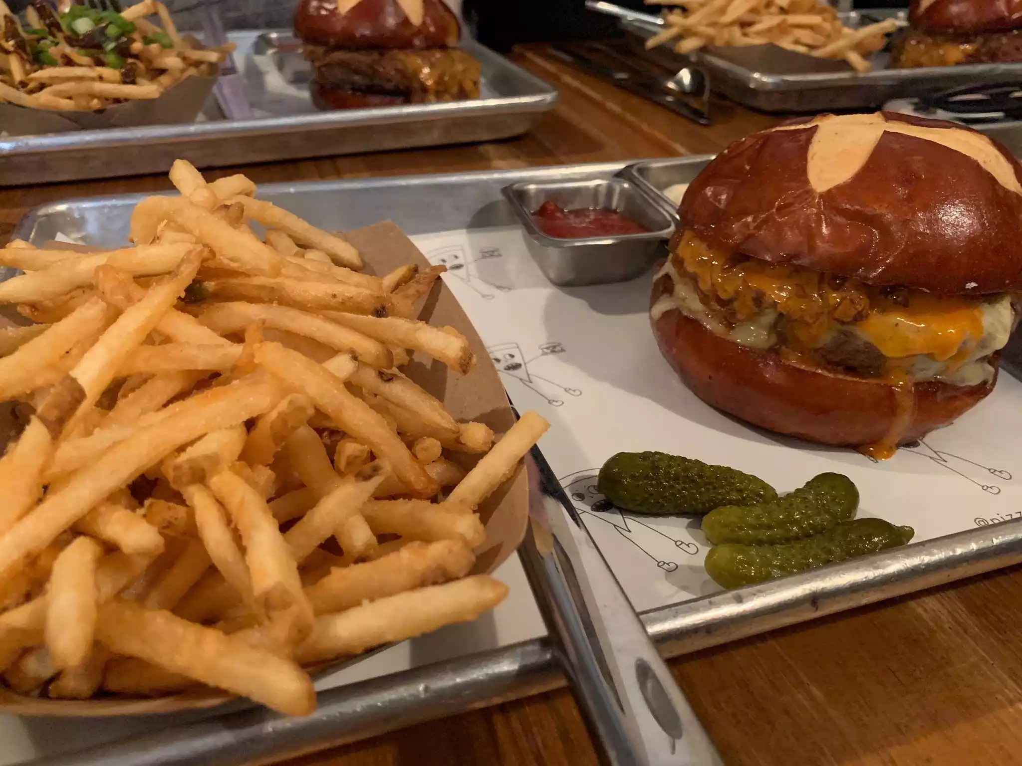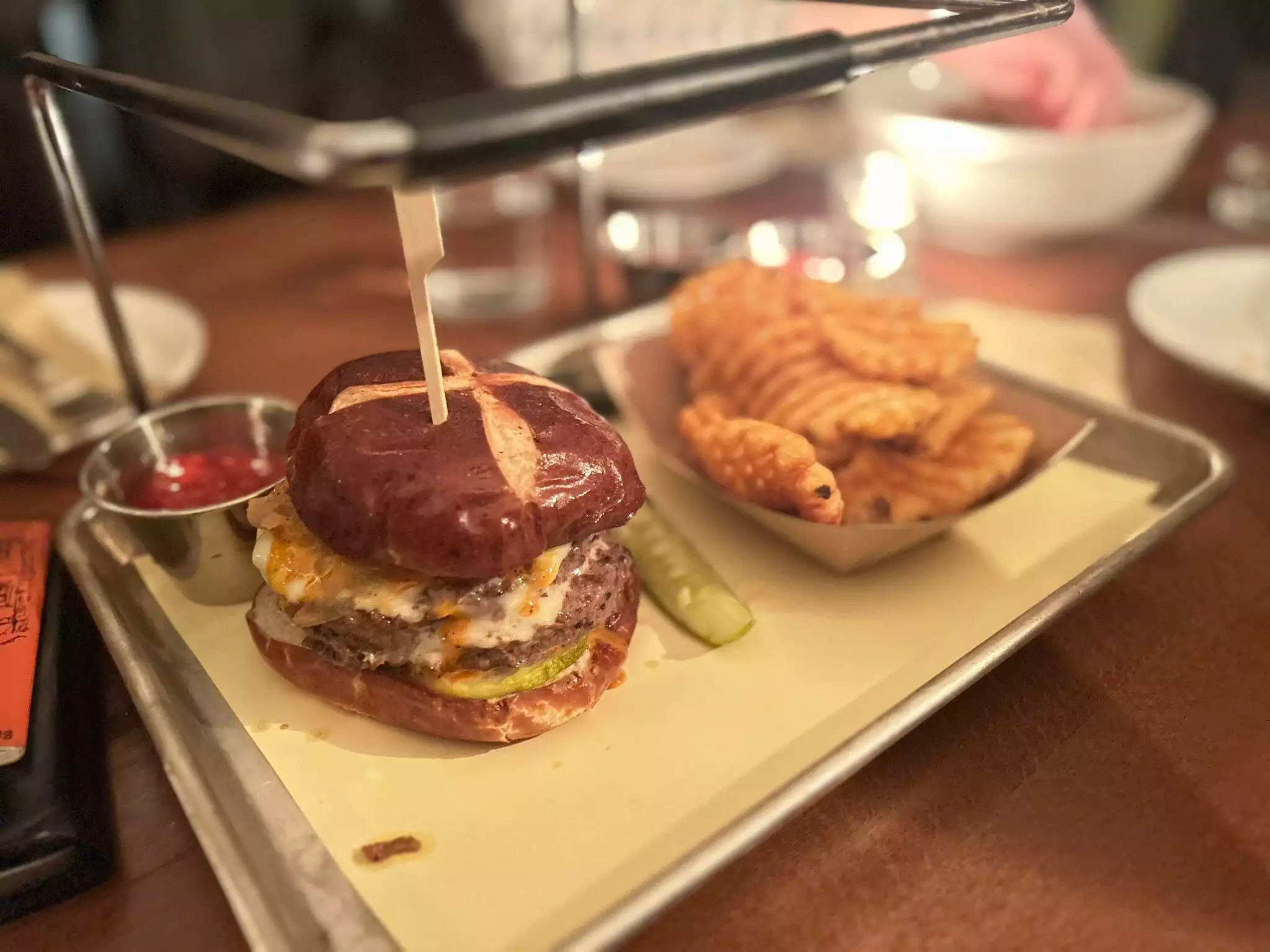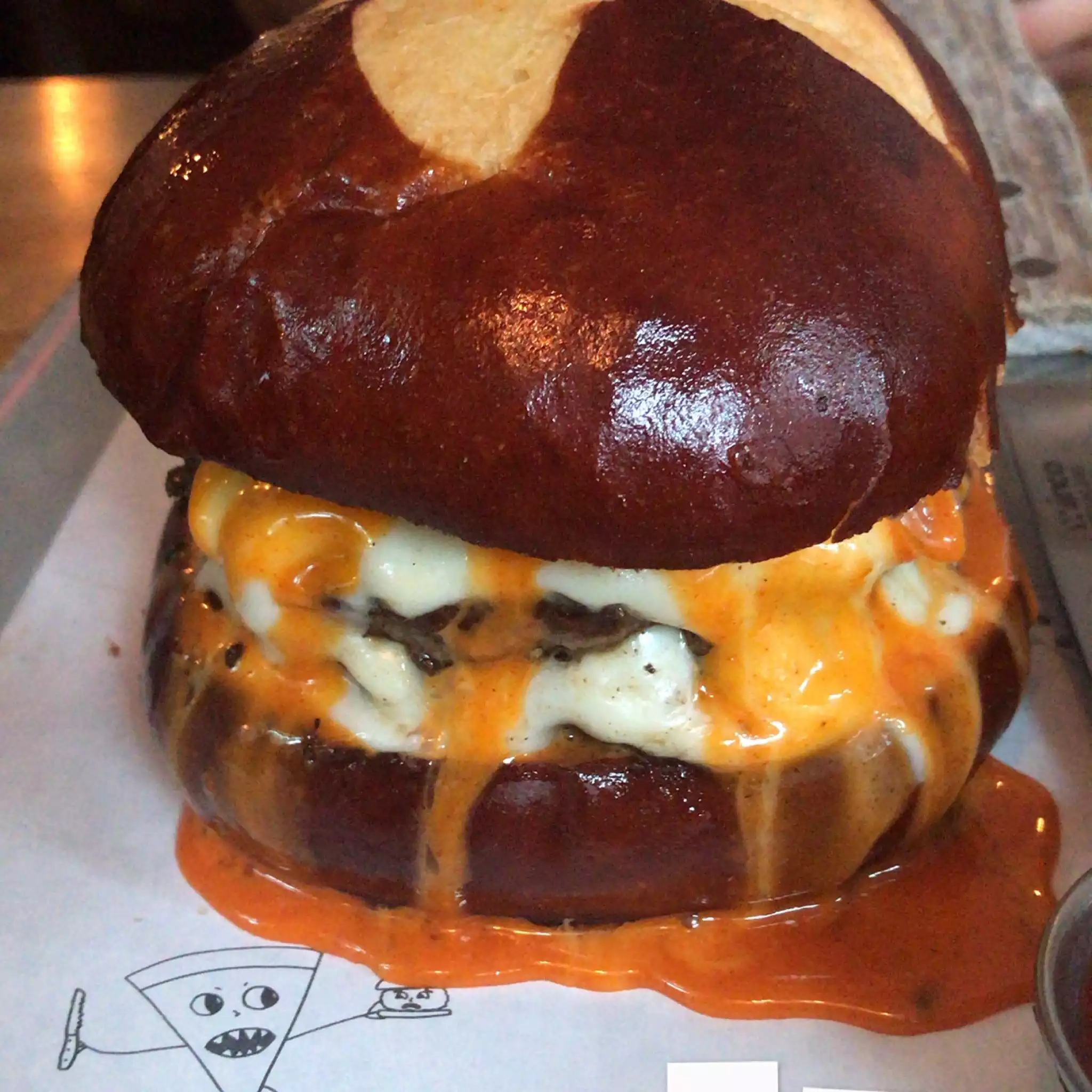Had a family dinner here in January. We made a reservation, showed up a little early and the host was kind enough to seat us. The restaurant has two levels - both small. The main level is windowed with a small bar that gives the vibe its for eating not for drinking, the lower level - a little dungeon like but cool looking - dark and bricked with a small room for private parties. It’s worth noting there was no cell or wifi svc down stairs which is an issue if need connectivity. The waitress declined to share the wifi password. We didn’t press. The place is known for their hamburger - a double patty with cheese and onions and their sauce on a pretzel bun served with waffle fries. Burger was very filling. Taste was good - not the best I’ve had. I felt it was over- oniony, over cooked (they didn’t ask about temp preference) and under-salted but overall was a good burger. Fries were very good. We shared some apps - cauliflower in chili sauce was meh. My dinner companions shared a couple of pizzas - both gluten free. Was a relatively thick crust square pizza (Detroit style? Sicilian?) . Reviews were good and for me, a gluten eater I felt was a pretty good pizza. Drinks were good. I was a little ticked they up charged me for an old fashioned. The one on the cocktail special menu was $15 they charged be $17. They were out of the bourbon they use on the cocktail menu. I subbed makers. Clearly not top shelf and the substitution wasn’t my fault. I feel a $2 money grab just brings down the experience. Worthwhile place to go though. Young crowd and with good energy. Would recommend.