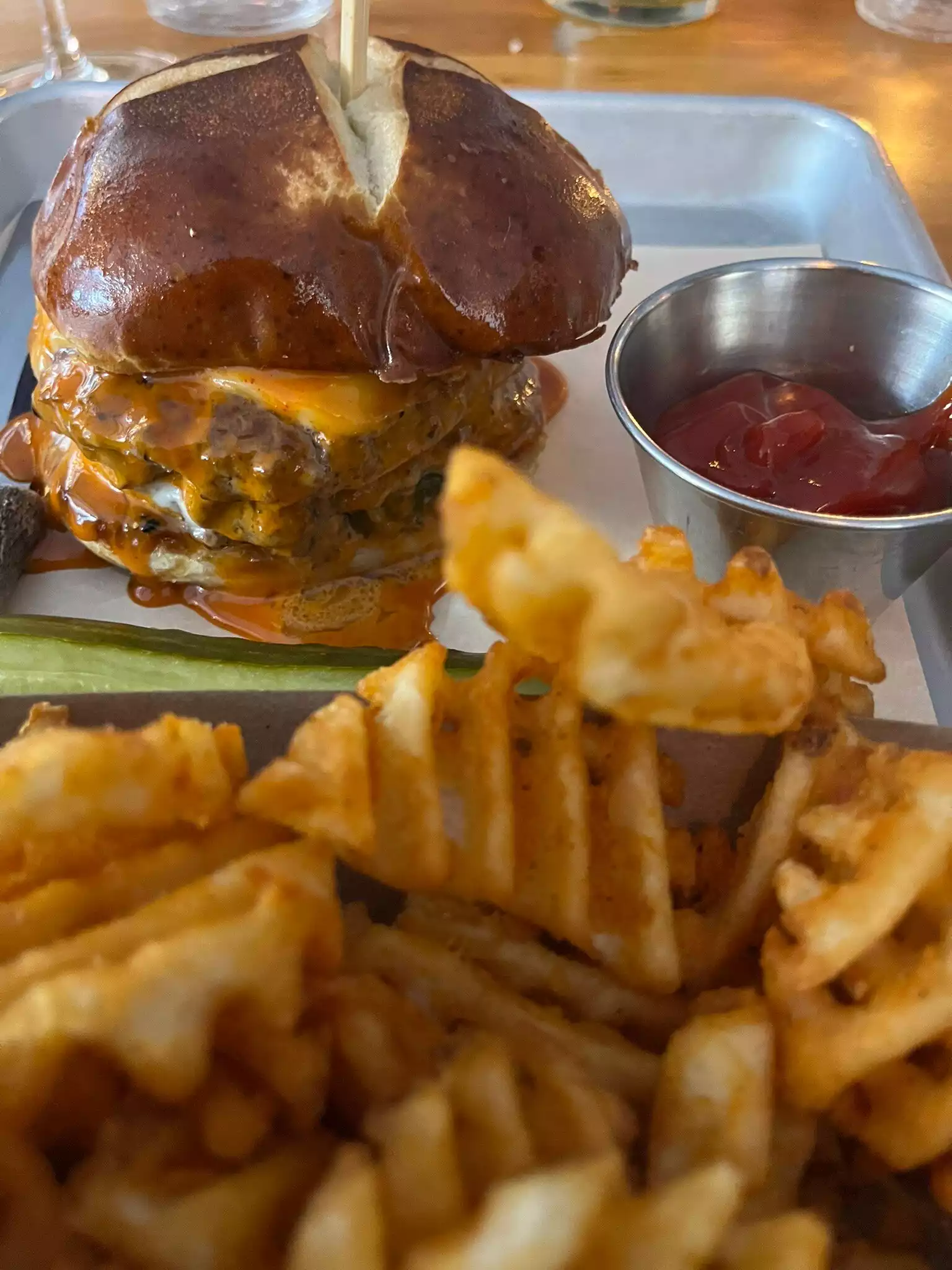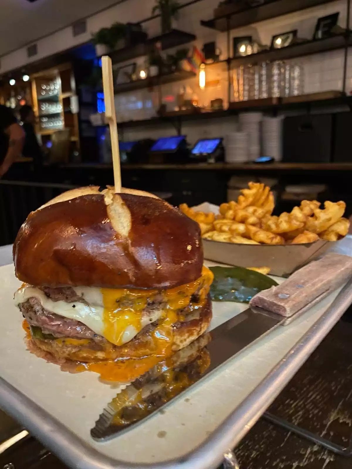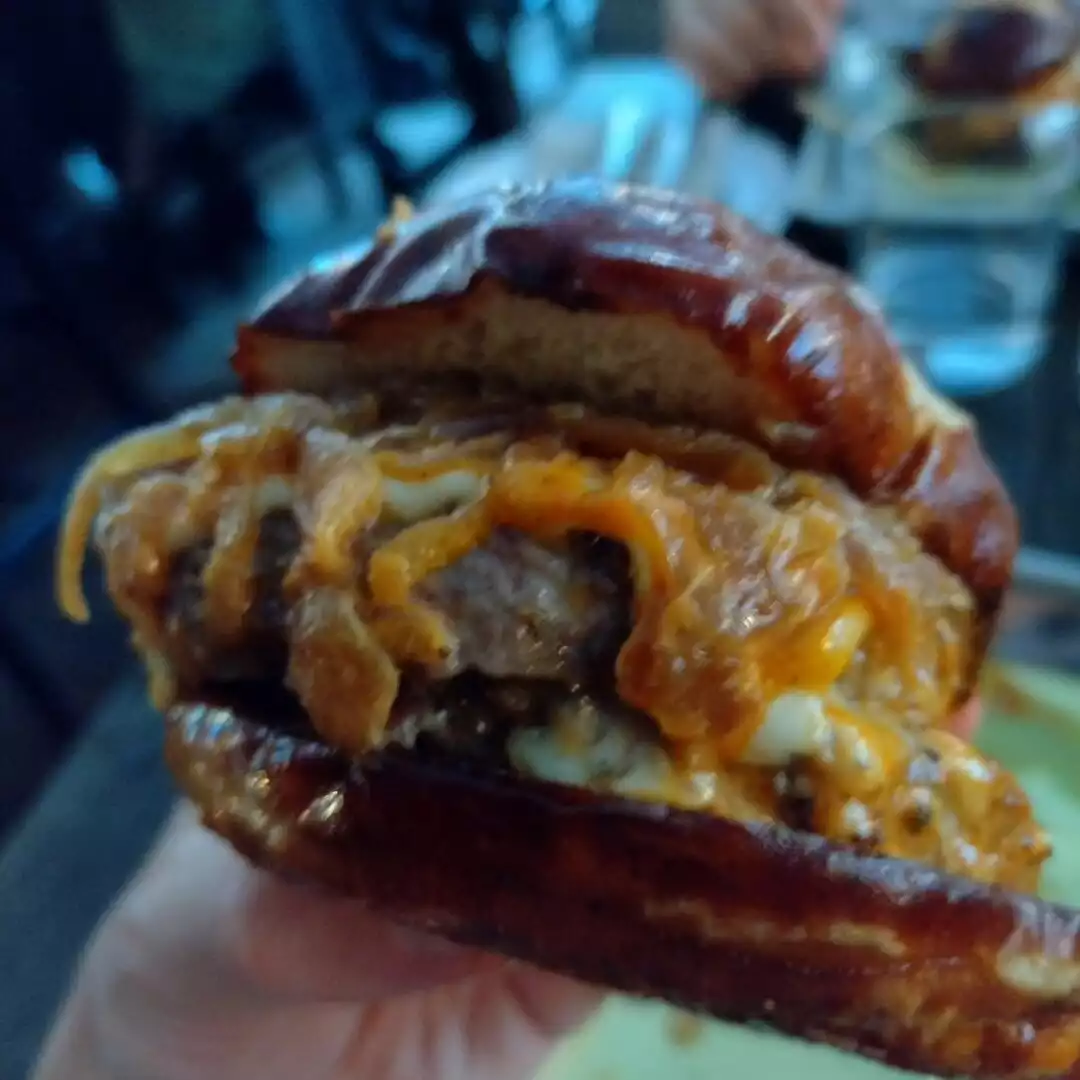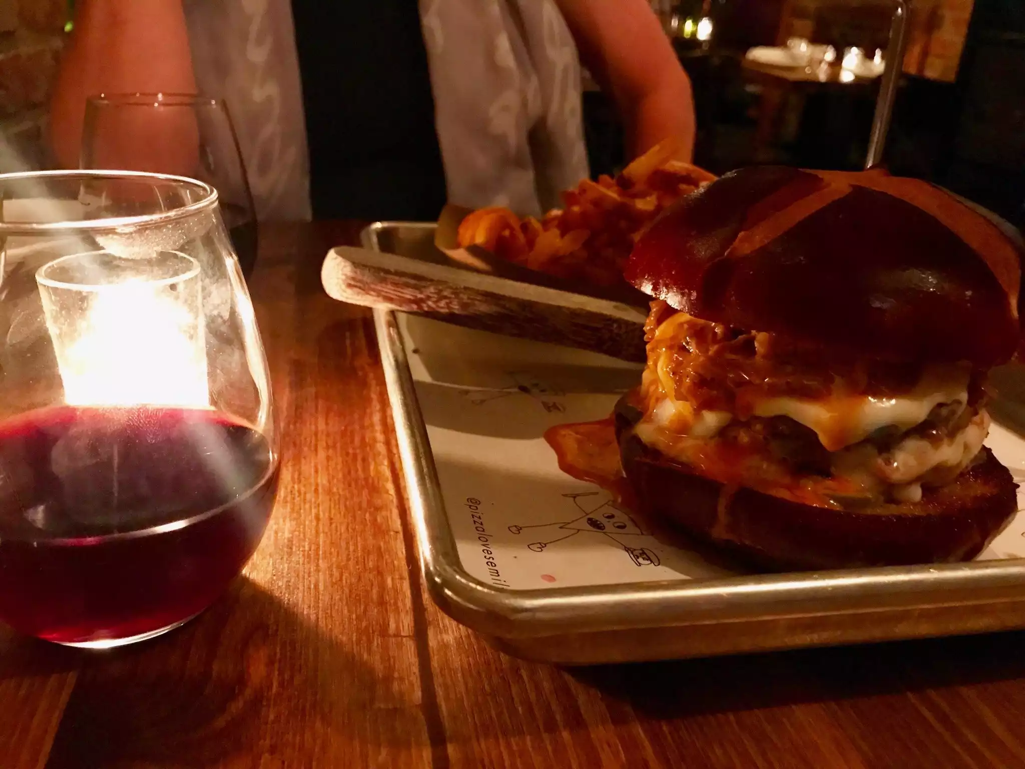 Had a family dinner here in January. We made a reservation, showed up a little early and the host was kind enough to seat us. The restaurant has two levels - both small. The main level is windowed with a small bar that gives the vibe its for eating not for drinking, the lower level - a little dungeon like but cool looking - dark and bricked with a small room for private parties. It’s worth noting there was no cell or wifi svc down stairs which is an issue if need connectivity. The waitress declined to share the wifi password. We didn’t press. The place is known for their hamburger - a double patty with cheese and onions and their sauce on a pretzel bun served with waffle fries. Burger was very filling. Taste was good - not the best I’ve had. I felt it was over- oniony, over cooked (they didn’t ask about temp preference) and under-salted but overall was a good burger. Fries were very good. We shared some apps - cauliflower in chili sauce was meh. My dinner companions shared a couple of pizzas - both gluten free. Was a relatively thick crust square pizza (Detroit style? Sicilian?) . Reviews were good and for me, a gluten eater I felt was a pretty good pizza. Drinks were good. I was a little ticked they up charged me for an old fashioned. The one on the cocktail special menu was $15 they charged be $17. They were out of the bourbon they use on the cocktail menu. I subbed makers. Clearly not top shelf and the substitution wasn’t my fault. I feel a $2 money grab just brings down the experience. Worthwhile place to go though. Young crowd and with good energy. Would recommend.