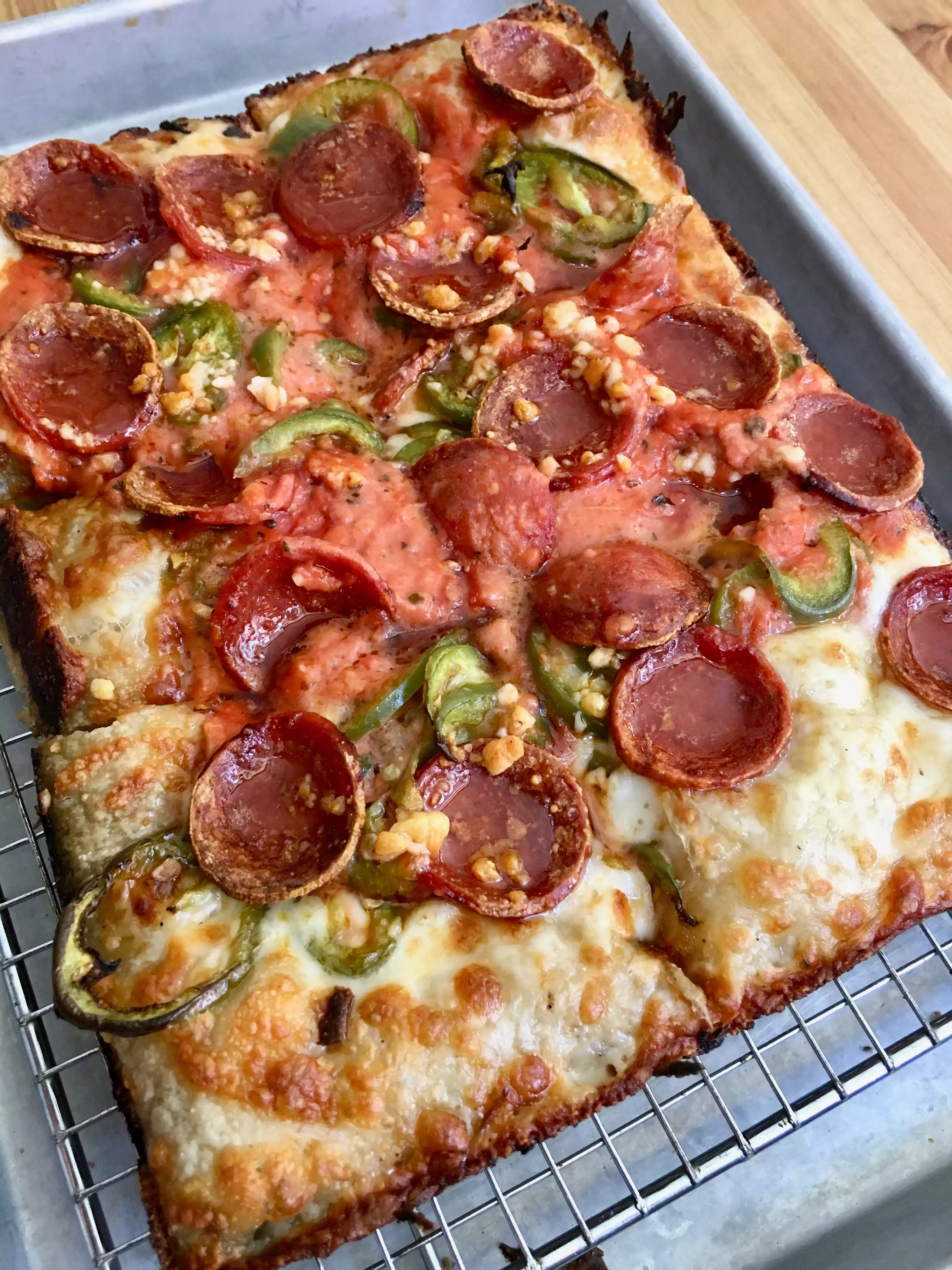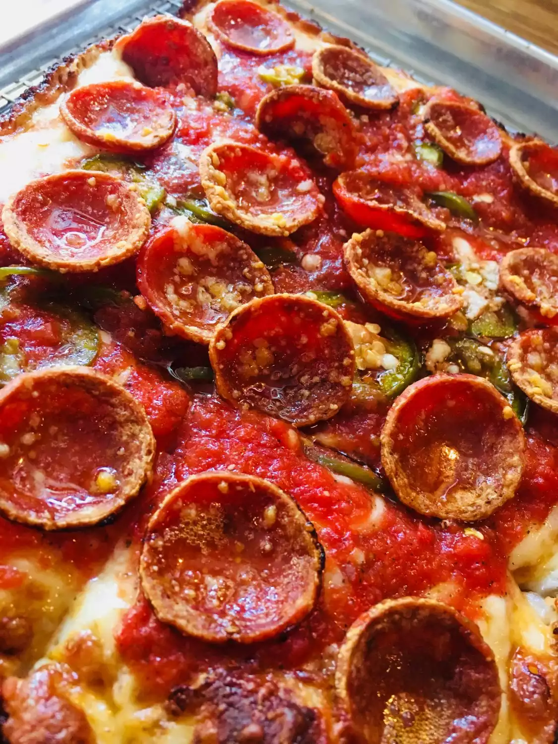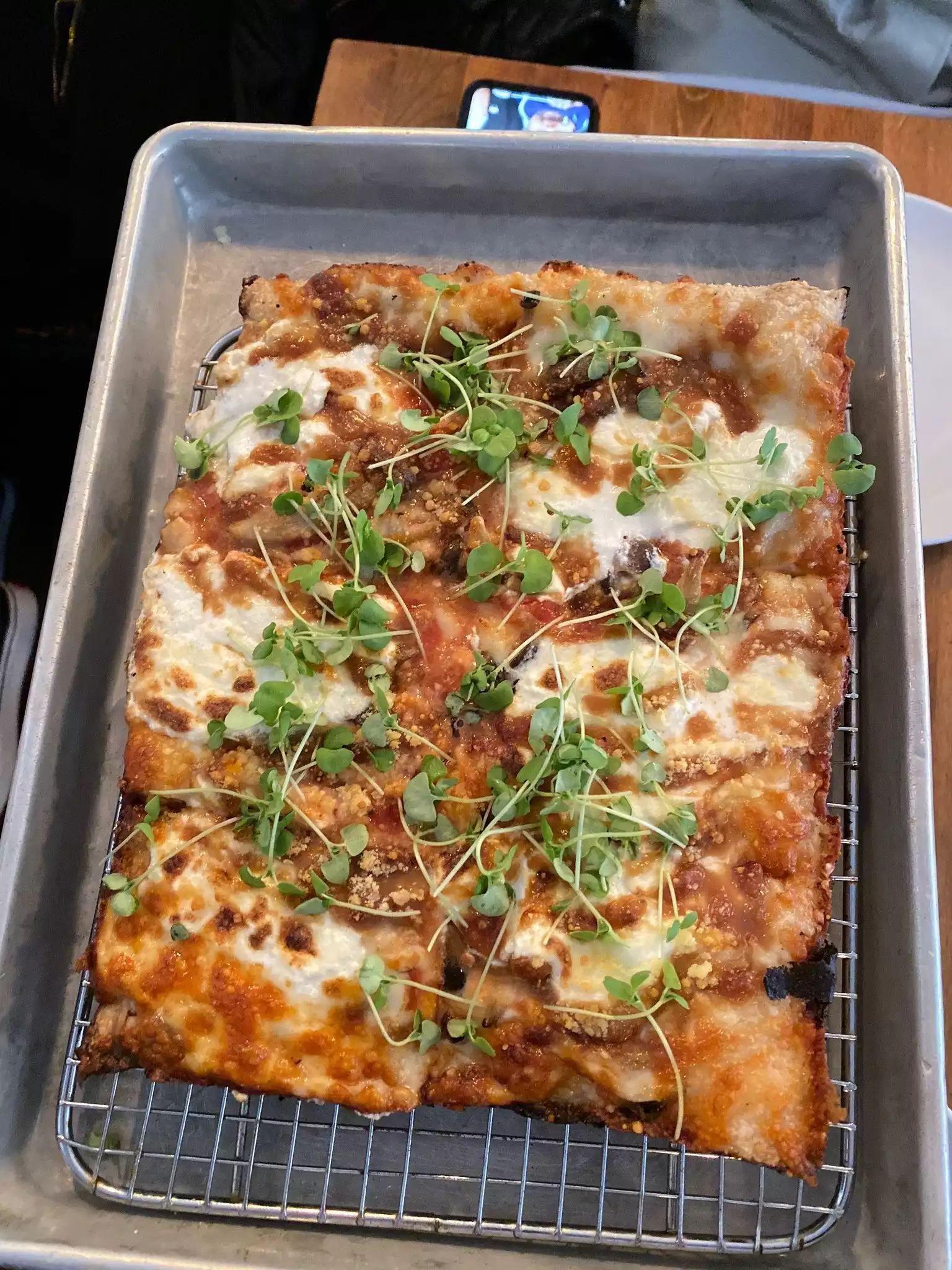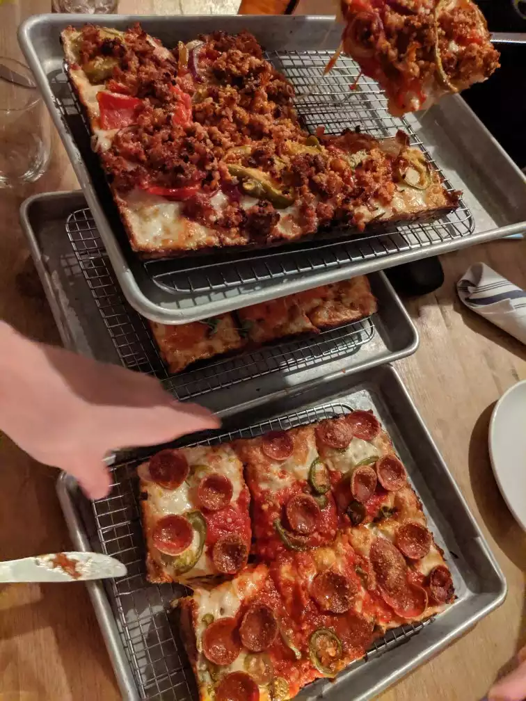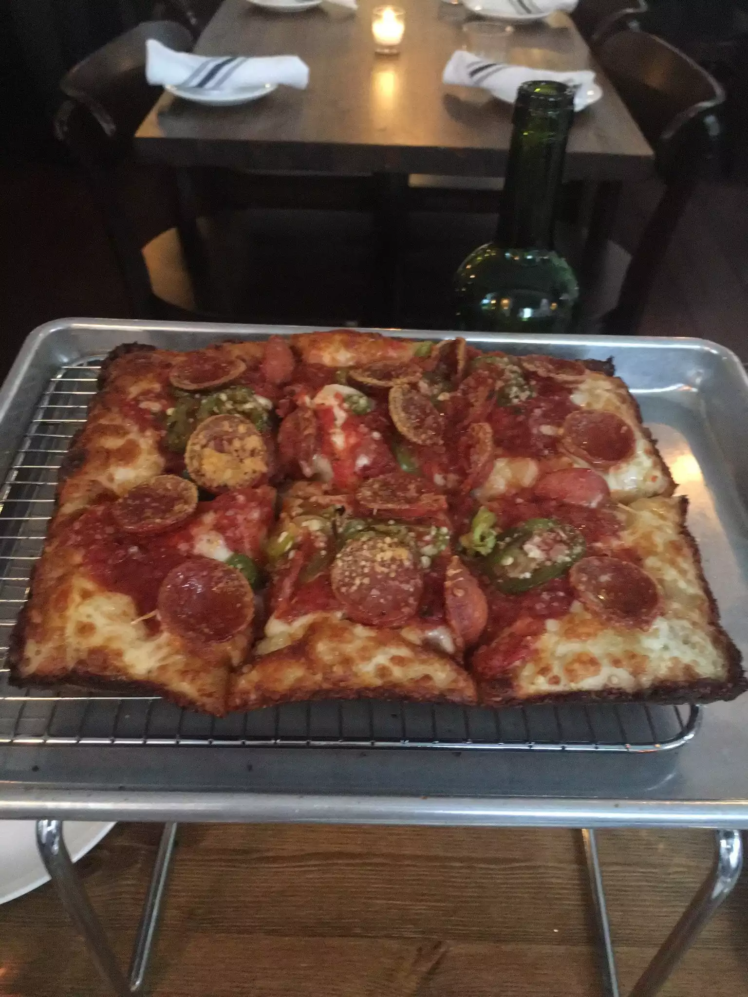 Gerard great things about this place. Looked online at the website and found that they had he normal Neapolitan pizza as well as well as Detroit style. We went hoping to tryin Detroit but the kids wanted the normal style. Apparently it’s now only Detroit style pizza which was a bit disappointing since on line the pictures of the other pizza looked phenomenal. Anyway had appetizers (fries are excellent) and there are other options on the menu including Burger which looked very good. Detroit style pizza was yummy but not for everyone. We loved the vodka sauce one as well as the spicy version.