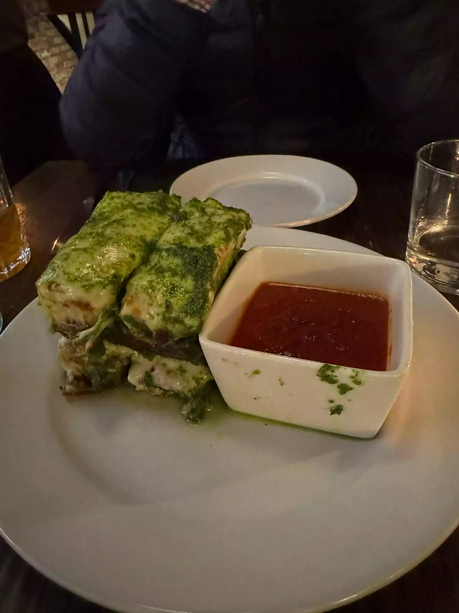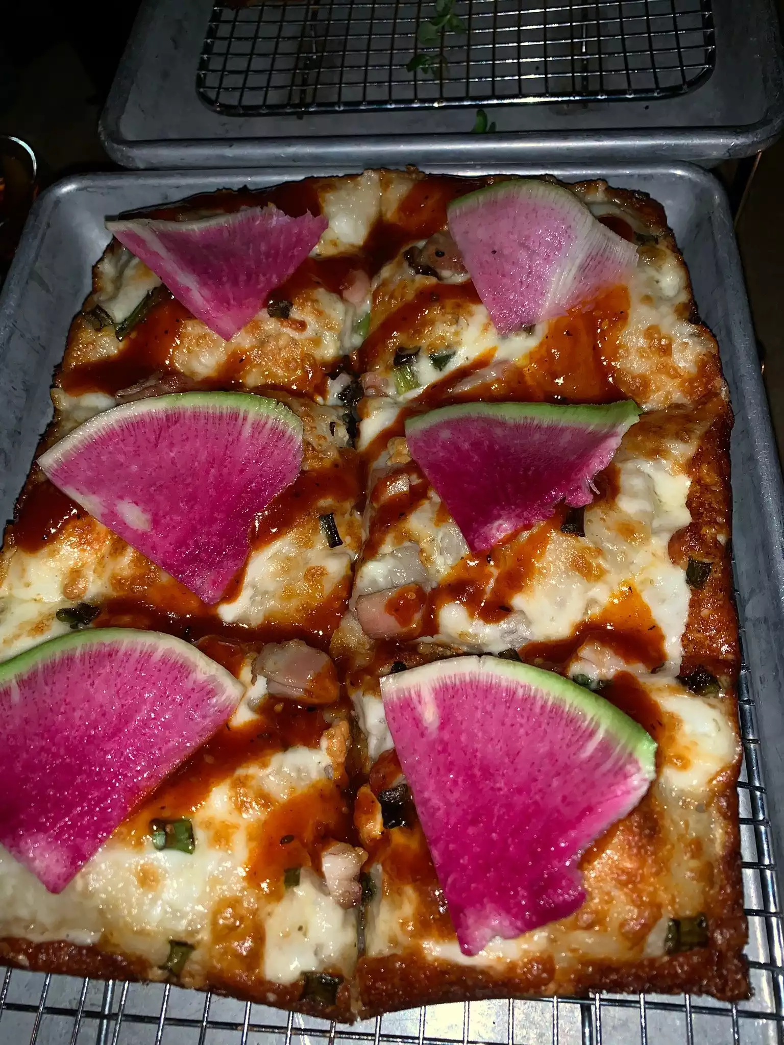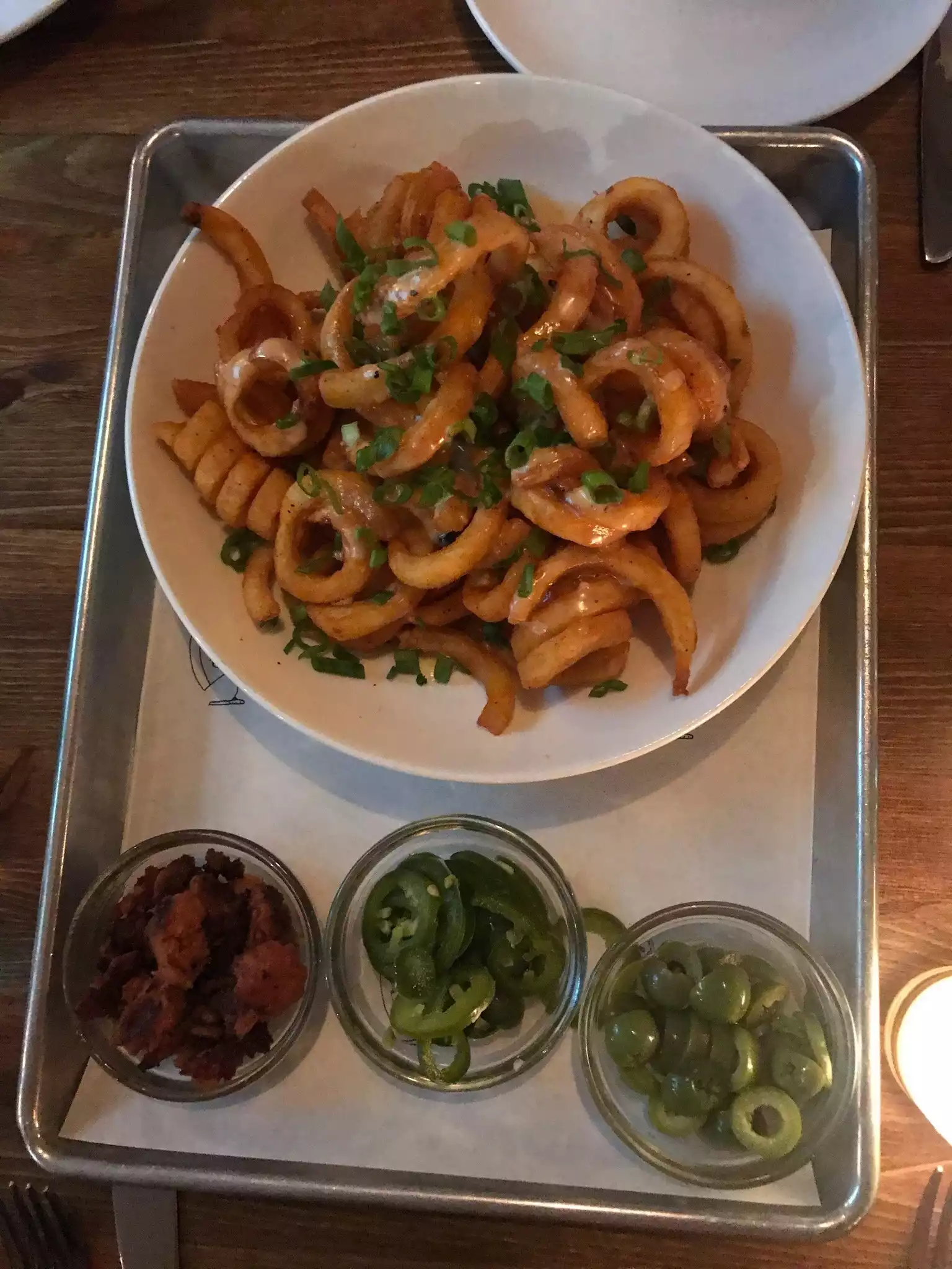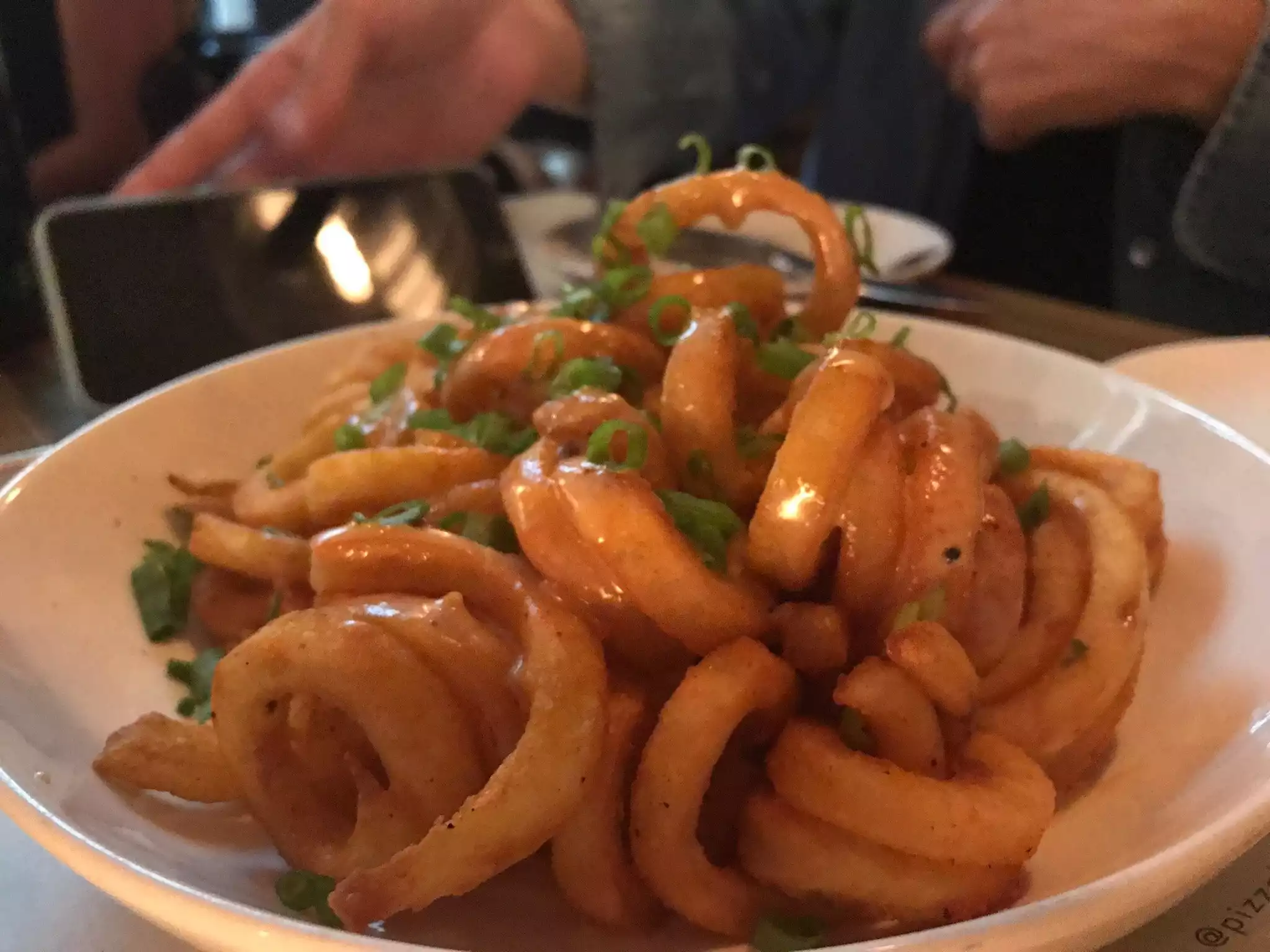 Gerard great things about this place. Looked online at the website and found that they had he normal Neapolitan pizza as well as well as Detroit style. We went hoping to tryin Detroit but the kids wanted the normal style. Apparently it’s now only Detroit style pizza which was a bit disappointing since on line the pictures of the other pizza looked phenomenal. Anyway had appetizers (fries are excellent) and there are other options on the menu including Burger which looked very good. Detroit style pizza was yummy but not for everyone. We loved the vodka sauce one as well as the spicy version.